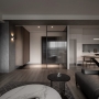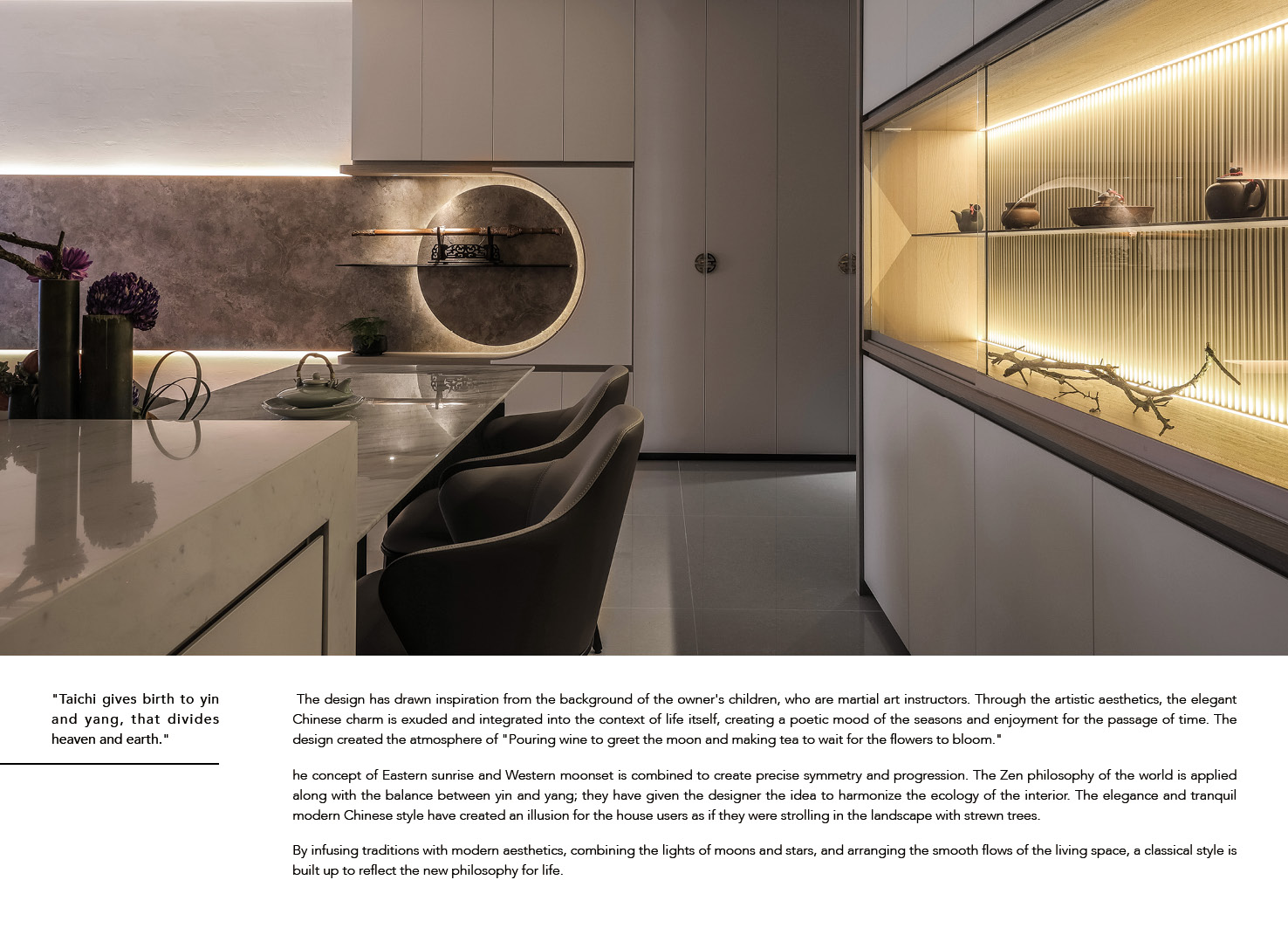 太極生兩儀,劃出陰陽,分出天地。設計概念來自於業主孩子武術教練的背景,透過藝術美學散發清謐典雅的中式韻味,融入生活本身的語境,營造「斟酒迎月上,泡茶等花開」四季如詩,靜享時光流淌之境。本次將日出東昇、月落西沉的概念結合,講究對稱,層層遞進,包羅世間萬象的禪學理念,以陰陽平衡概念調和室內生態,雅緻寧靜的新中式風格,使人居於屋內,亦彷彿漫步於樹木錯落的山水之中。以傳統融合現代美學敘事,通過日月星辰的光輝聚合和居家空間的流暢演繹,勾勒出古典風格的韻腳,折射新生活哲學的未來之境。古色的中式氛圍,不可缺少藝術品的點綴,為業主本身收藏的寶劍藝術品,在玄關與客廳過度的廊道間更顯東方韻律之美,結合中式特有的元素和精華體現出整體空間人文素養和文化底蘊氣象。