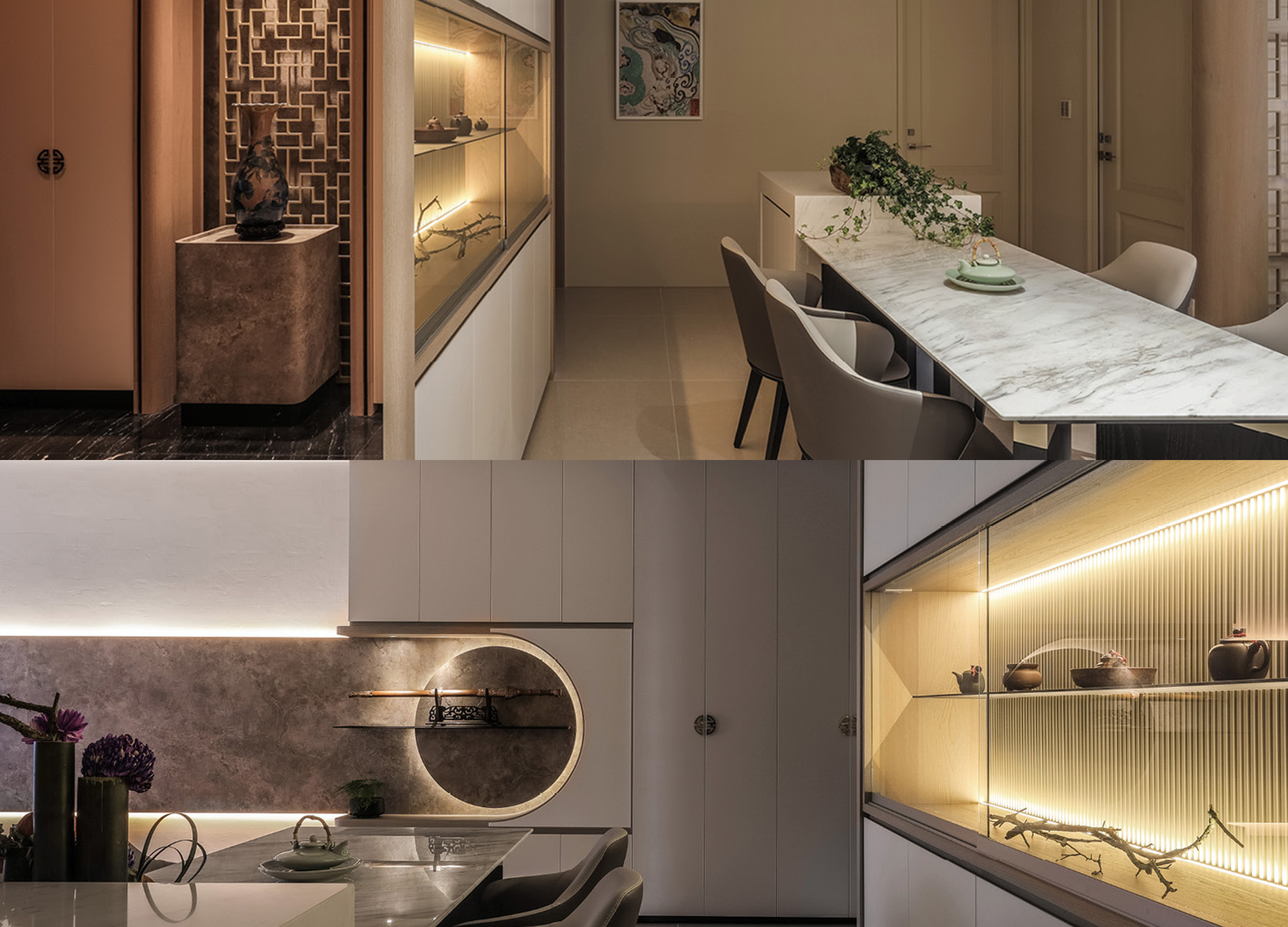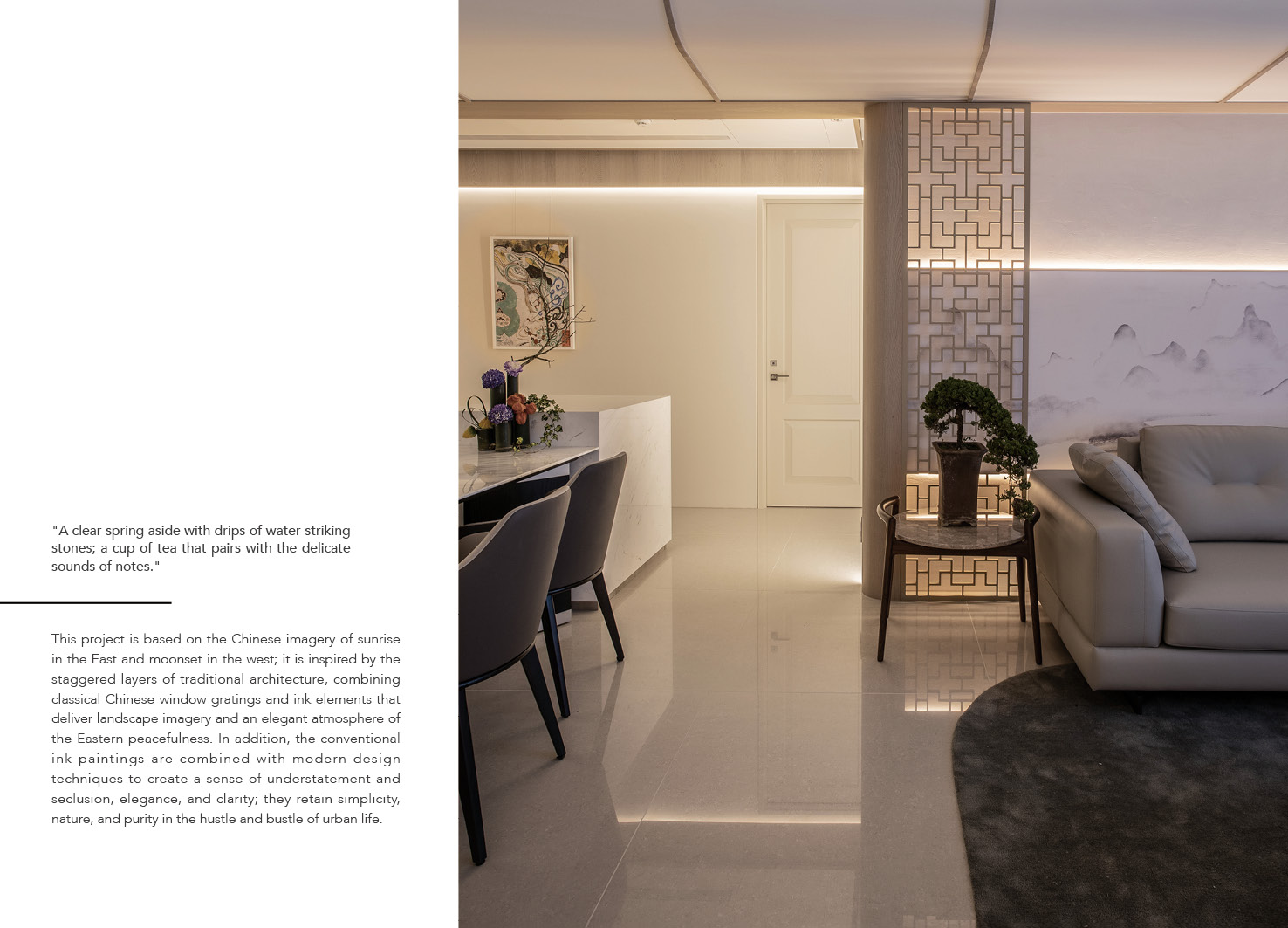 Through the artistic aesthetics, the elegant Chinese charm is exuded and integrated into the context of life itself, creating a poetic mood of the seasons and enjoyment for the passage of time. The concept of Eastern sunrise and Western moonset is combined to create precise symmetry and progression. The ancient Chinese vibe could not be completed without artwork. The owner owns antique sword collections used to decorate the hallway between the entryway and the living room; the arts added a sense of Eastern beauty. Combining the uniquely Chinese elements and essences have embodied an overall space full of humanistic qualities.
