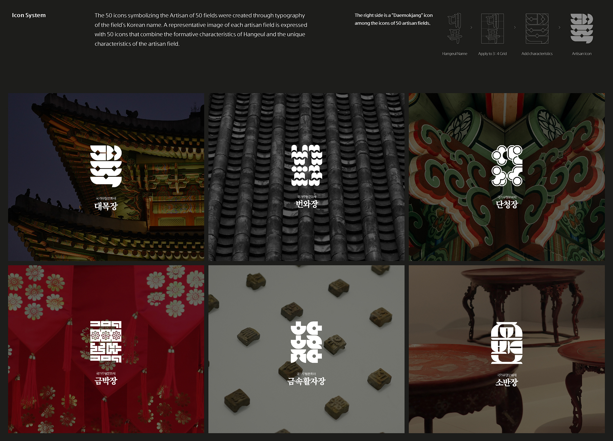 Artisans registered as National Intangible Cultural Heritage are working to maintain and develop traditional culture. However, in Korea, the number of artisan is decreasing due to low awareness and interest in them. 'Jangin-Myeongye-Surok' is a project to visualizes 50 fields of artisan so that people can be interested in the existence and efforts of artisans and remember them. In this project, the icons using Hangeul typograpy made by combining artisan’s names with characters show the name and identity of each artisan. Through this project, people can see what kind of artisans there are, and it is easy to understand what skills they have.