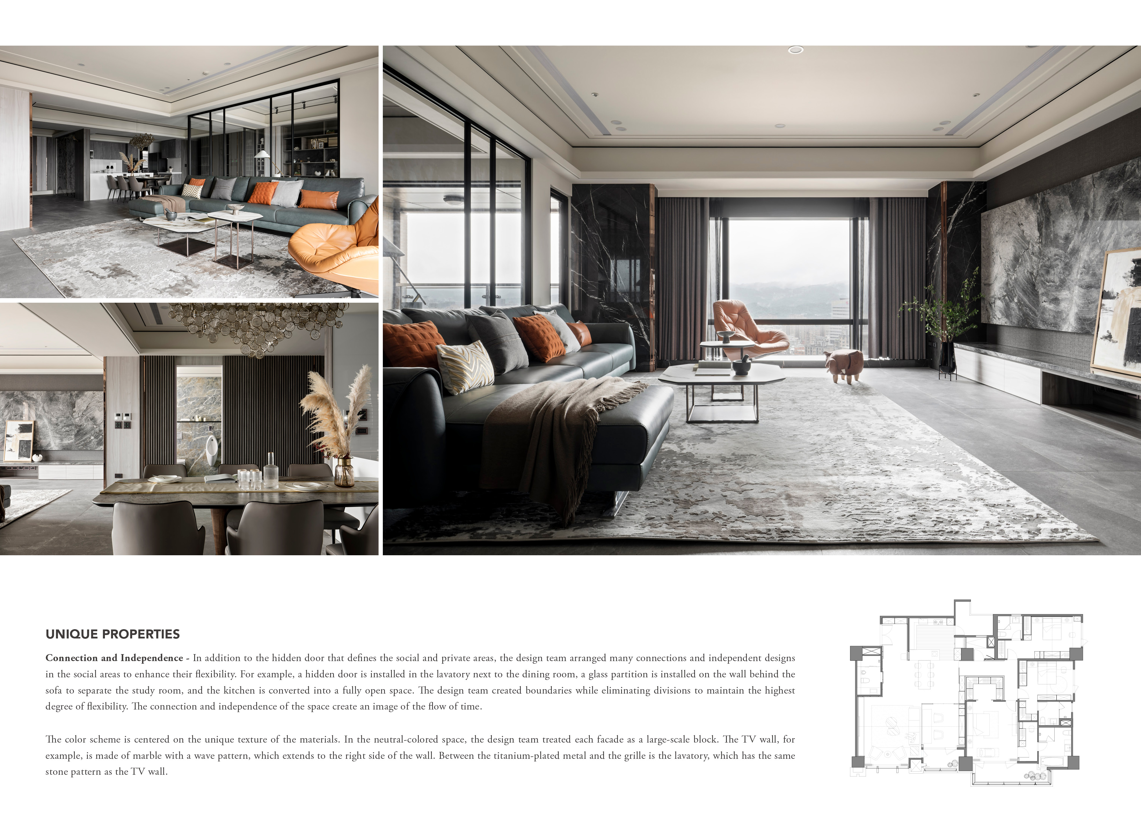 輕輕推開門扇,一個舒適忘憂的住宅呈現於眼前,作品取名為「時光流轉」,寓意希望當使用者回到家時,可以全然地享受生活,忘乎時間,作品根據業主的喜好與機能需求安排空間,喜愛公私領域分開的調性,因此設計端在格局安排上打造出「獨立」且「連結」的設計主軸。