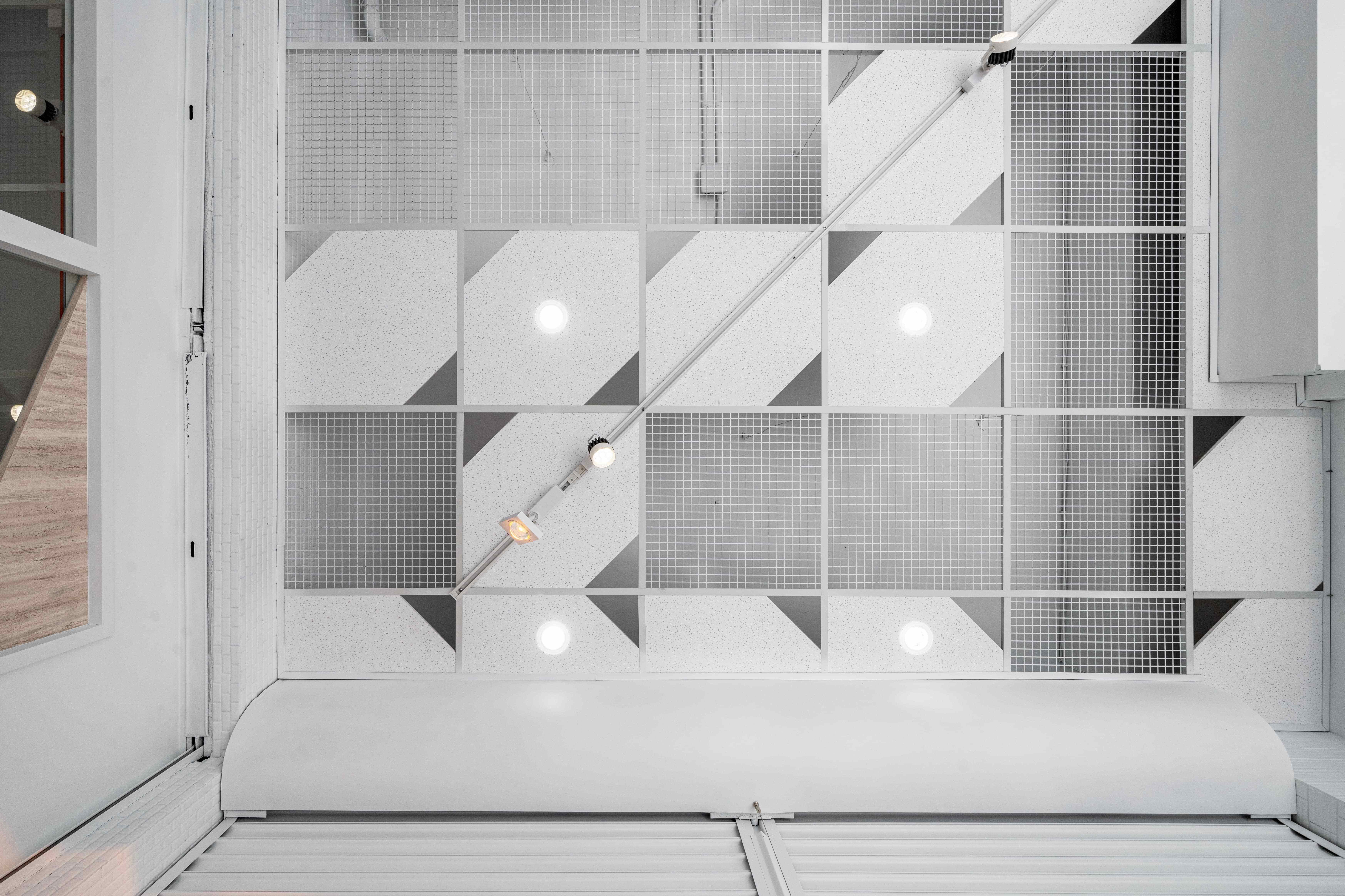 Vibrant track lights cast a warm glow like the twilight sun, softening the clouds beneath the wooden boards, while the right amount of terrazzo adds a touch of trendy atmosphere.
