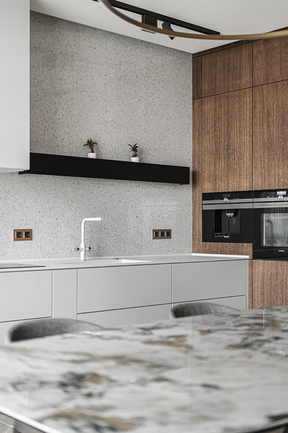 The design of the young family apartment combines functional comfort and harmony inherent in everything natural. Designer Katerina Churina created an unobtrusive, but at the same time contrasting interior in gray tones. It looks bright thanks to natural materials and a combination of various textures.
