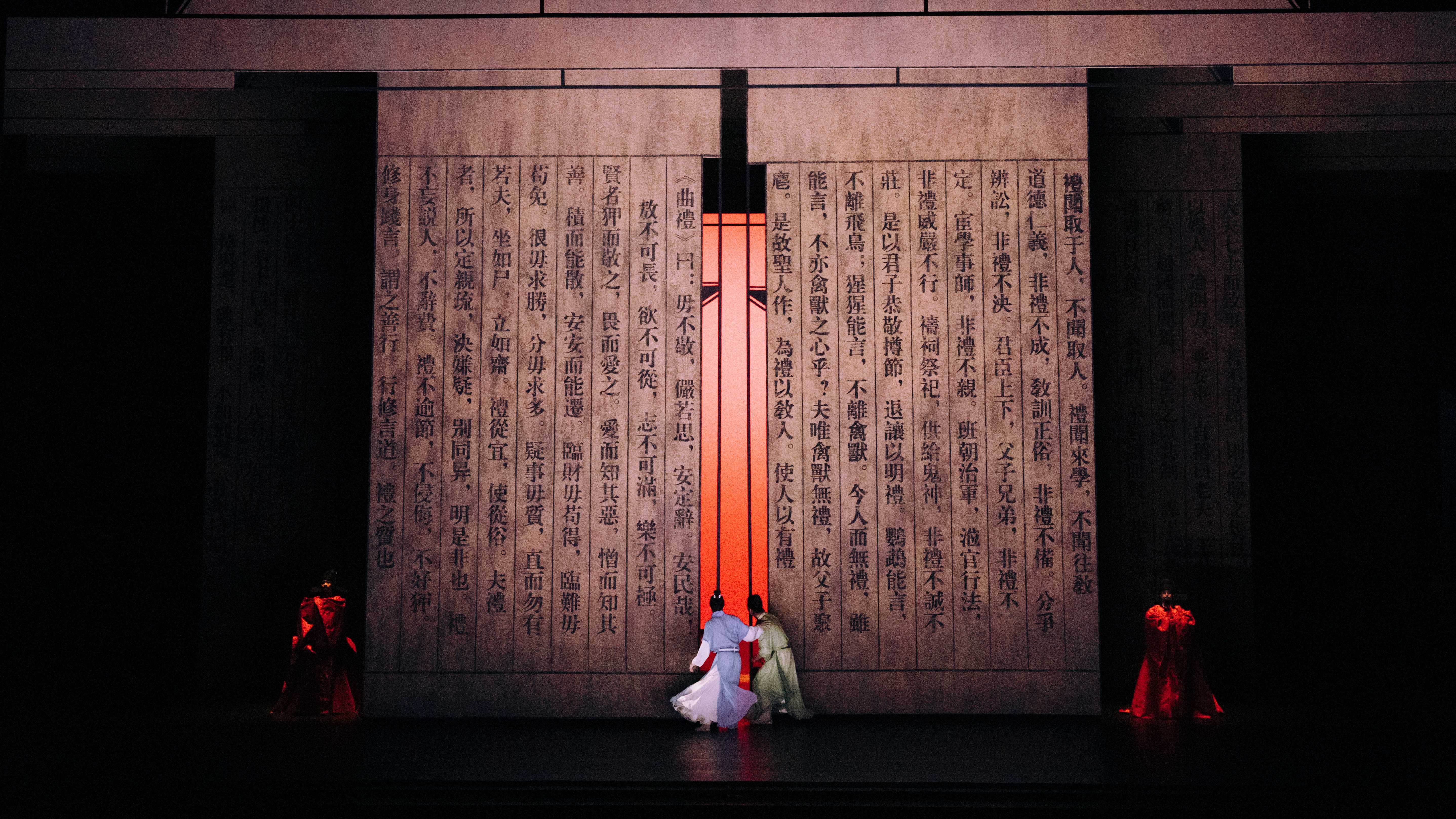 Through skillful movements, blockages, combinations, and separations, a visually stunning space (full of metaphorical meaning) is created, shich provides strong support for the actors' performances. Inspired by Eastern aesthetics, the stage design evolves from "a blank page", "a line of text" to "a piece of painting," that weave together the visual language of the performance and ultimately form a grand book. In the final scene, a ship carrying the book, “The Creation of Heaven and Earth”, symbolizing the journey of Ming Dynasty science and culture setting sail to the wider world stage.