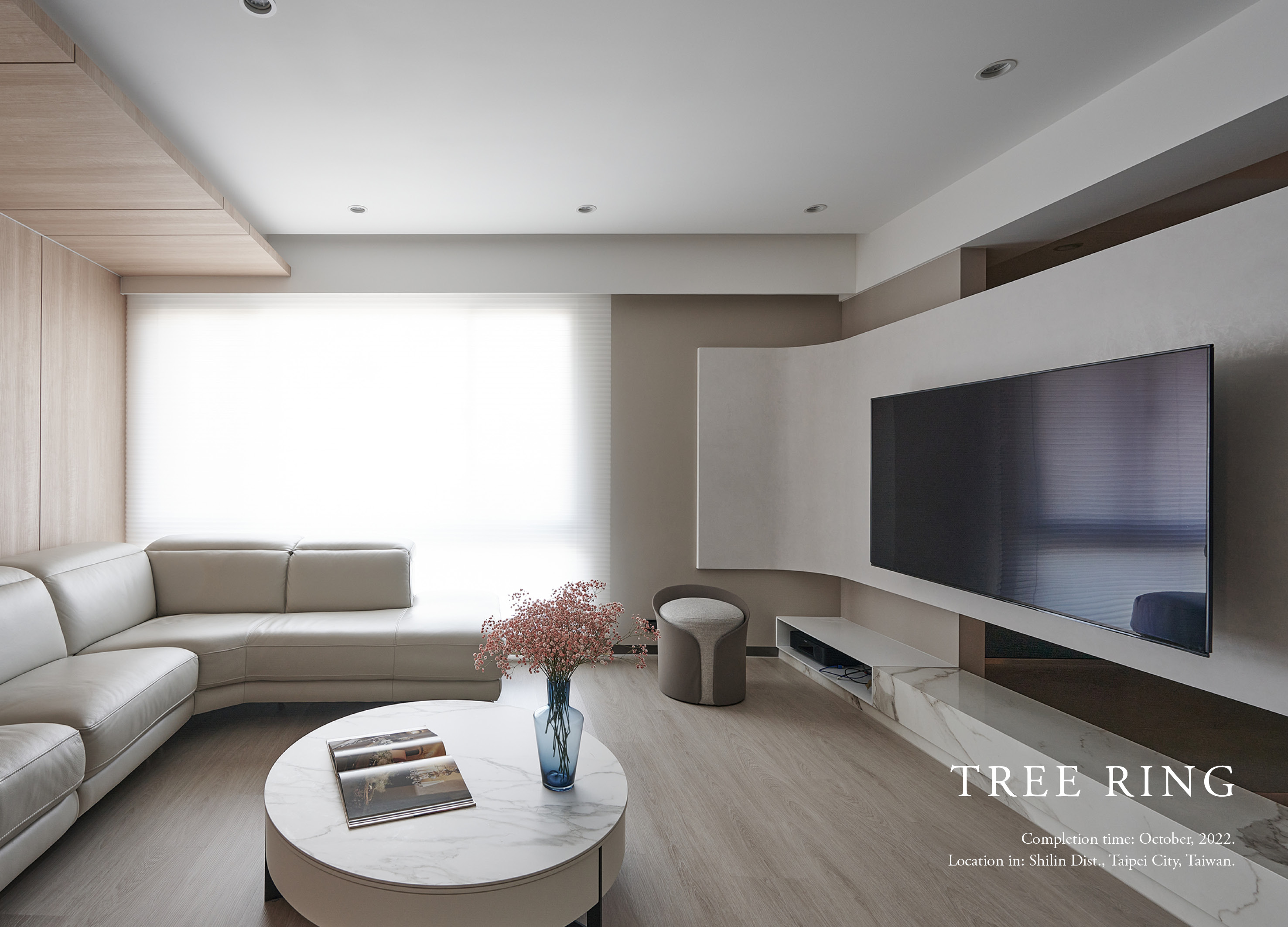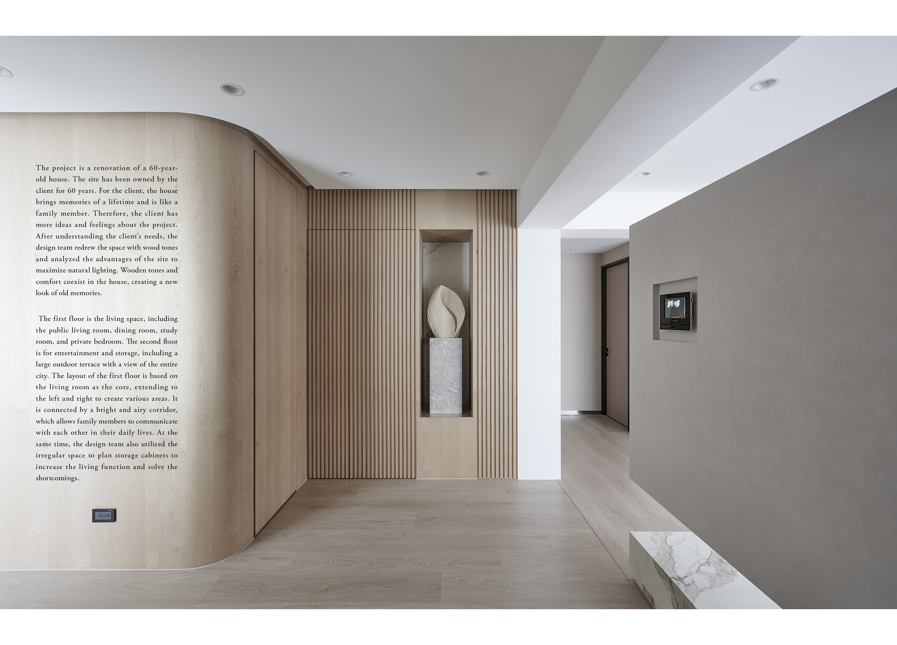本作品取名為「比木韶光」,源自於空間對於業主的非凡意義,此案擁有60年的歷史,是業主從小到大生活的環境,業主希望空間保有清新的木質調,以及寬敞舒適的動線。