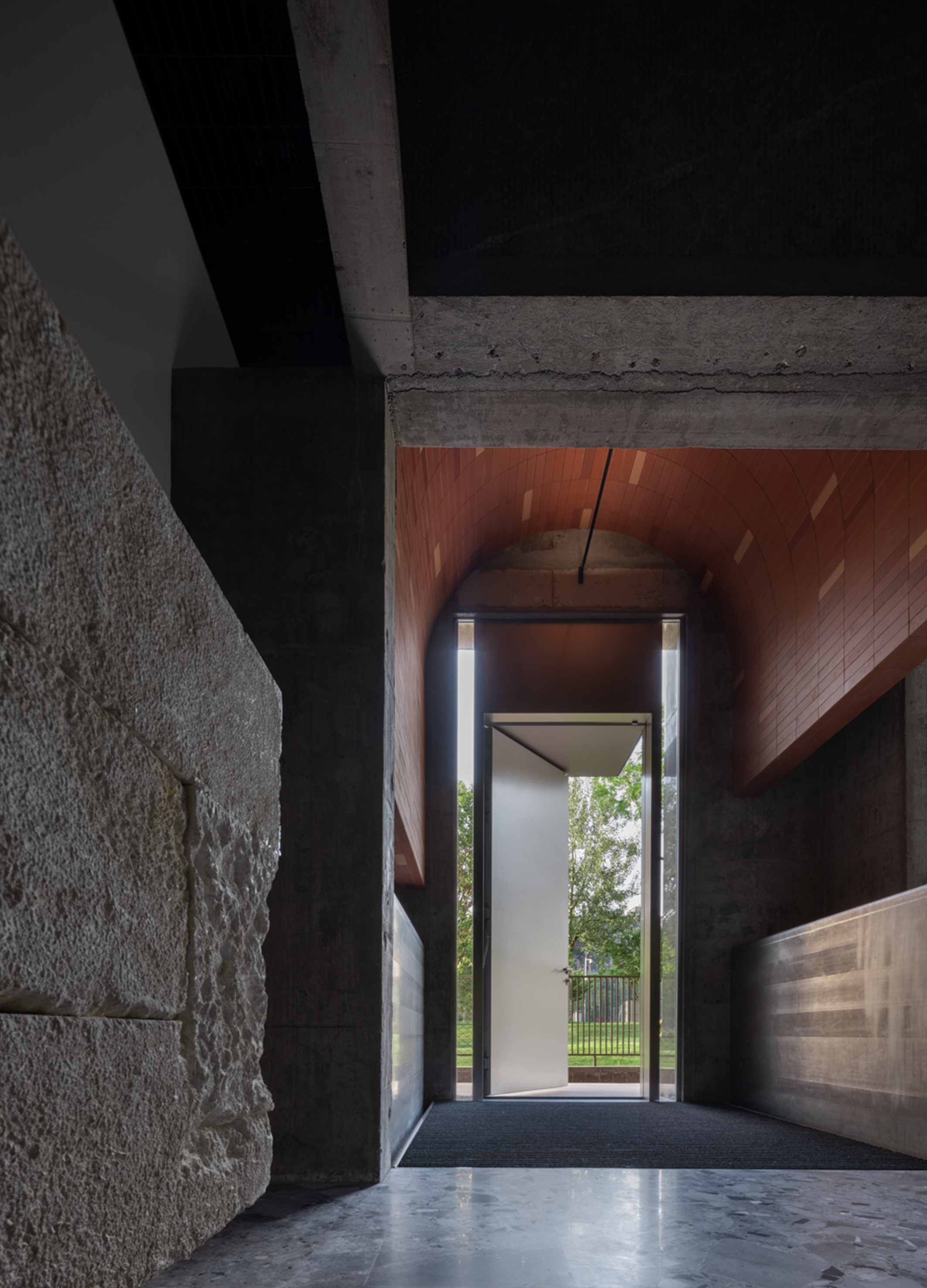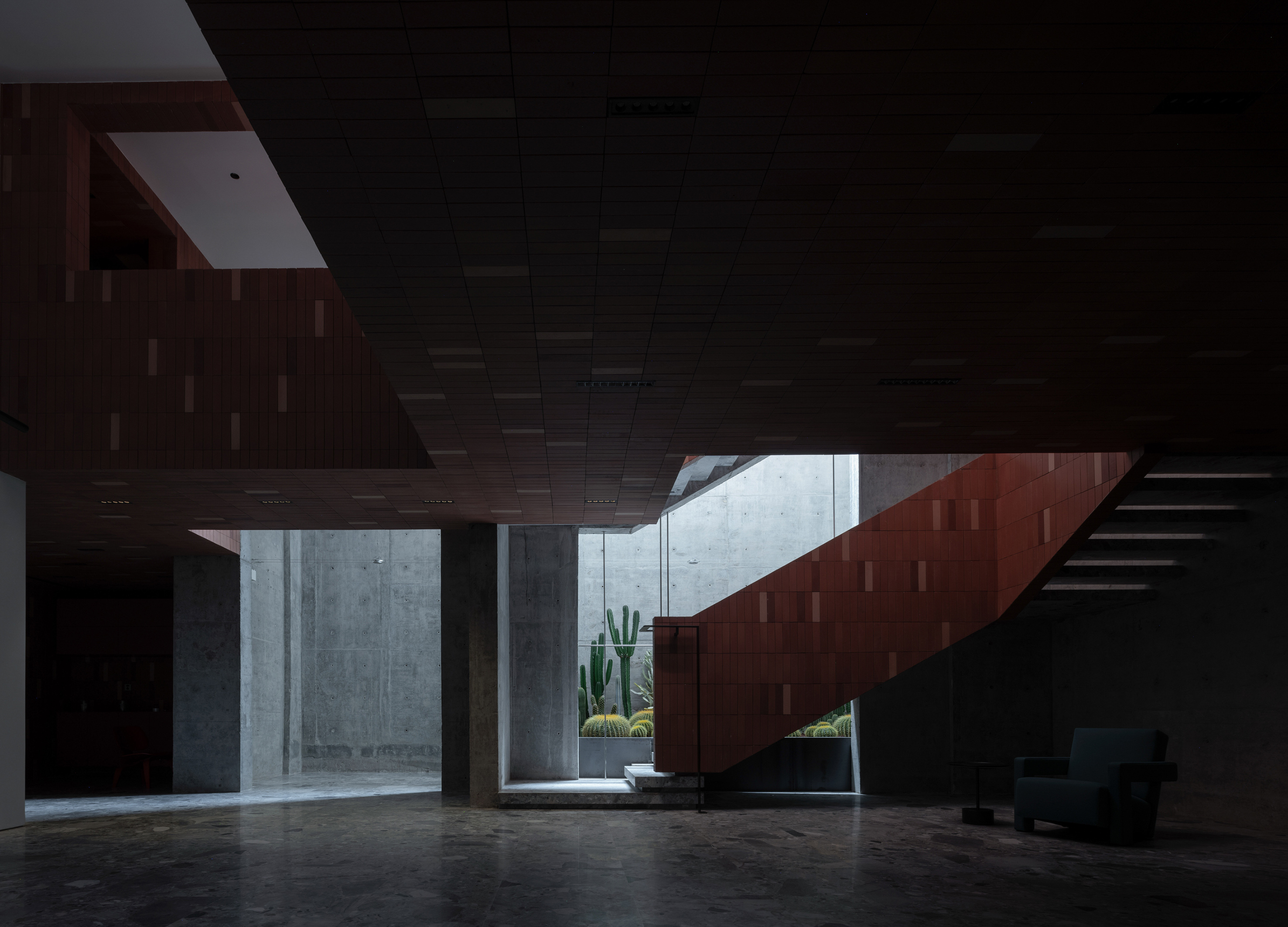 楼梯的重新设计不只是连接不同层面的工具,它自身成为了一种视觉和体验的焦点,引领使用者感受每一层的独特氛围。环保材料的应用,如回收铝的顶层吊顶,和楼梯间的再生红砖,不仅呼应了可持续设计的理念,也成为了讲述建筑故事的载体。