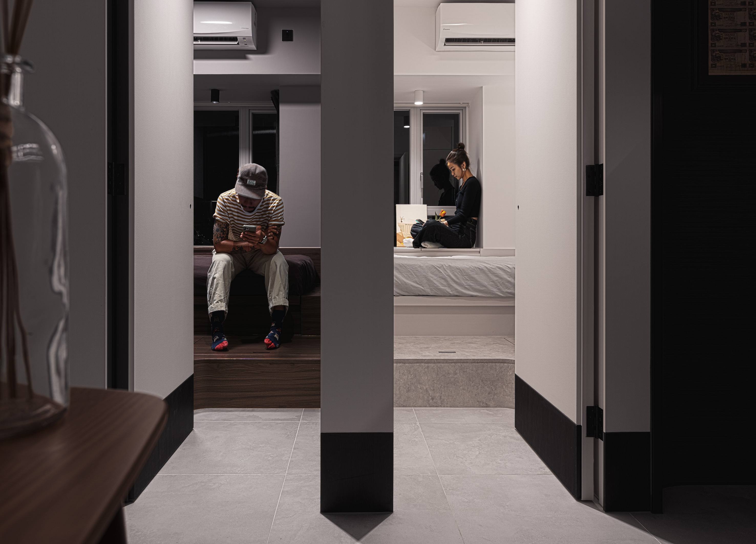 下班後 ,總想找個平靜的空間放鬆一下,把那些塞滿工作事項的思緒暫時拋開 。回到家中 ,黑色的玄關連同開放式廚房 ,感覺如同走進了另一個維度 ,淨化了思緒 ,過濾了疲倦 。再走入一點 ,瞬間又轉換到不同的空間 ,溫柔的白色主調讓人感到放鬆自在 。那幅水泥質感的特色牆配合柔和的光線 ,更營造了情調十足的氣氛 ,讓一家人能夠在此空間共聚天倫 。飯後坐在按摩椅上休息小睡 ,或者到陽台小斟一杯 ,欣賞着迷人的夜景 ,平凡而美好 ,安穩而又快樂 ,正是他們一直追求的理想生活 。