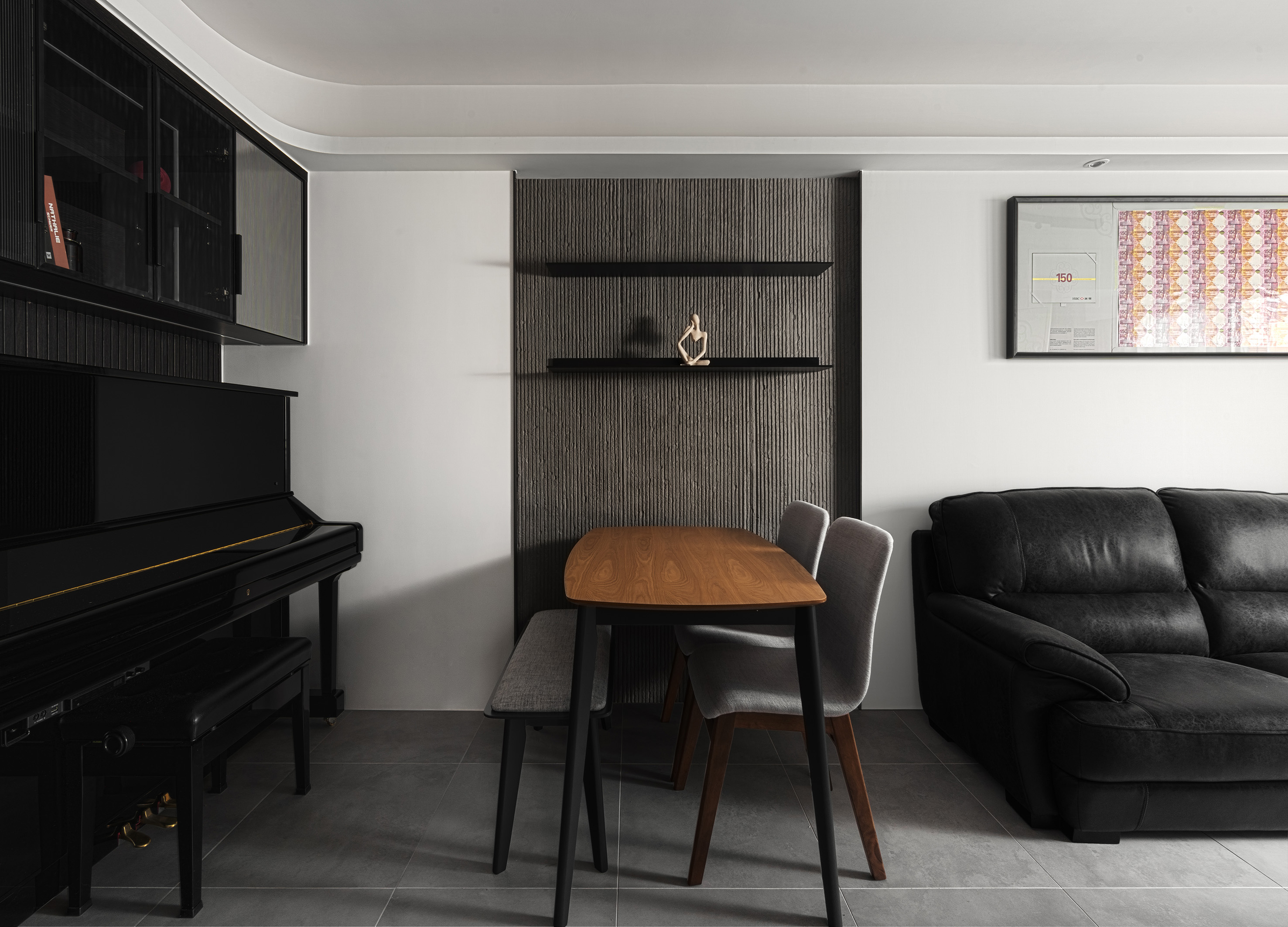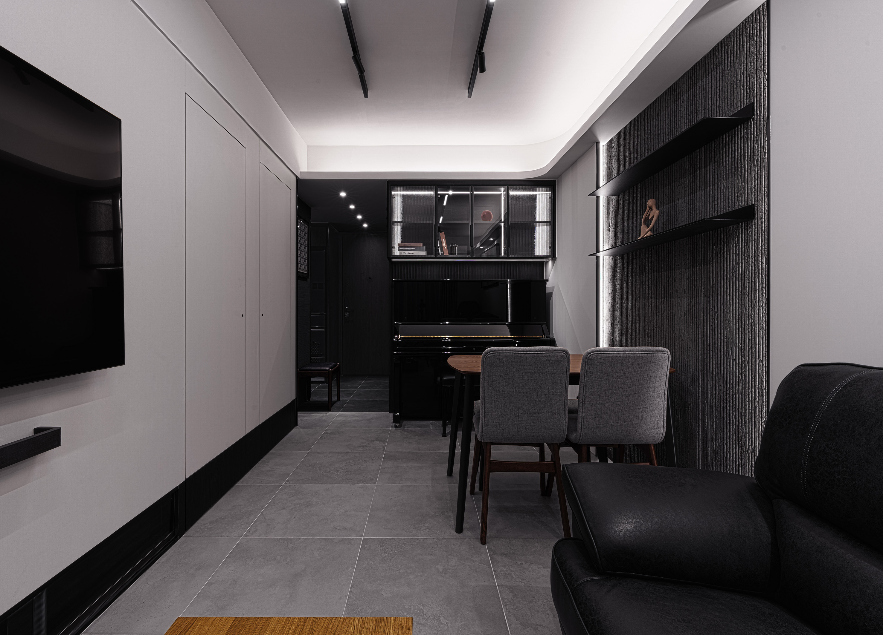 Praised for its seamless blend of elegance and functionality, this design creates a sophisticated yet inviting living space. The contrast between black entrance walls and raw concrete textures sets a bold, modern tone, while the sleek white feature wall cleverly integrates storage and private rooms, maintaining a clean, minimalist aesthetic. Thoughtfully placed curved walls soften transitions, enhancing spatial flow and refinement. This harmonious composition of textures and forms ensures both visual impact and everyday comfort, making it a standout in contemporary interior design.