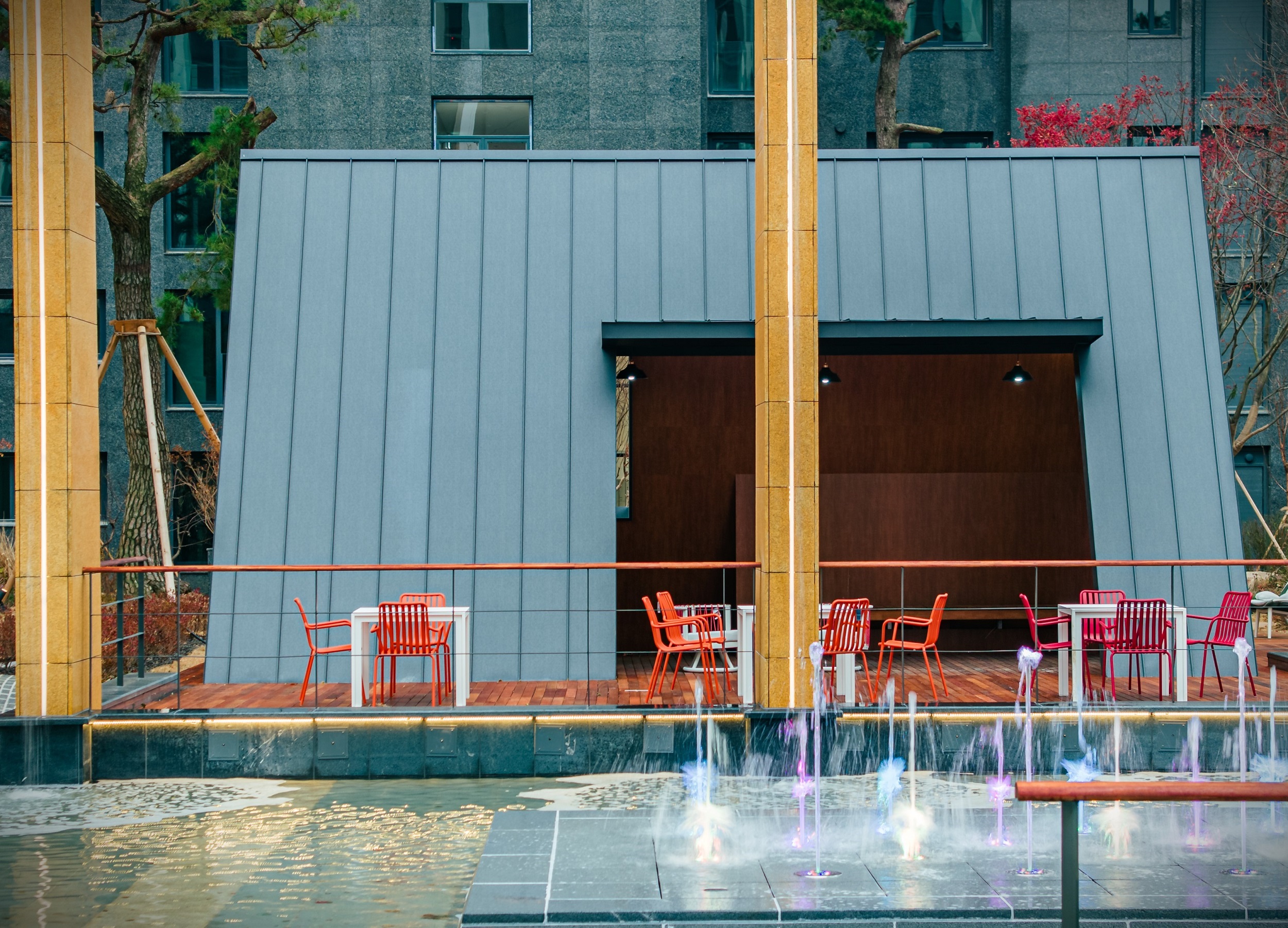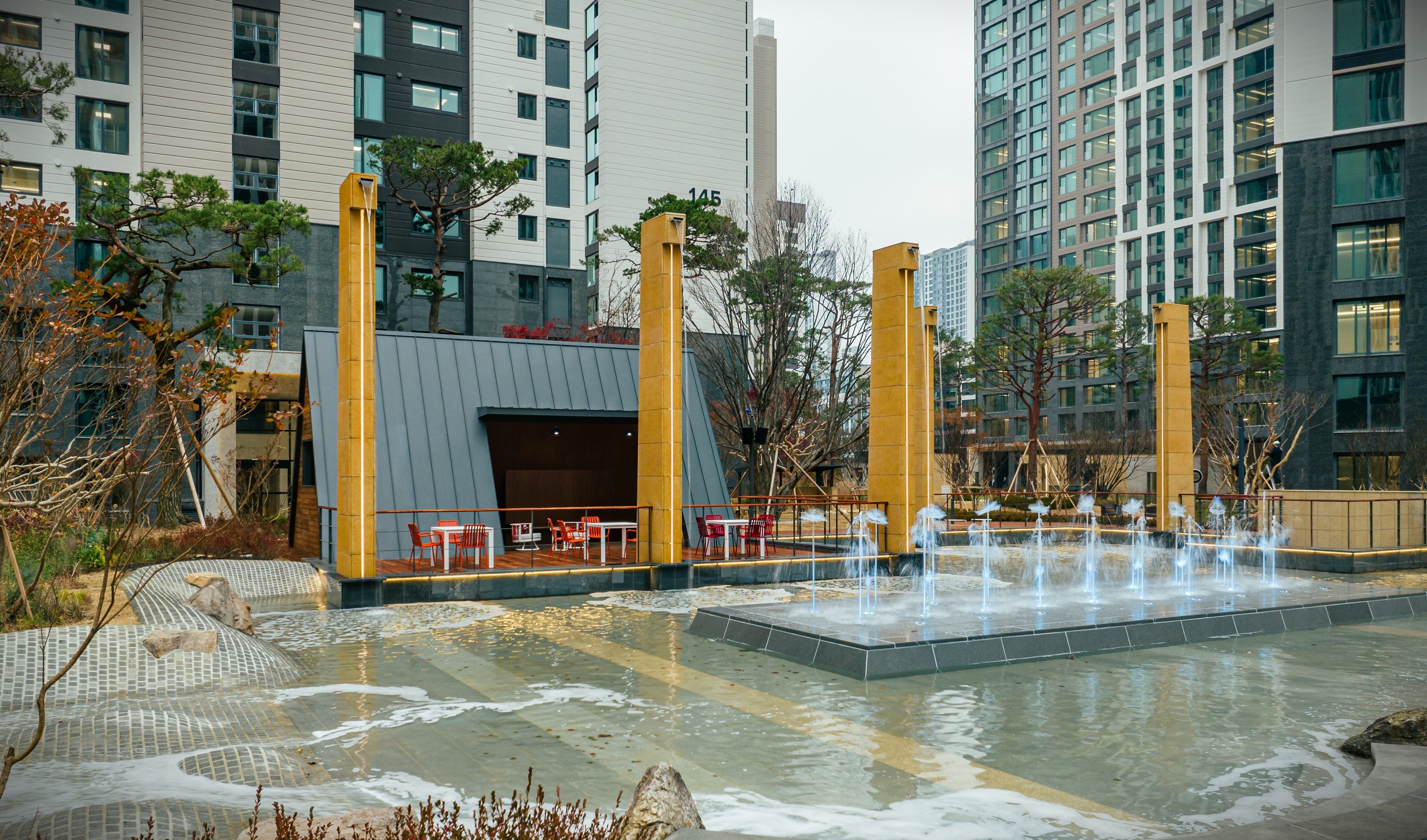 'Natural Tea House'는 산, 나무, 물과 같은 자연의 요소로부터 영감을 받아 제작됐습니다. 주거단지 인근에 위치한 산으로부터 내려오는 산바람을 맞이하는 컨셉으로 형태가 정해졌고 이는 마치 동화 속 오두막을 연상케합니다. 벽천에서 떨어지는 물과 이어지는 개울의 모습은 익숙하지만 다채로운 자연경관을 보여줍니다. '자연'이라는 컨셉에 티하우스 마감재는 우드톤을 사용함으로써 마지막 단추가 끼워졌고 이 공간의 모든 요소들은 하나로 느껴지게 됩니다. 'Natural Tea House'는 입주민들에게 편안하고 아늑한 휴식을 제공하지만 끊임없이 그들의 감각을 자극할 수 있는 공간입니다.