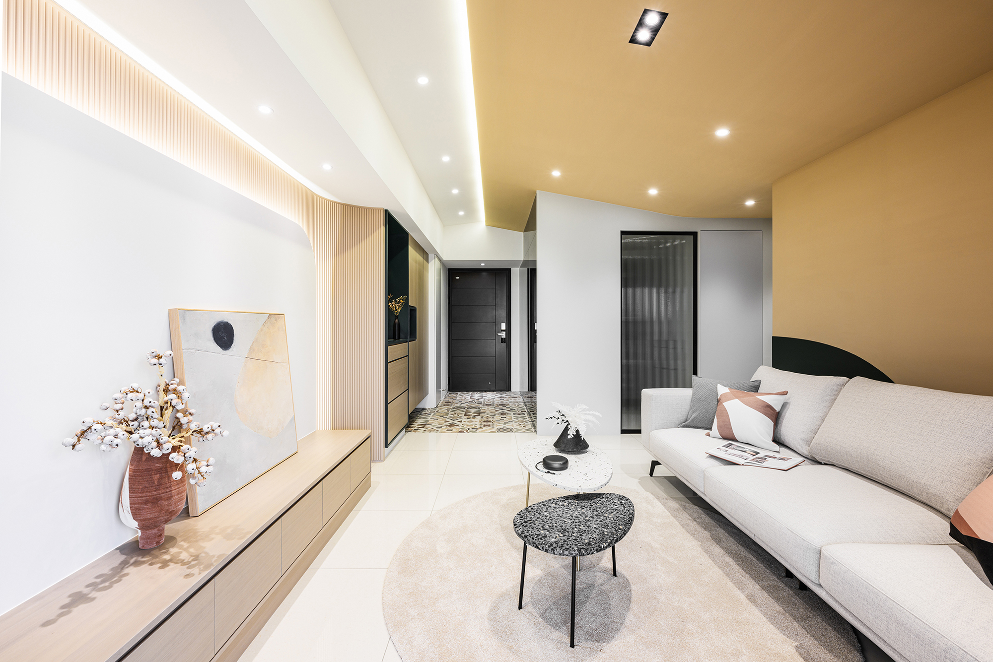 玄關地面以六角花磚框塑進門落塵區,運用穿衣鏡延伸視覺脈絡,營造內外場域心境轉換空間;餐、客廳援用木質搭配淺色素面鋪寫襯底,引注大量自然陽光增強空間通透感,同時透過傾斜的天花規劃,塑造向上抬升視覺效果,藉此隱藏沙發背牆原始壓樑問題,回應「小木屋」發想概念。而電視牆以圓弧語彙柔和環境稜角,勾勒光帶拉深畫面景深,為空間帶來一抹柔韌與活潑。