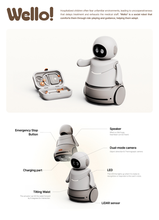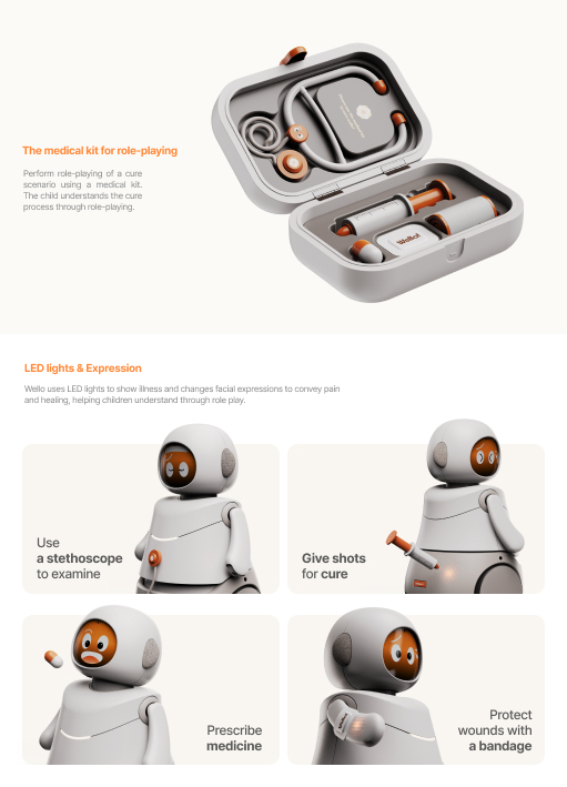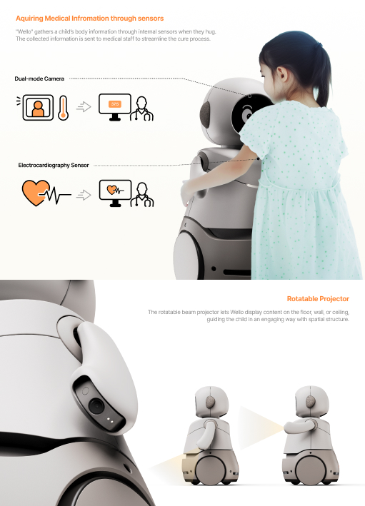 '웰로'는 치료에 대한 두려움을 완화하여 어린이들이 병원에서 더 편안하게 지낼 수 있도록 설계된 소셜 로봇입니다. 웰로는 치료 롤플레잉과 대화형 안내를 통해 어린이들과 정서적인 관계를 형성하여 낯선 병원 환경에 적응할 수 있도록 돕습니다. 긴장한 어린이들과 포옹하고 상호작용하며, 위협적이지 않은 재미있는 방식으로 의료 절차를 설명하고 흥미로운 방식으로 길을 안내함으로써 편안함을 제공합니다.