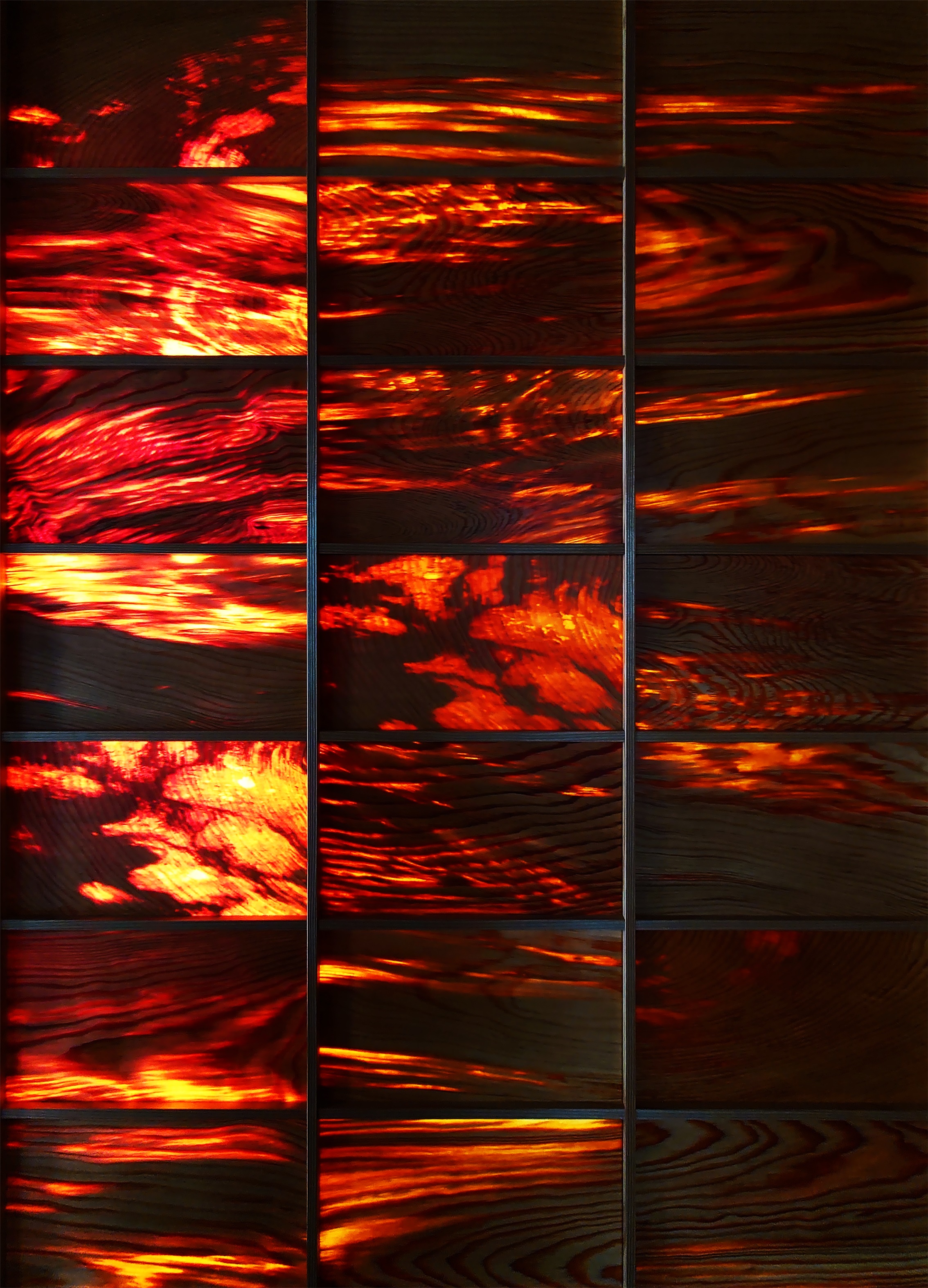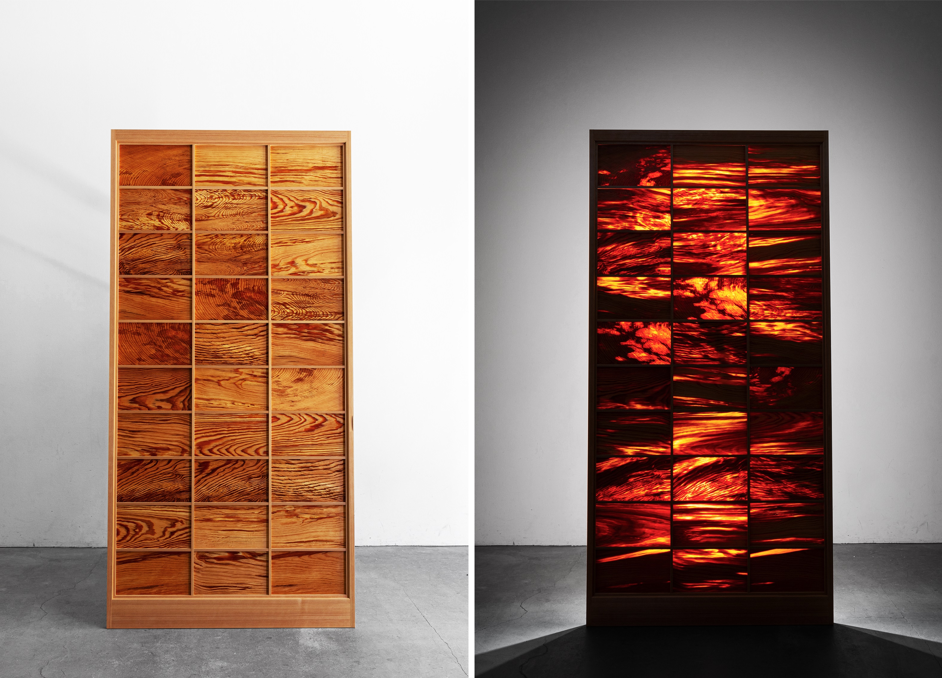 樹脂が多く、使用方法やメンテナンスに困り、昔から毛嫌いされてきた松の樹脂を様々な加工技術によって、美しい素材に変化させて、先進的なデザインに昇華する。これまで用いられてこなかった木の素材を美しい素材に変えて、日々の生活で用いられる建具を創ることで、森林資源の木を循環させていく。肥松材を特殊な加工で薄い板に製材し、本来和紙を貼るところに肥松の薄い板をはめ込んで、肥松の障子をつくる。肥松の板材は、昼は外部の自然光により屋内側の面が、夜は屋内の照明より屋外側の面が、赤く妖艶に光りだす。昼夜で赤く光り出す面が反転し、見え方が変化する。光を捉えて、赤く妖艶に光り出す肥松は、木のステンドグラスのようだ。また、経年変化により、樹脂が全体の木目に浸透していき、表層は美しい飴色へと変化することで、より深い赤で肥松の障子が妖艶に光り出す。木の特性を活かした肥松の障子が、様々な空間に華を添える先進的なデザインとなることを信じている。