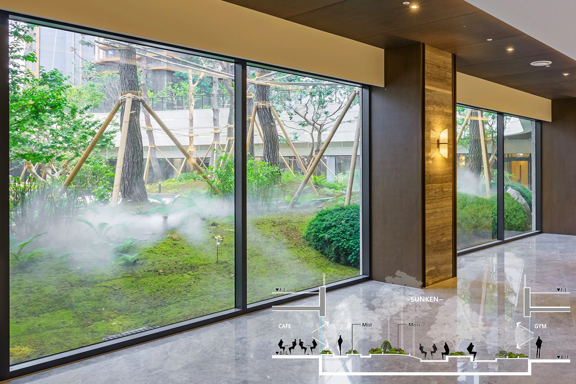 6m 깊이의 Sunken은 대부분이 그늘져서 음지식물인 이끼/고비류를 메인으로 식재하고 미스트를 반영하여 몽환적이면서 매력적인 새로운 경관을 조성함. 교목을 제외한 하부 녹지는 탄소 흡수량이 가장 높은 이끼를 전면 식재하여 연간 약 9ton의 탄소를 저감할 수 있게 됨. 이는 全 지구적으로 탄소저감과 ESG가 중요시 되는 상황에서, Moss Garden이 주민들에게 새로운 주거 가치를 부여함.