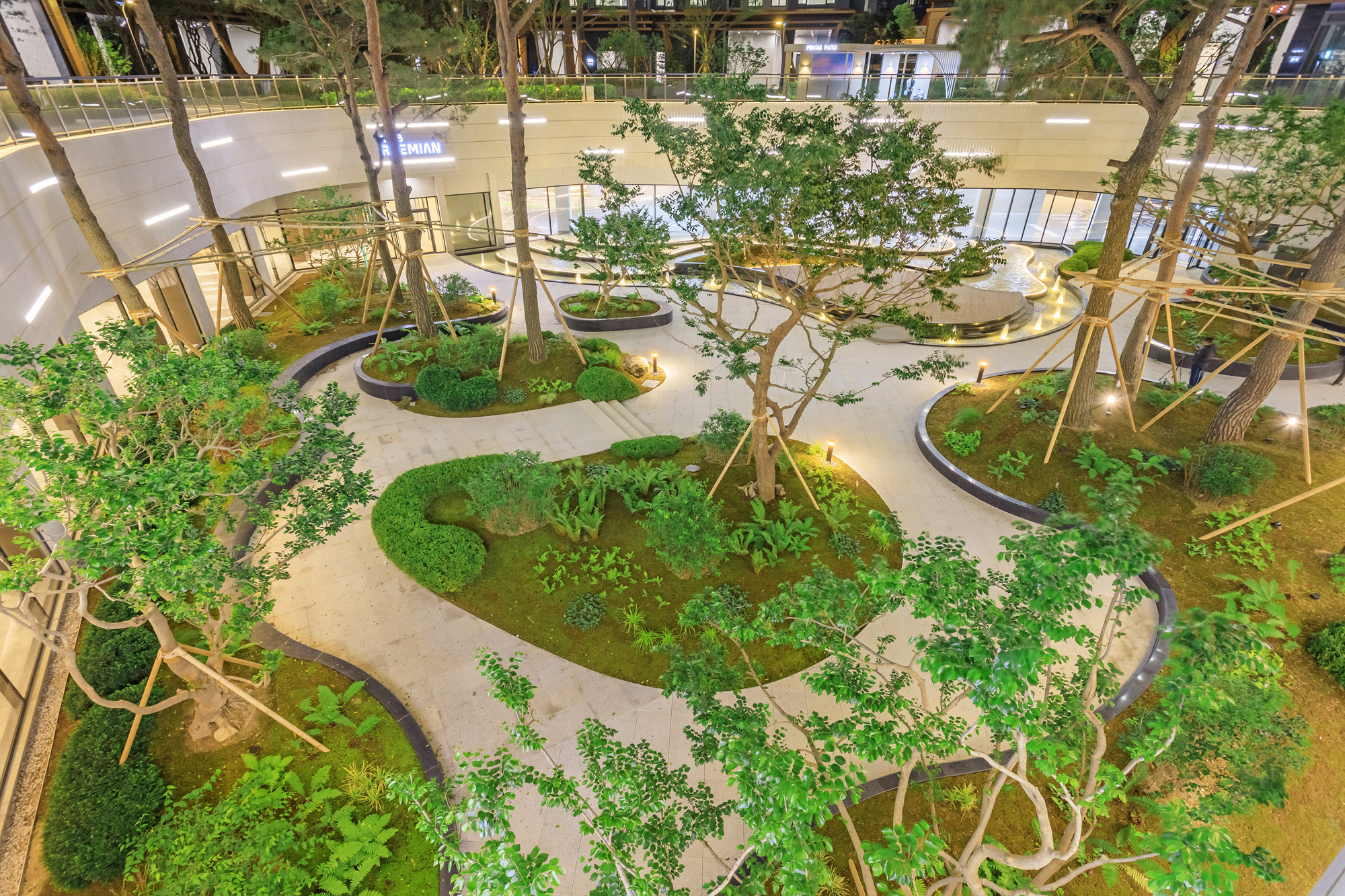Curved trails in 2 stories overlap green areas, increasing its ratio and offer a rhythmic view. IoT linked mist offers water to the moss and dreamy and beautiful view to residents.