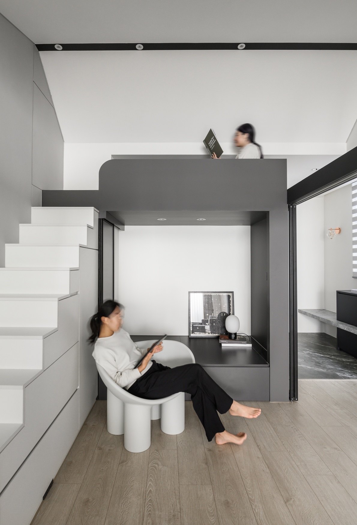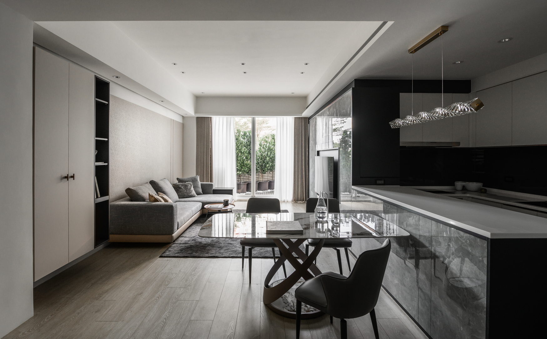 Connecting the public area with balcony and facing the floor-to-ceiling window opening, the design allows light to penetrate into the interior, the living room and kitchen are fully open, and the transparent and open design can be used as a social center. In terms of structure, the triangular roof is set in accordance with the original beam body, which not only highlights the advantages of house height, but also eliminates the problem of large beam height difference. The double layer design, uses black, white and gray tones and geometric lines to depict the structure of Loft, and also condenses the modern and simple atmosphere.