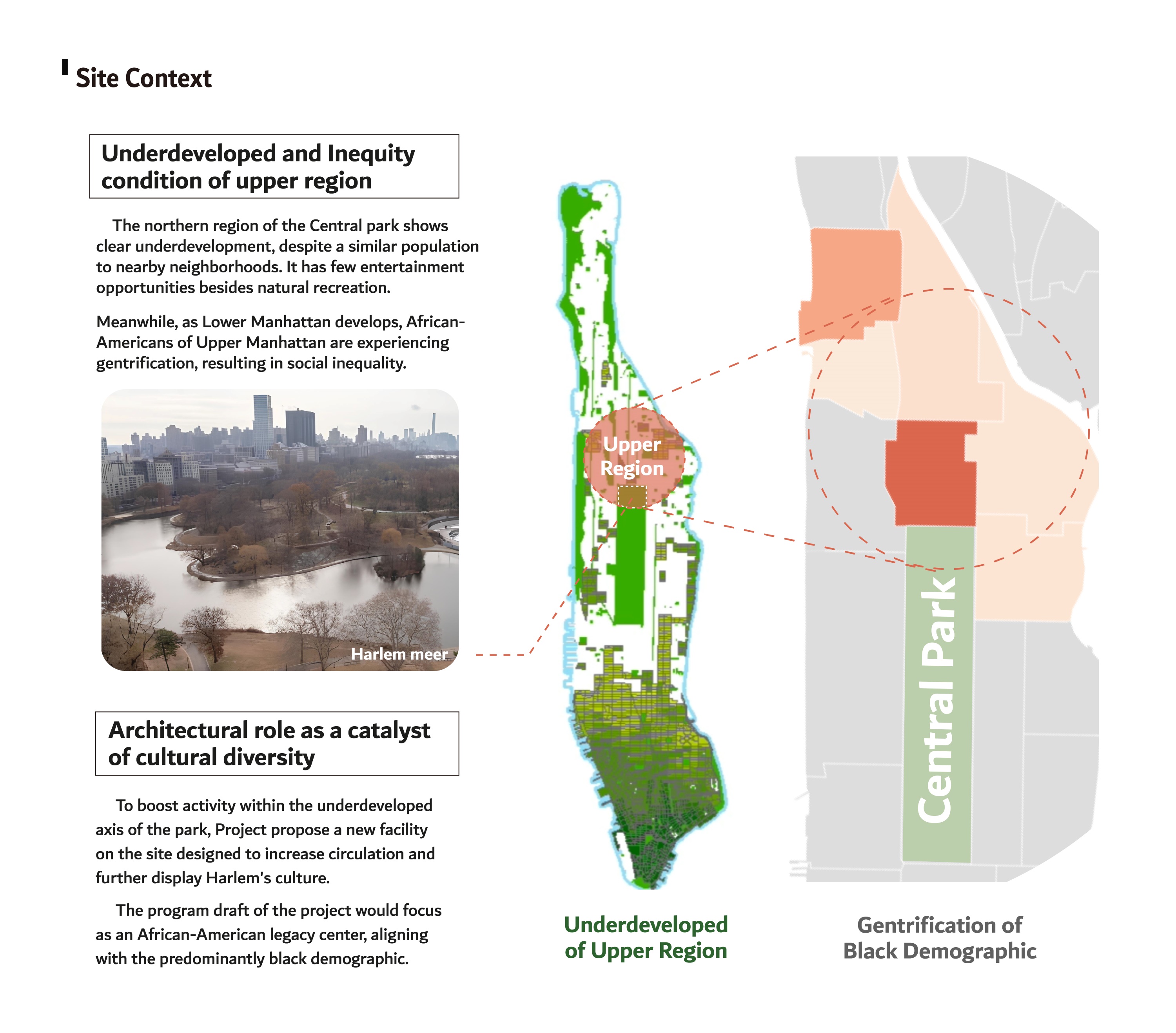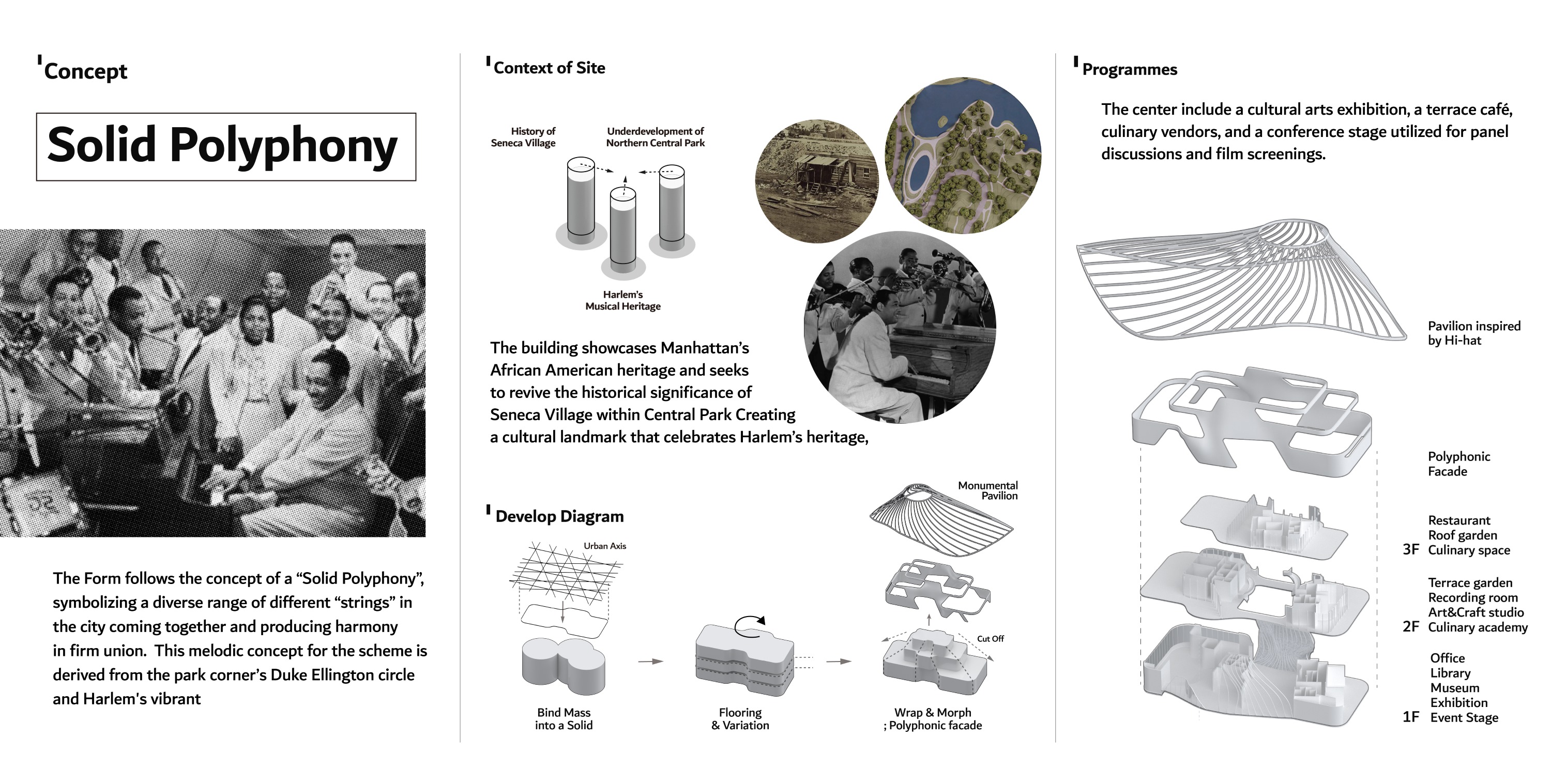 The project revives Seneca Village in Central Park, creating a cultural landmark celebrating Harlem's heritage. It addresses demographic inequity and gentrification in Upper Manhattan by proposing a new facility to enhance circulation and showcase Harlem's culture, focusing on an African-American legacy center. The "Solid Polyphony" concept symbolizes urban harmony through diverse elements, inspired by Duke Ellington Circle and Harlem's vibrancy. The project includes sustainable archives and exhibitions to preserve and advance African American history, culture, and tradition.