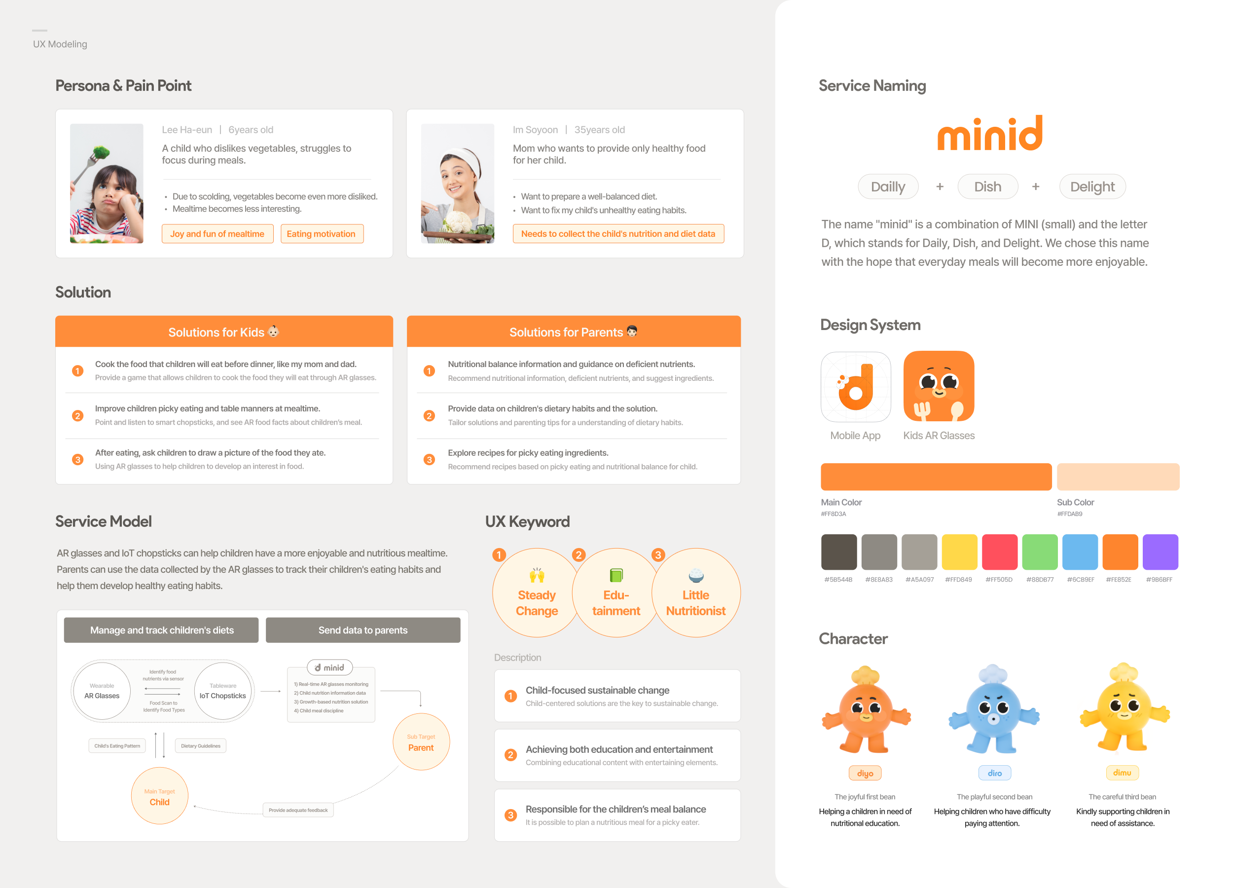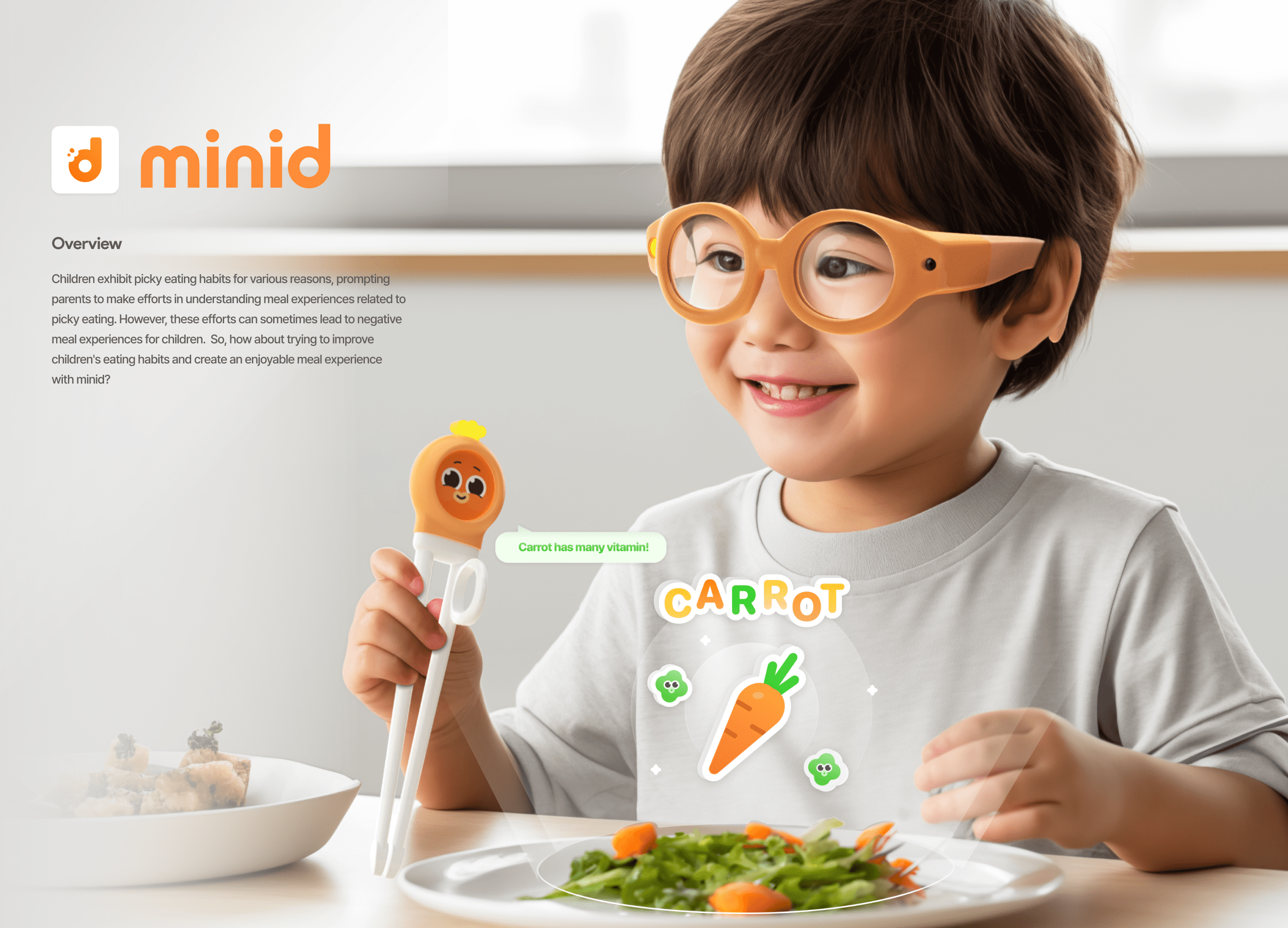 '미니드'는 어린이들의 편식과 다양한 식습관 문제 행동을 즐겁게 개선하기 위해 AR글래스와 IoT 젓가락을 제공합니다. 아이가 식사 전에 AR글래스를 착용하면 부모님처럼 그날 자신이 먹을 음식을 AR로 만들어봅니다. 이후, 식사 시간이 되면 IoT 젓가락으로 편식하는 식재료를 먹도록 유도하여 아이가 젓가락으로 음식을 포인팅하면 AR글래스 속에 숨겨진 식재료와 캐릭터들이 등장하면서 먹는 행위에 흥미를 가지도록 합니다. 그리고 식사가 끝이 나면 그릇을 싱크대에 갖다놓는 행위를 유도하여 식습관 예절 행동도 학습할 수 있도록 합니다. 식사가 완전히 끝났다면 그날 먹은 식자재로 그림을 AR로 그려보며 식재료에 대한 흥미를 지속적으로 이끌 수 있습니다. 그리고 AR글래스는 아이의 모든 식습관 행동, 영양 섭취 데이터를 트래킹하여 앱으로 전송하여 부모는 성장기 아이들의 식사 시간을 효율적으로 준비할 수 있습니다. 또한 아이들의 식사 경험을 새롭게 변화시켜, 건강한 식습관 형성에 긍정적인 영향을 미칩니다.