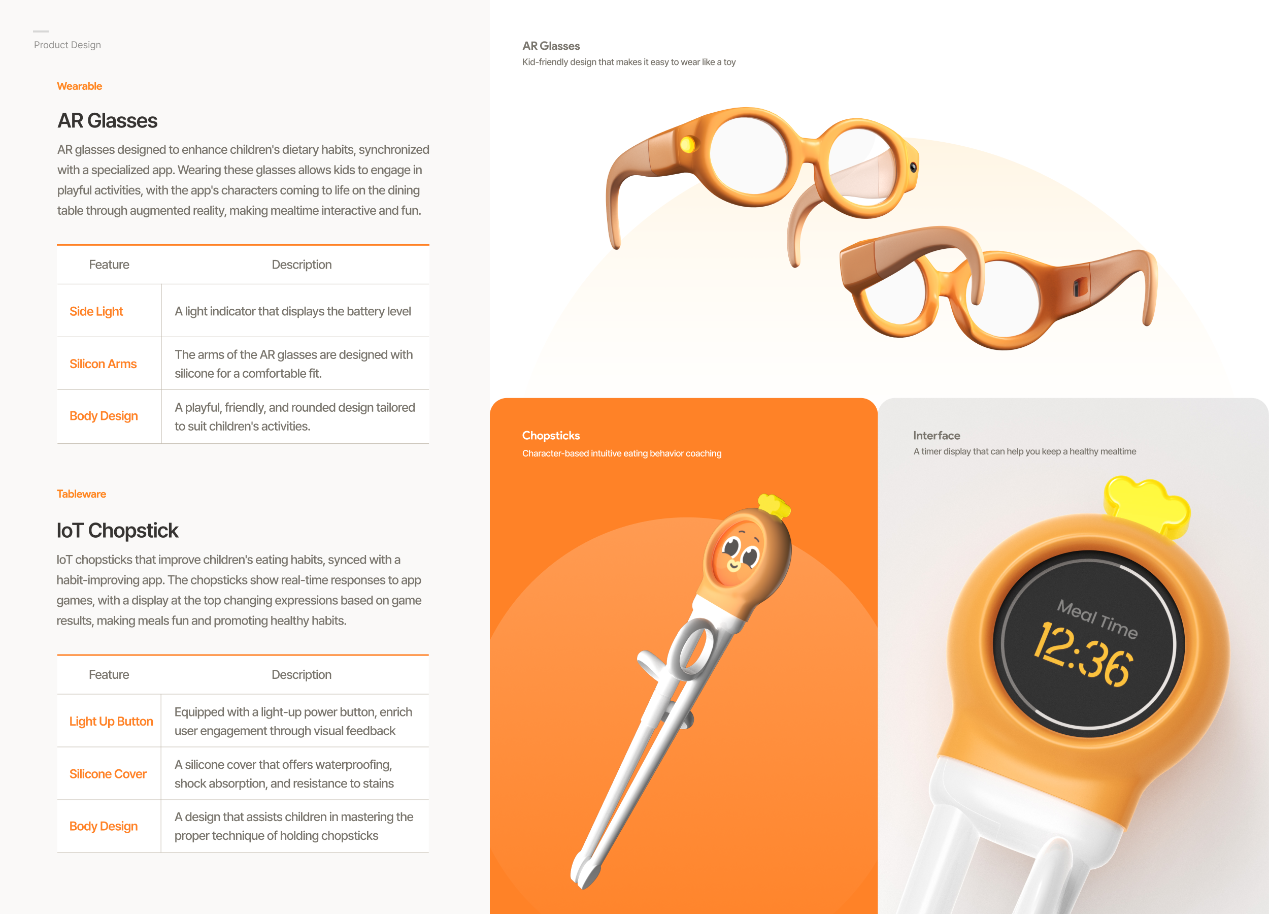 Minid offers AR glasses and IoT chopsticks for children with picky eating habits. Before meals, children use AR glasses to visualize their food, making meal preparation interactive. During meals, the IoT chopsticks reveal hidden ingredients and characters in the food through AR, engaging the child's interest. Post-meal, children learn about clean-up by placing dishes in the sink and can draw in AR with their meal's ingredients. The system tracks nutrition and eating patterns, providing parents with data and personalized solutions for meal planning and nutritional education.