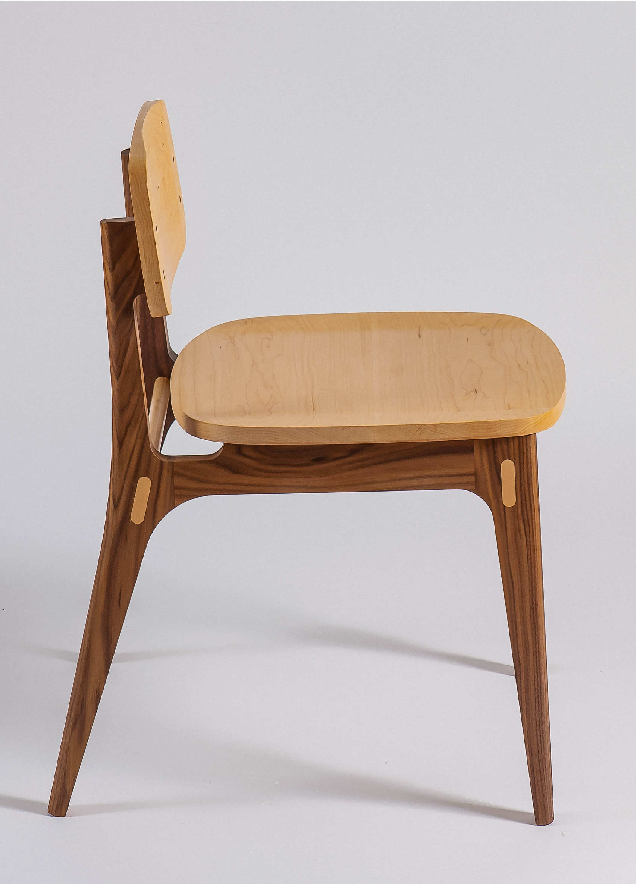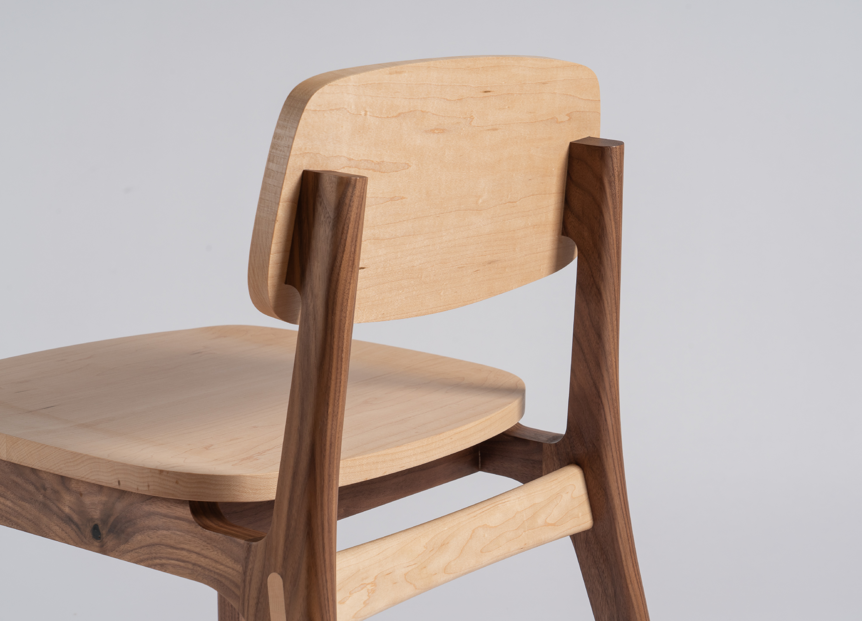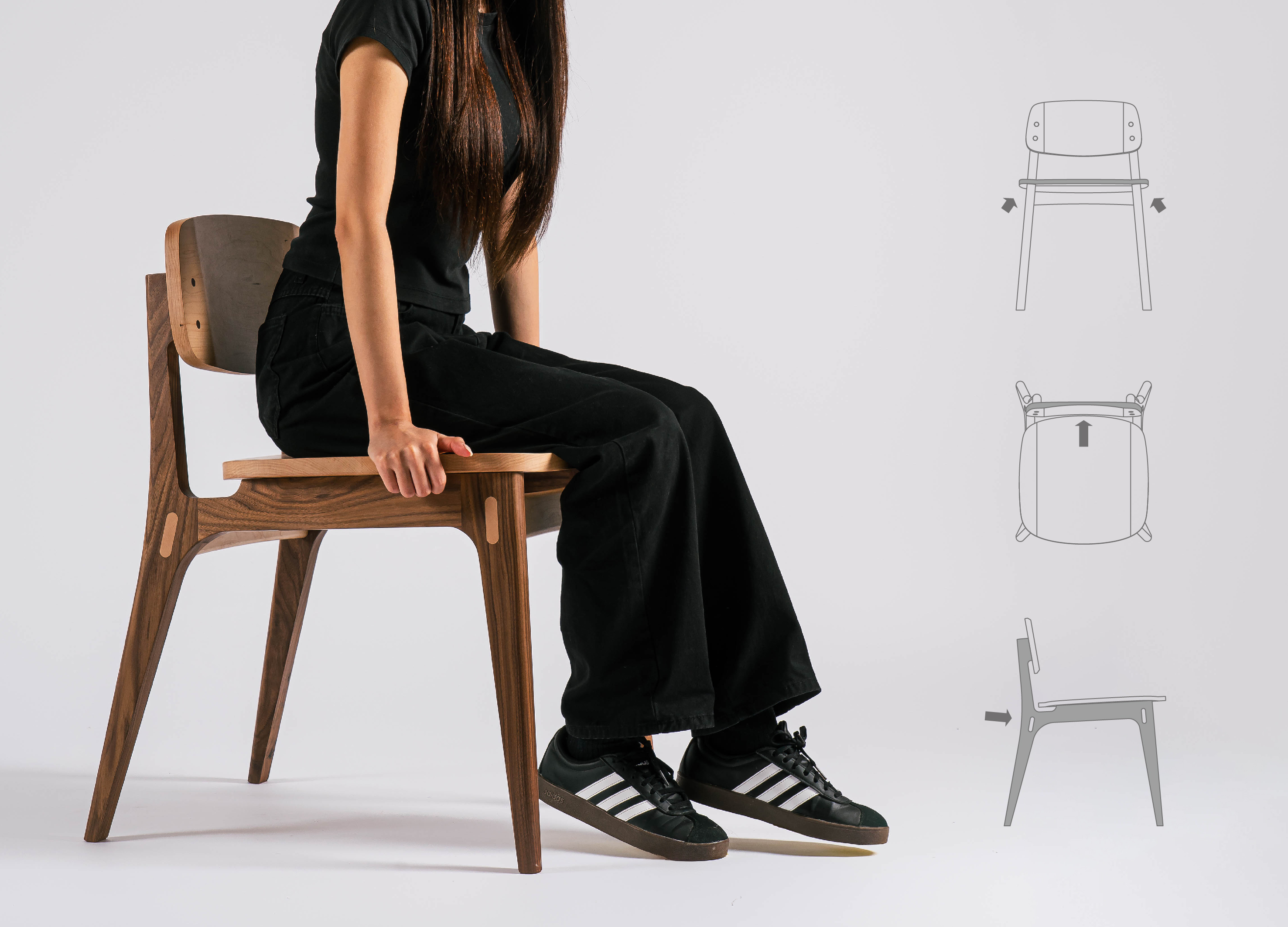 This chair is an AI-assisted design created with an architectural interpretation of the theme “Minimalist Furniture that Complements the Space.” The overall form consists only of what is considered essential for a chair: the backrest, seat, and legs. Detailed touches, including a carved backrest, angled seat, and curved legs, add refinement to this minimal structure. The use of two types of wood with contrasting colors emphasizes the intuitive assembly of modular furniture. Through this overall arrangement, the empty spaces formed as each element leans on another become an intentional part of the composition, creating a sense of cohesion.