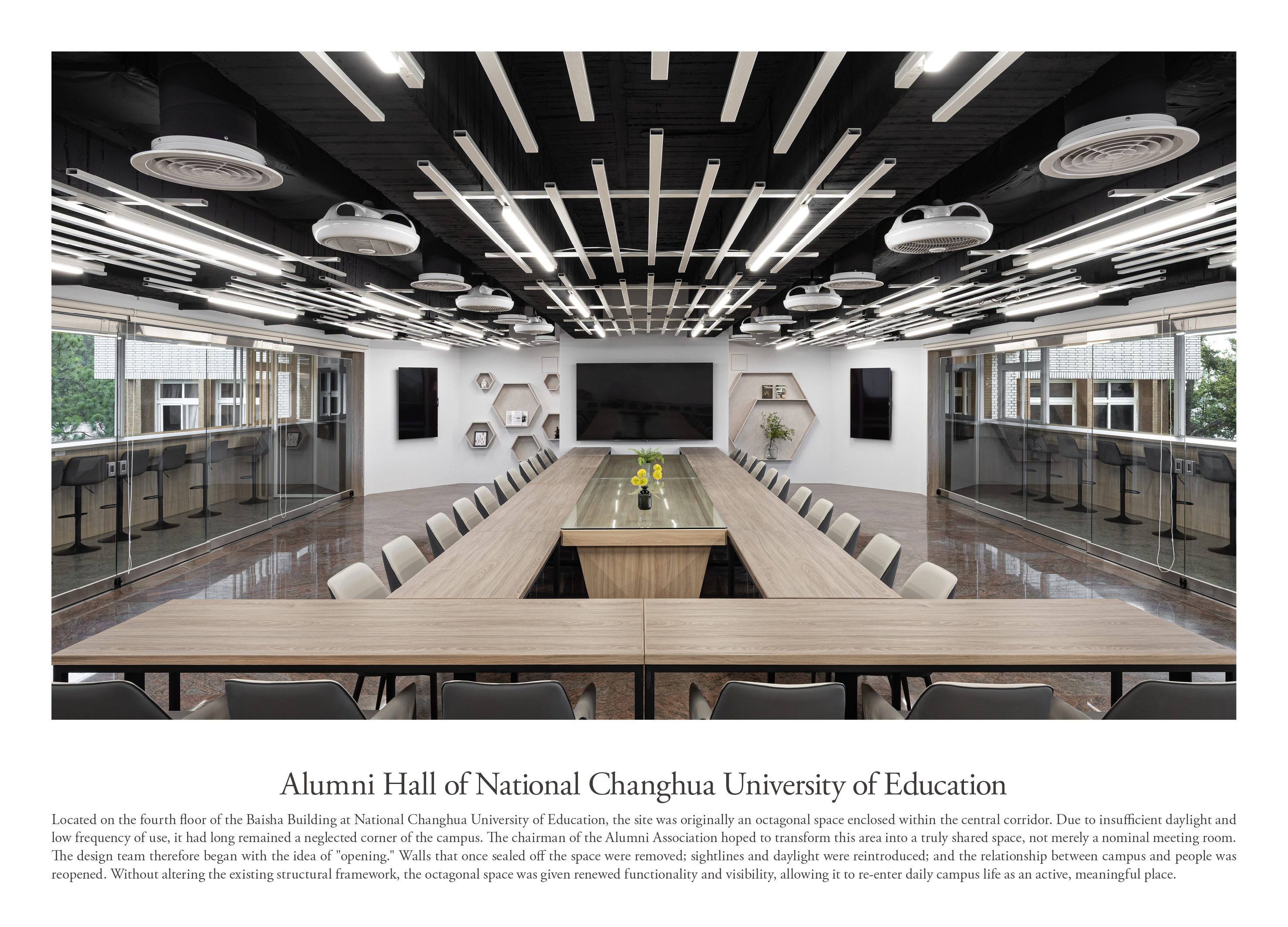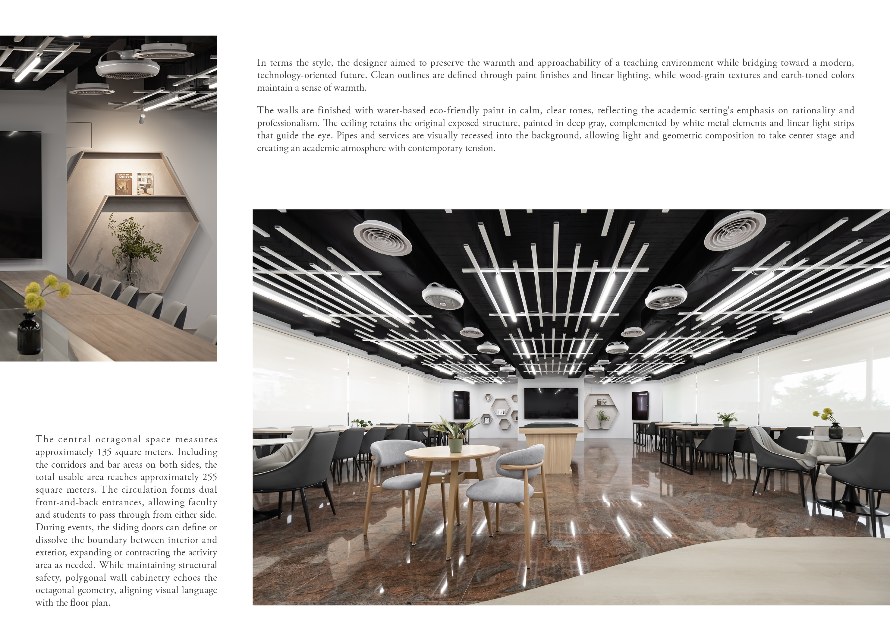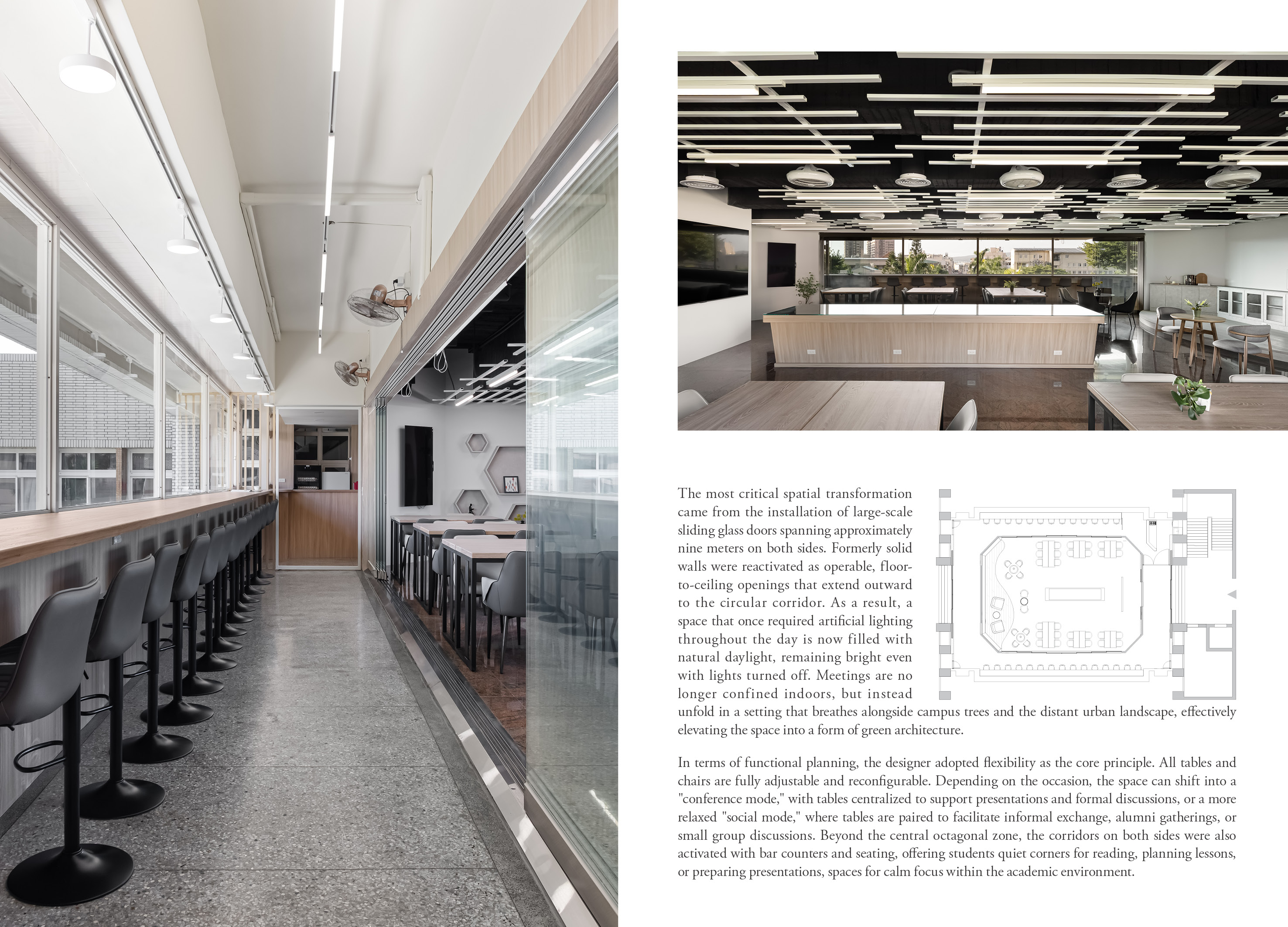 空間最關鍵的轉折,來自兩側長達約九米的大面積推拉玻璃門。原本封閉的牆面被重新定義為可開啟的落地開口,向外銜接環形走廊,使視線、動線與自然光重新流動。過去需整日依賴人工照明的場域,如今在白天關燈的情況下依然明亮通透,室內活動不再被侷限於封閉空間,而是與校園樹梢及遠方街景共同呼吸,實踐綠建築所強調的自然共生。 在功能配置上,設計師以「多變形態」作為核心策略,所有桌椅皆採可移動、可調整的彈性設計。空間可依需求轉換為「會議模式」,將桌面集中於中央,支援簡報與正式討論;亦可切換為較為放鬆的「交流模式」,透過兩兩併桌,促進聯誼、小組討論與非正式互動。除八角形中央區域外,左右兩側走道亦被活化,配置吧檯與座椅,成為學生閱讀、備課、規劃學習進度或準備簡報的靜心角落,讓公共空間真正融入日常校園生活。