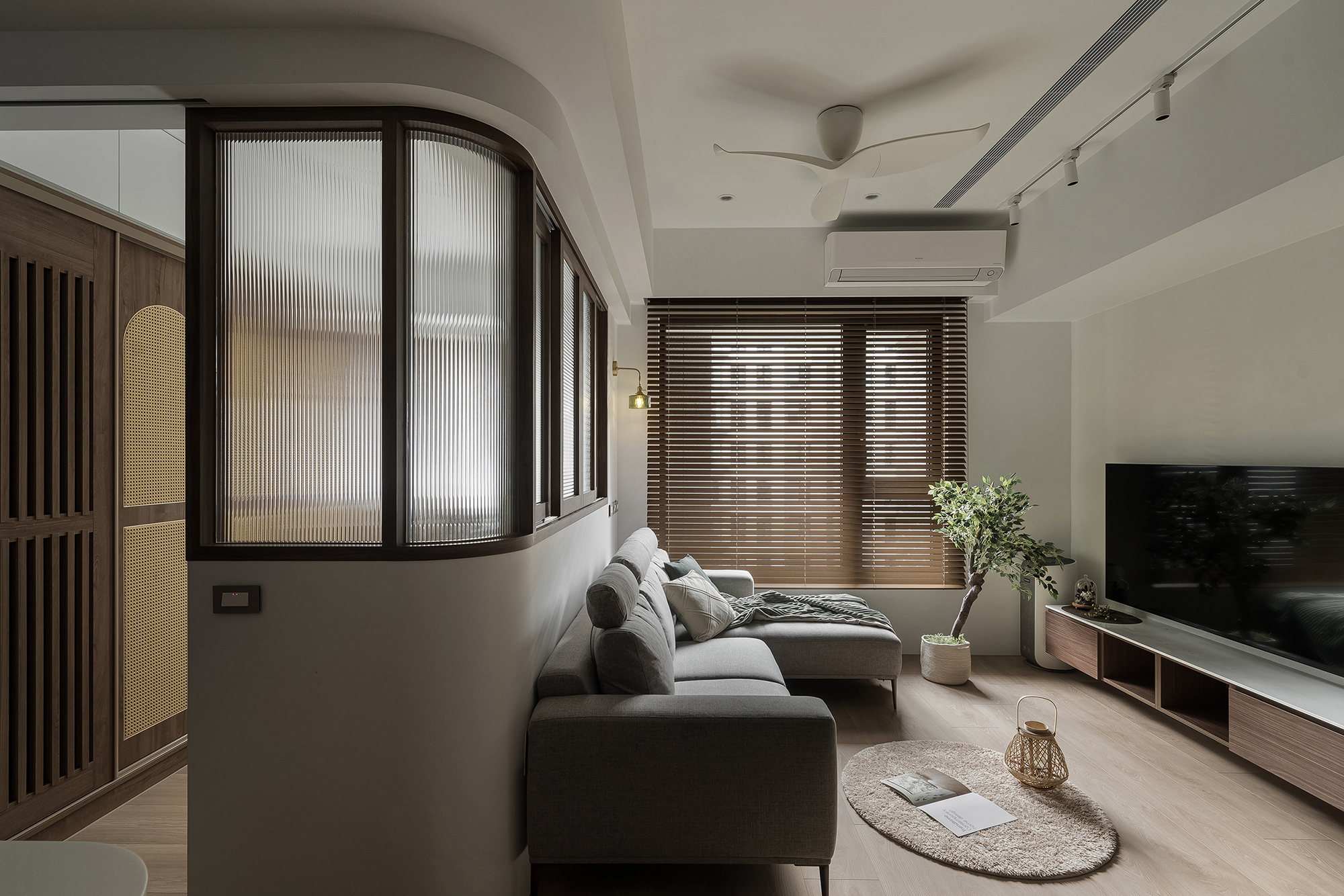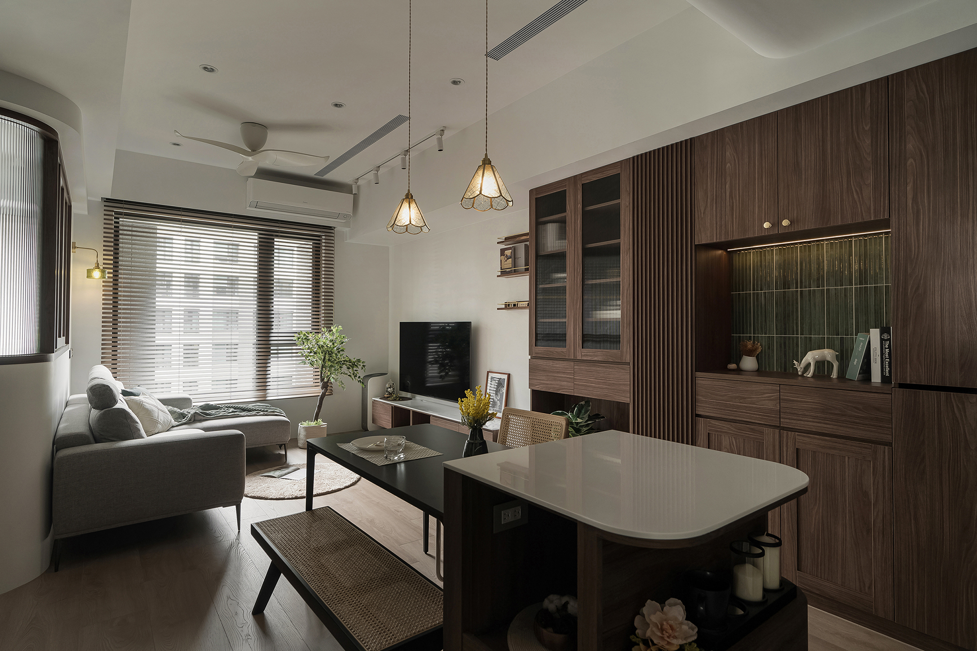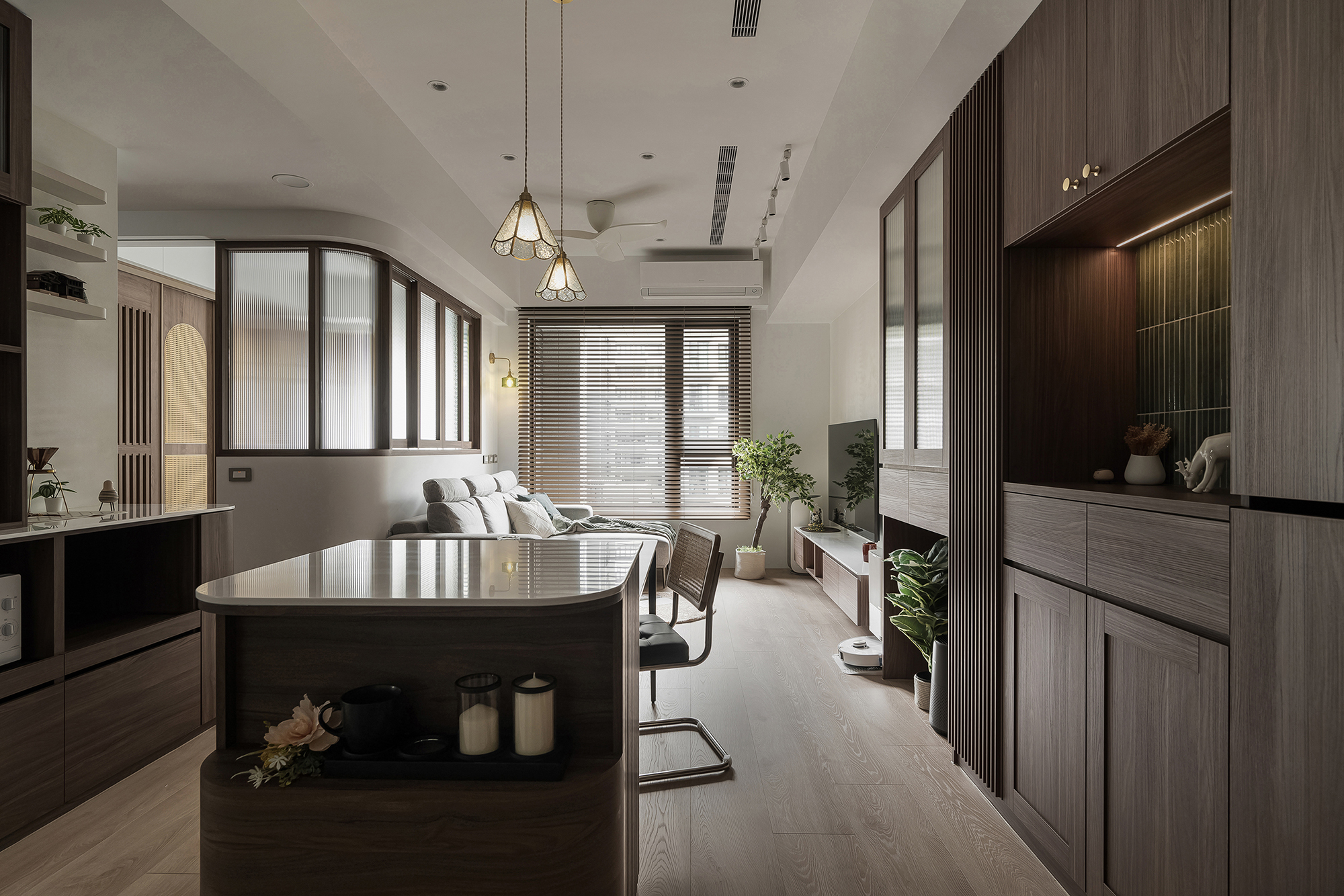The main wall in the living room is covered with a special white paint that has a fine matte texture, matching the dark wood cabinets. To keep the space open and bright, a semi-open study replaces a solid wall. Patterned glass above the half wall lets natural light in while keeping the space airy.