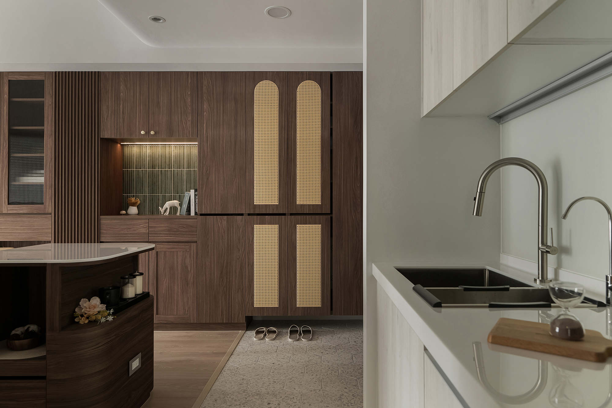 公領域延續多變的材質對話,中島與天花皆以圓弧語彙柔化視覺,不僅為空間增添流動性,也考量到居住者的生活安全。特別規劃的機能中島,滿足屋主下廚的夢想,更利用石材、木紋、格柵多重材質拼接,創造視覺驚喜。