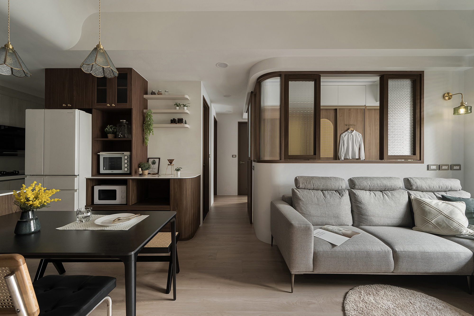 懷舊復古氣息氤氳,在城市光景中,尋得一處安放自我的懷抱。運用多種復古材質與語彙,縝密分割比例,使深木紋、海棠花玻璃、磨石子、藤編元素交織共鳴,構築一處既沉穩又輕盈,充滿細節與情感的居家場域。