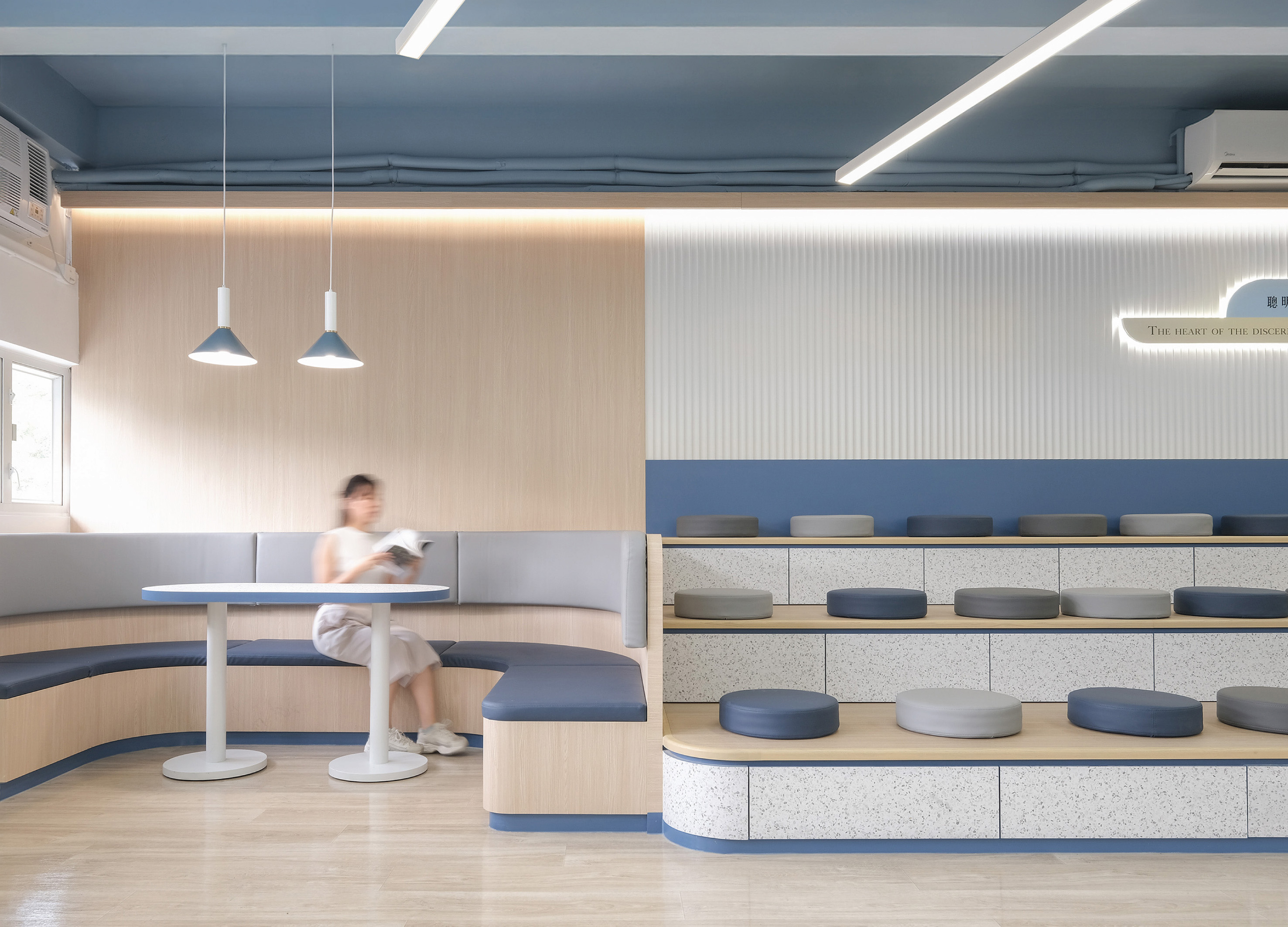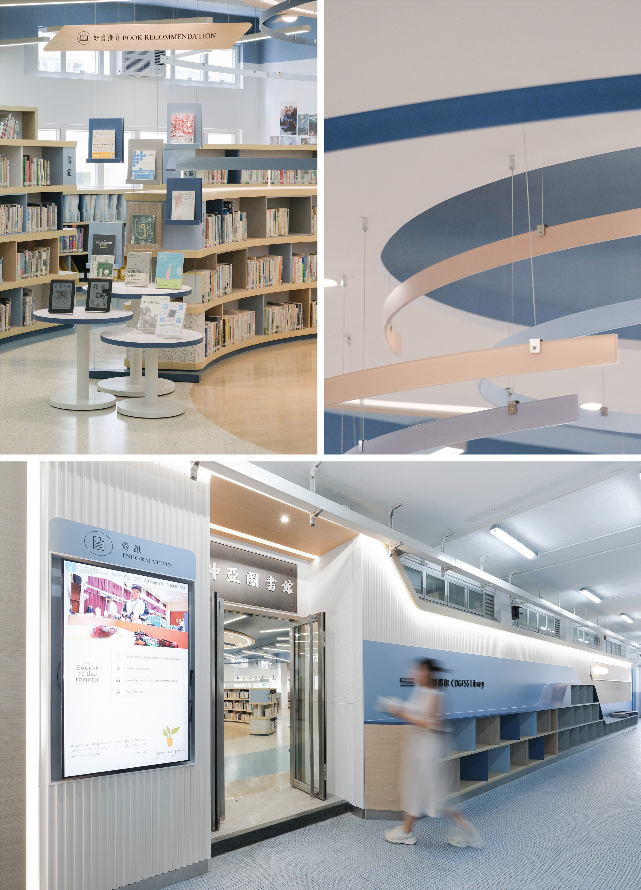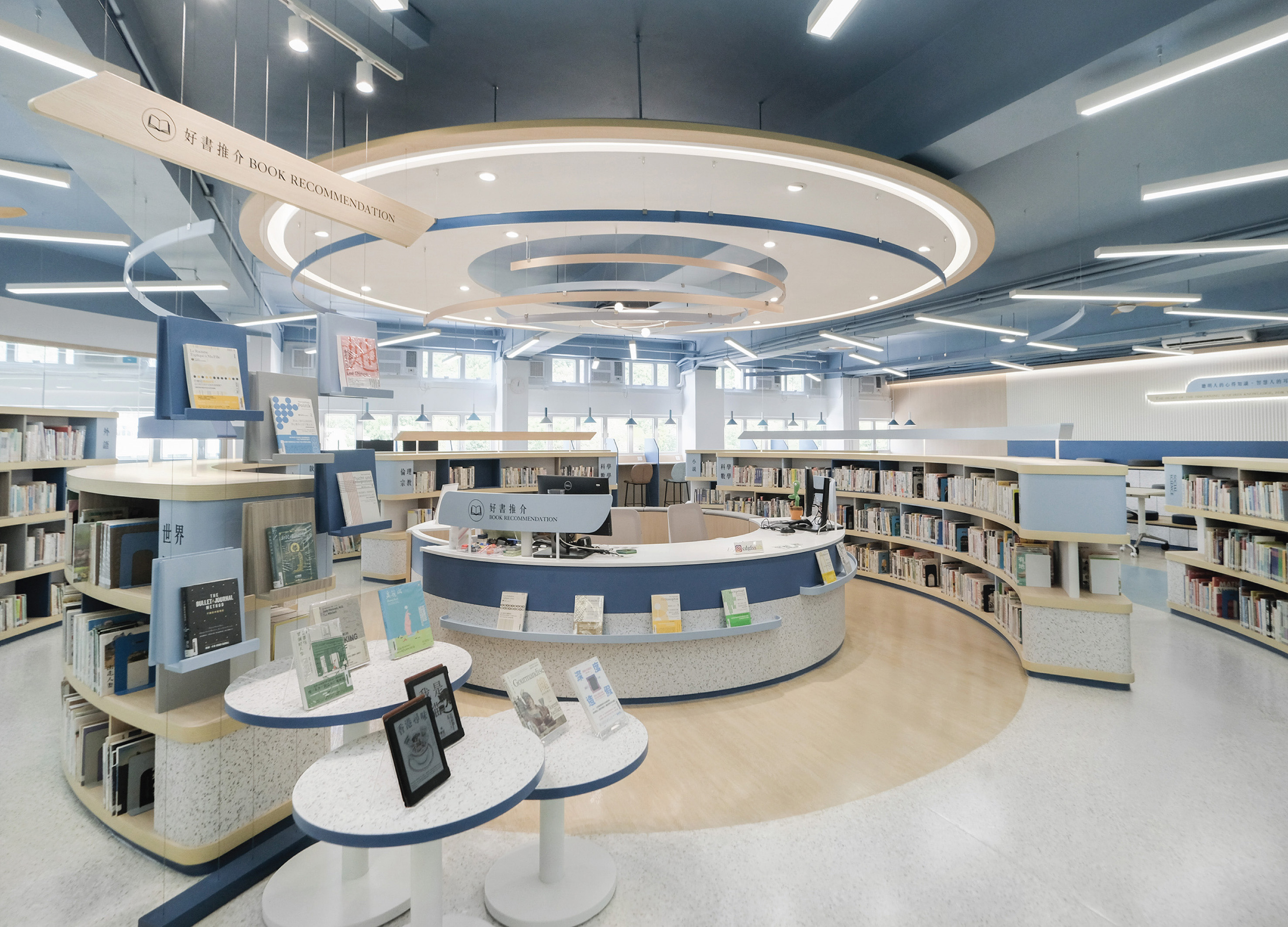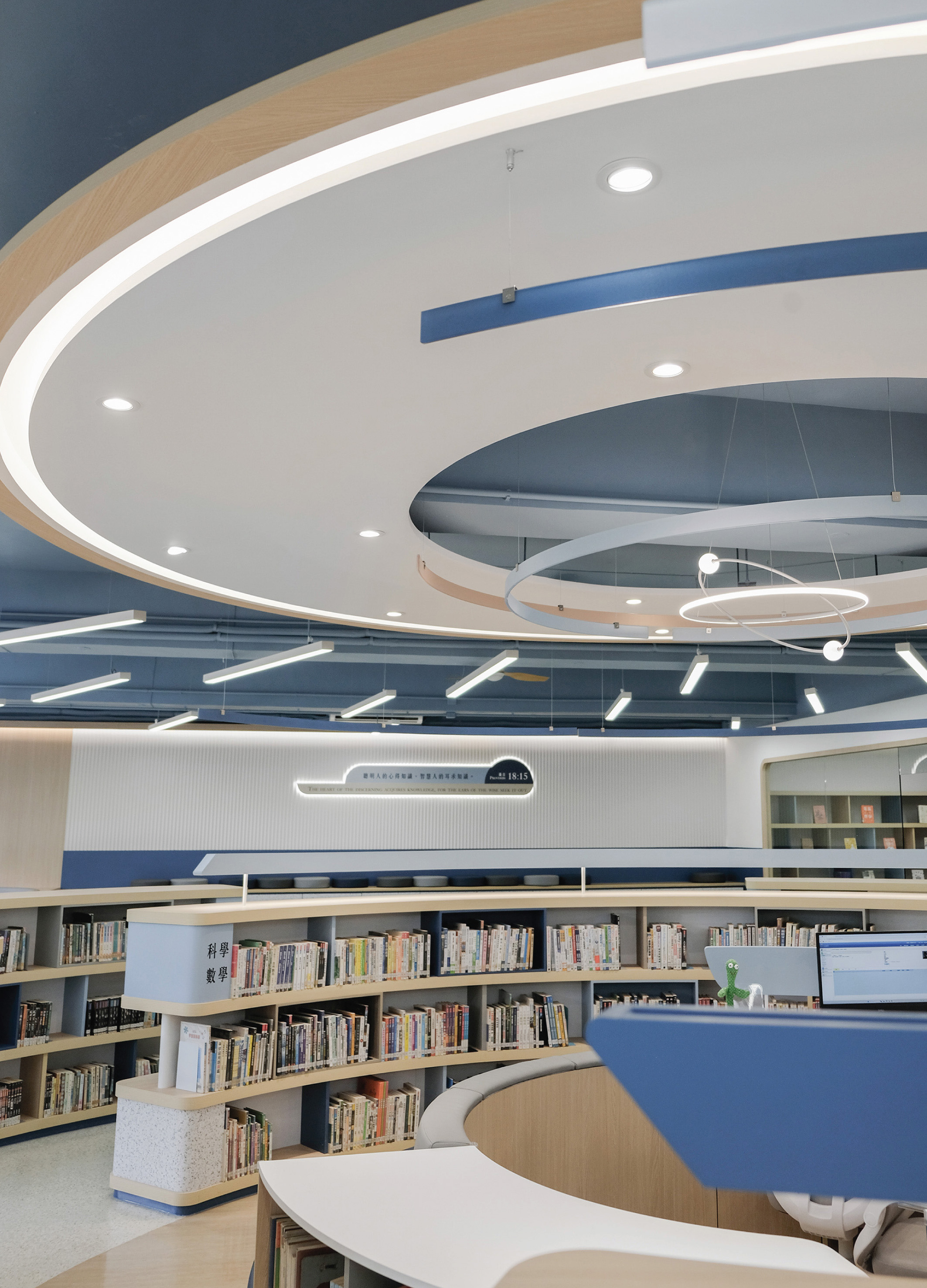 「光」是啟蒙的起點,是真理的源頭,從天上灑落,凝聚於圖書館的中心,形成一圈圈如圓環般擴散的知識之光。這道光不僅照亮空間的每一個角落,更象徵著神所賜予的智慧與啟示,引領學生在浩瀚書海中尋得方向。光束如漣漪般層層向外延伸,重塑了圖書館的輪廓,也重新定義了學習的意義—知識如同永無止境的圓,不斷循環、不斷豐盛,讓每一位踏進此地的學生,在光的引領下汲取養分,點亮未來,讓生命因知識而更加完整。 書架以流線型弧線層層展開,如光暈般環繞空間,打破傳統直線框架,使動線充滿探索的趣味。中央的圓形櫃台與上方的圓環假天花相互呼應,流動的線條在兩者者間穿梭,形成了獨特的裝飾線條,像光的軌跡般在櫃檯上方盤轉,成為了圖書館的焦點。設計師以淺木、白色與水磨石為基調,點綴象徵學校校徽的藍色,營造出時尚而溫潤的氛圍。這座圖書館不只是一處學習的場所,更是照亮未來的起點,讓知識的光芒在這裡駐足、流轉,引領每個學生在書頁間找到方向,在思考中看見更遠的明天。