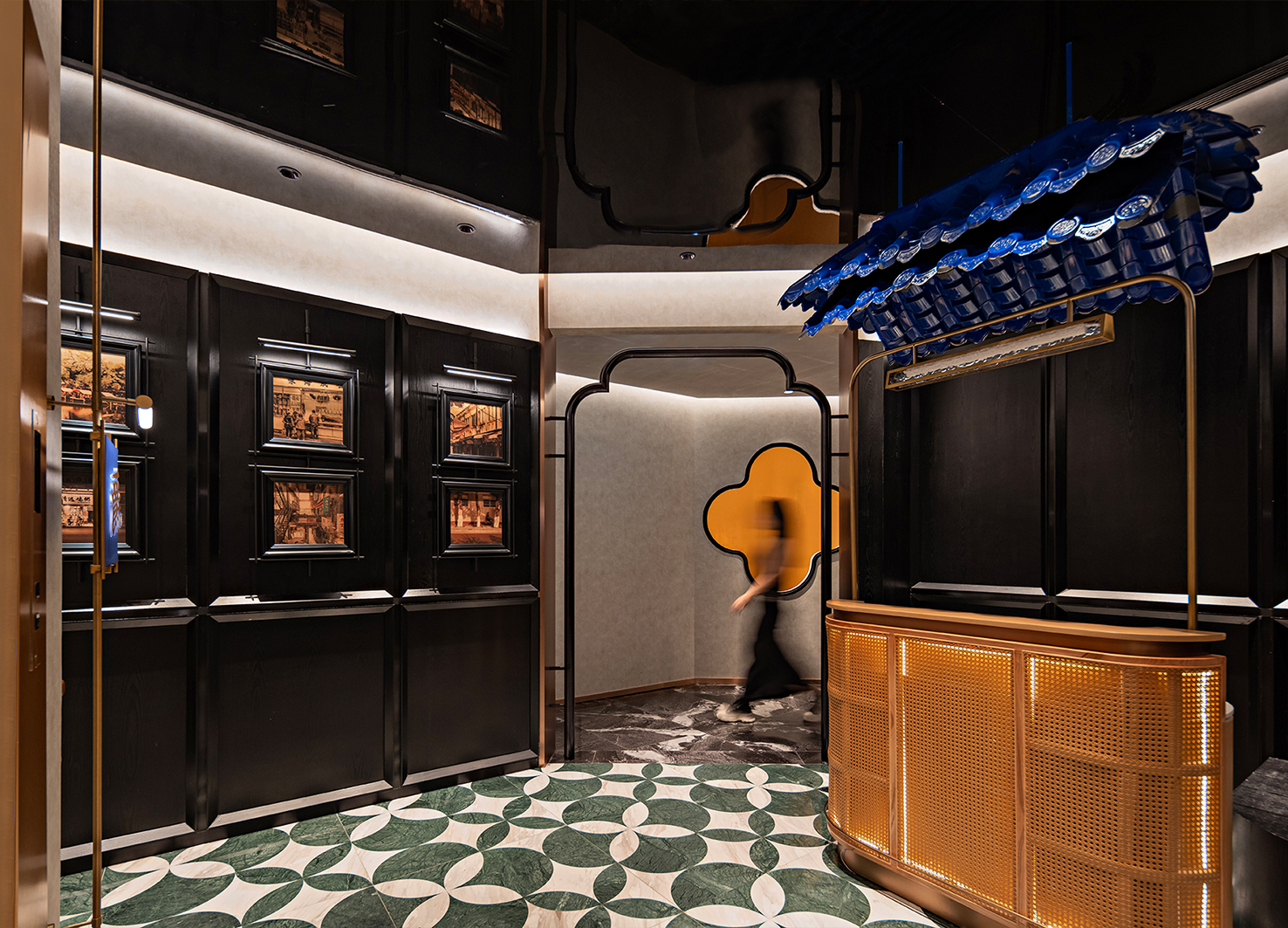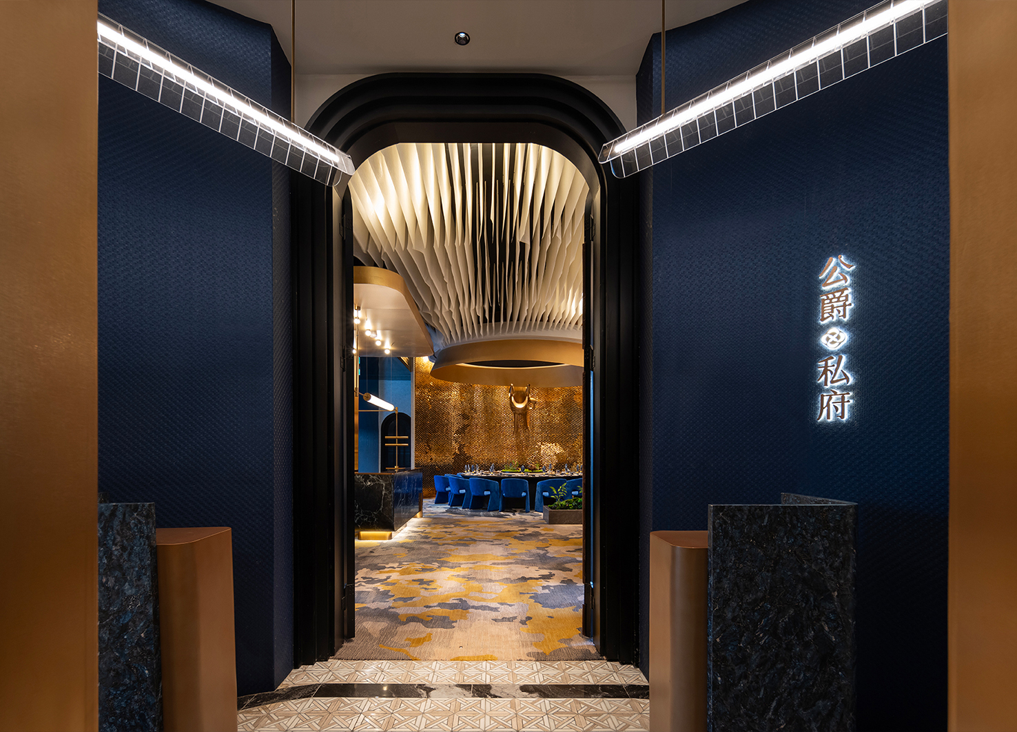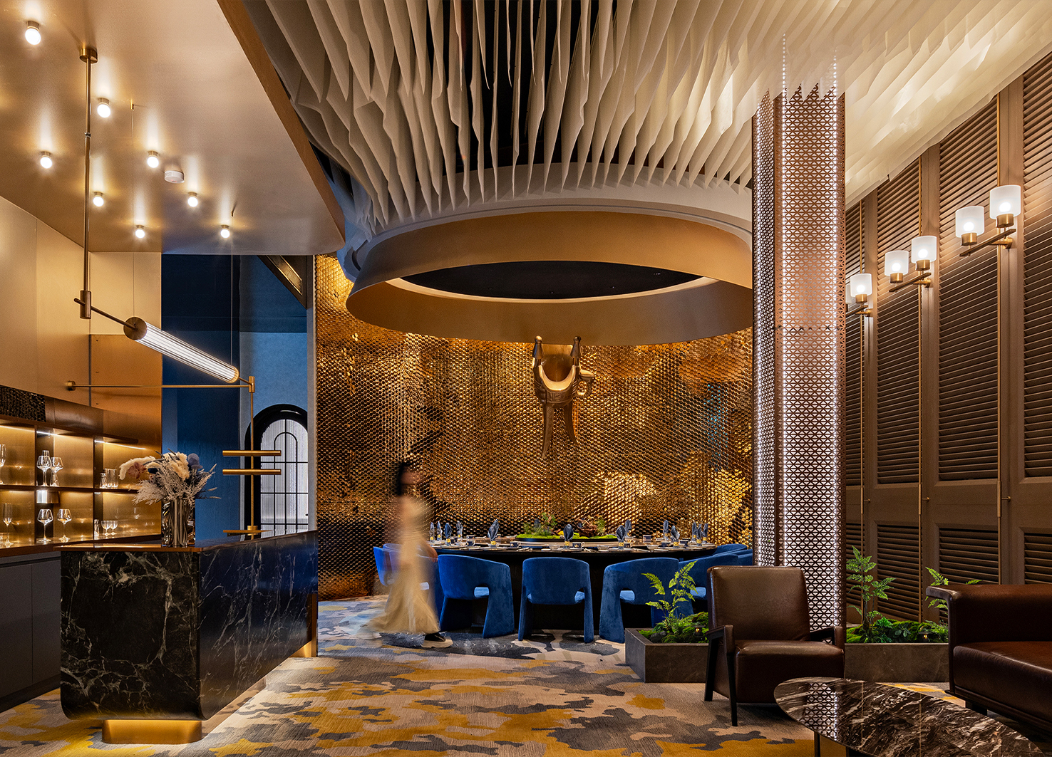 爵粤餐厅坐落于吉隆坡市中心,整体设计始于建筑外观:外立面利用巨大落地窗,外侧覆盖定制的蓝色冲孔铝板,以起伏的造型模拟被微风拂动的帷幕,犹如盛宴序幕缓缓拉开。空间叙事随楼层垂直展开,构建出清晰的体验序列:一楼大堂以“初韵清雅”定调,开放式布局迎接日常食客,入口的独立茶室,奠定了粤文化仪式感的初印象。二楼宴会厅转向“宴悦流光”,通过增加金色比例、运用弧形柱子造型与灵活隔断,营造隆重而欢聚的宴会氛围。三楼商务包间强调“尊享私宴”,深色调材质、艺术墙面与独立茶轩,营造出静谧尊贵的专属感。至四楼会所,达至“隐逸臻境”,空间天花采用层层布幔造型、高端定制家具与墙面艺术装置,集品酒、私宴与茶道于一体,代表品牌体验的顶峰。 色彩与材质是叙事的关键载体。色彩计划随楼层升高,从一楼的清新蓝橘,逐步融入更多香槟金、古铜金,直至顶层的浓郁大面金色,隐喻体验如佳酿般由浅入深。材质同样经历从自然石材、温润木质,到奢华金属、丝绸与皮革的过渡。每一个细节,从定制灯具的造型到门的弧度,从墙面艺术的构图和拼贴,呼应“爵”的弧线主题与海棠花符号。 爵粤餐厅不仅仅是一个用餐场所,更是一个通过空间进行文化转译与情感传递的典范。它将在地气息、国际视野与深厚的广府文化基因相结合,在吉隆坡打造出一个既有鲜明身份认同,又能面向世界的卓越餐饮空间。