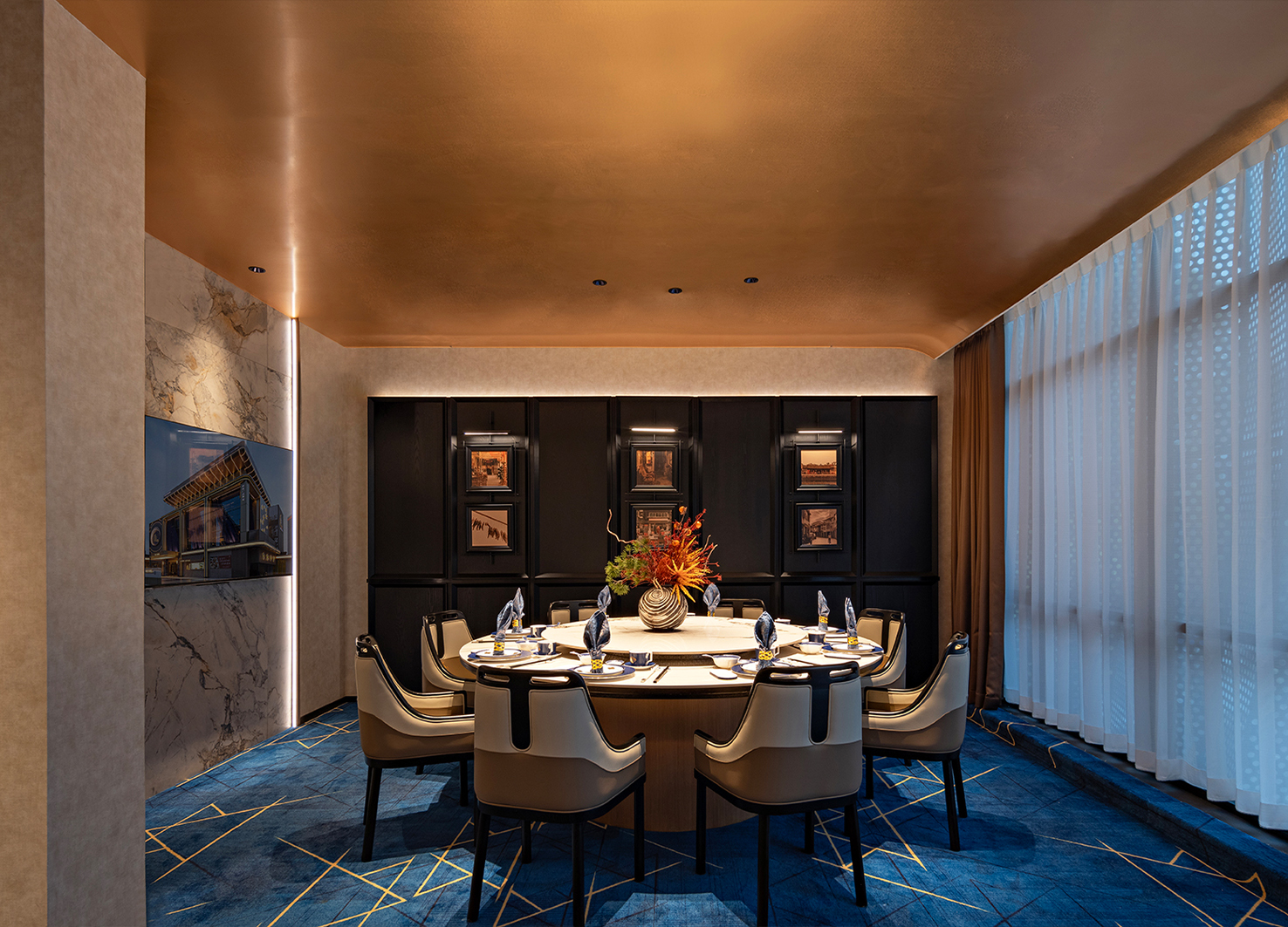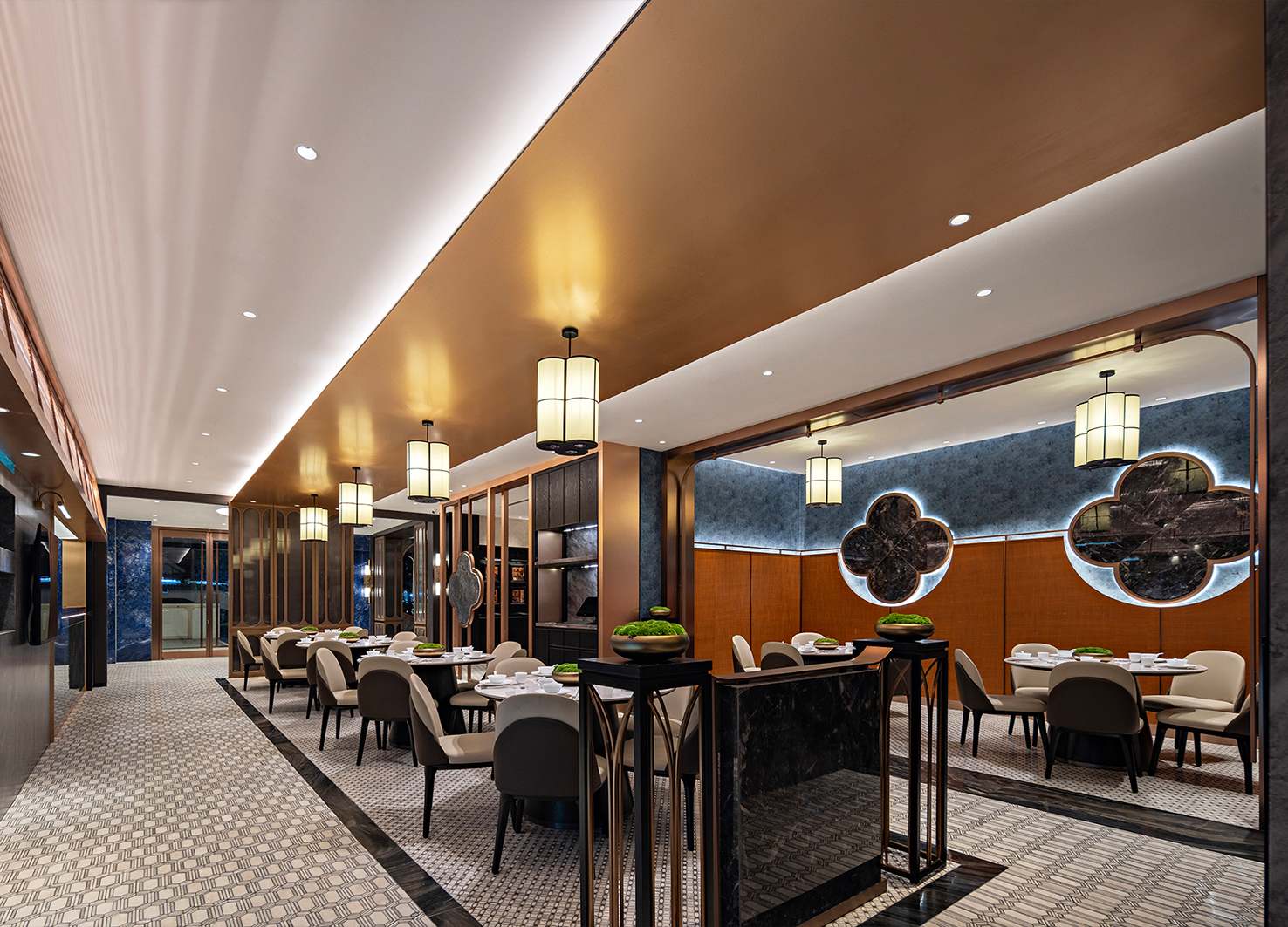 The building’s facade, with undulating blue perforated metal, suggests a curtain rising on the feast within. Inside, the journey begins with the vibrant public dining hall and progresses upwards through versatile banquet spaces and private suites to an ultra-private club. Unifying “Jue”-inspired arcs define the spaces. Design strategies like mirrored ceilings amplify space, while layered lighting and a material palette of stone, metal, and silk craft immersive atmospheres. This synthesis of symbolic form, cultural motifs, and refined materiality creates a cohesive narrative—a modern culinary destination deeply rooted in Cantonese tradition.