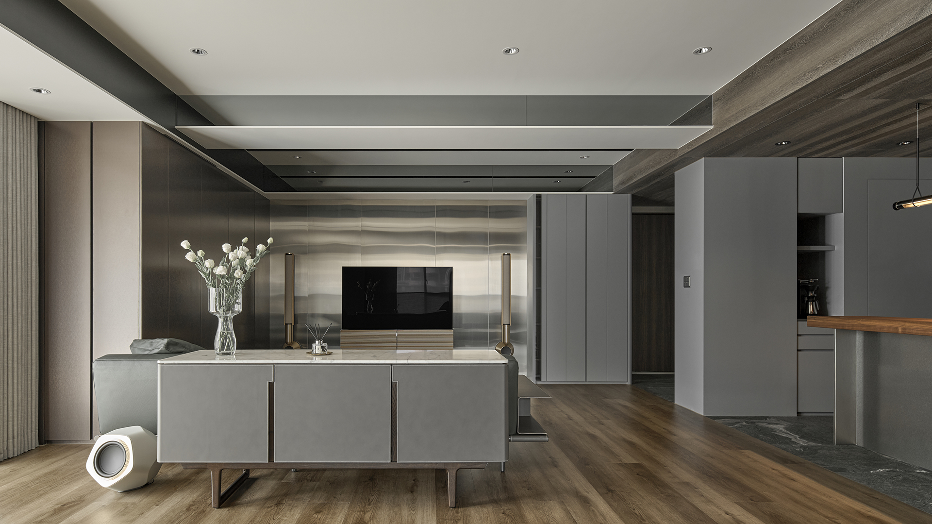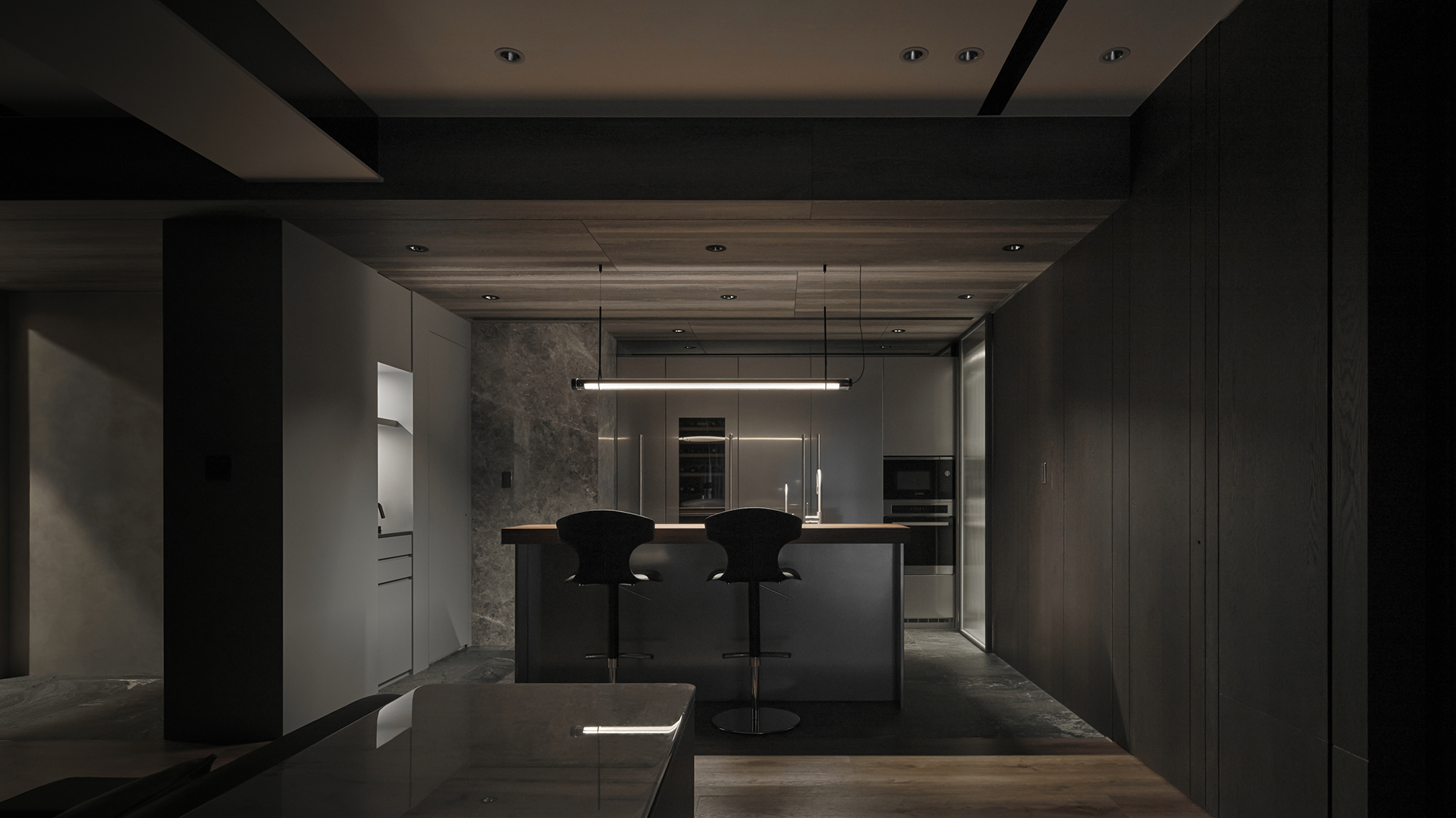 The core concept of this project is to create a residential environment that offers psychological stability between movement and pause. A restrained grayscale palette creates a calm atmosphere that meets occupants’ needs for privacy and emotional comfort. A box serves as the key structural element, integrating storage, circulation, and spatial definition. A central island becomes the core of daily interaction. At night, the space transforms into a private, understated lounge bar. The secondary bedroom is redefined as a flexible multi-purpose space. The design also reduces maintenance requirements and extends the residence's lifecycle value.