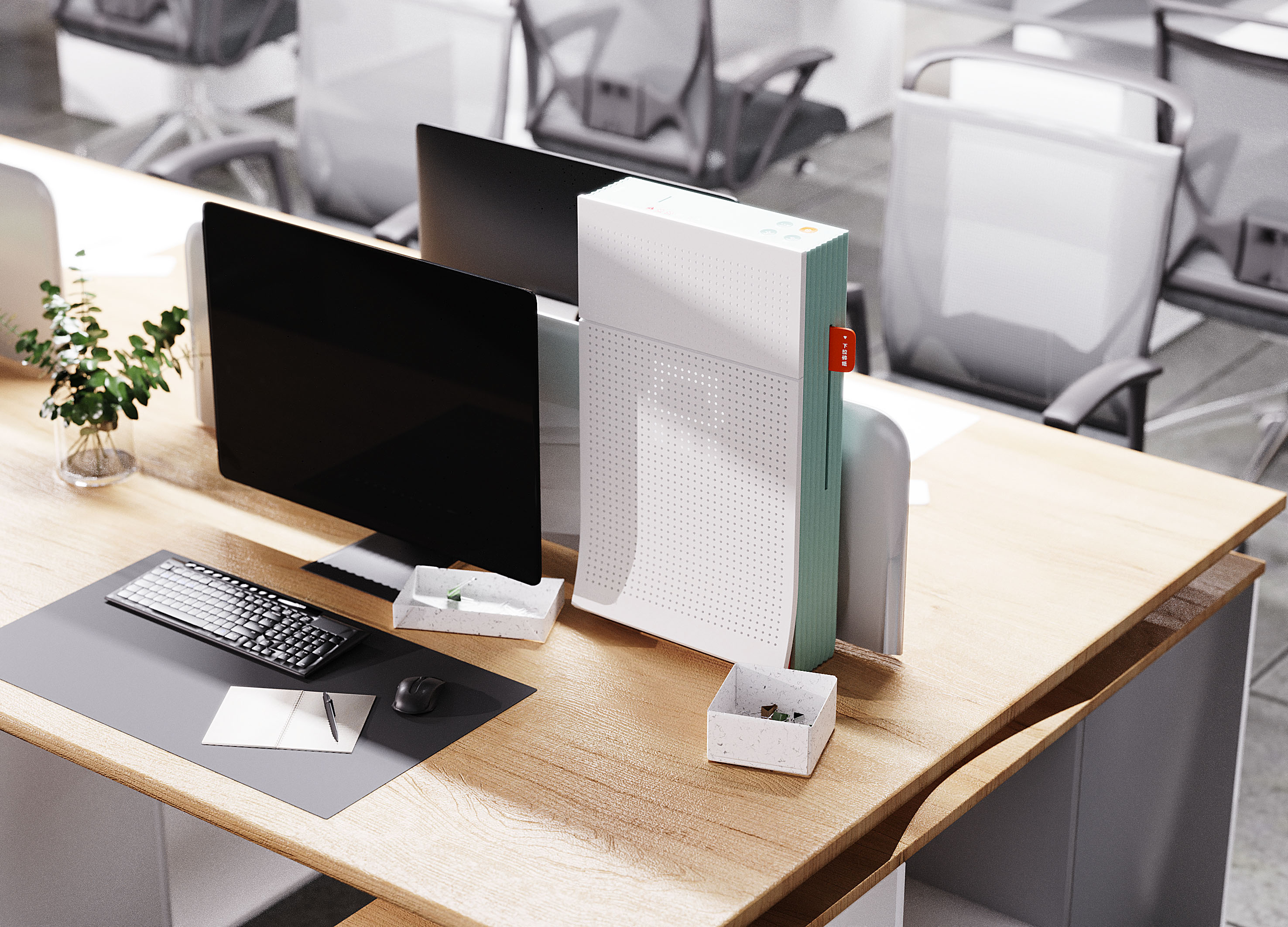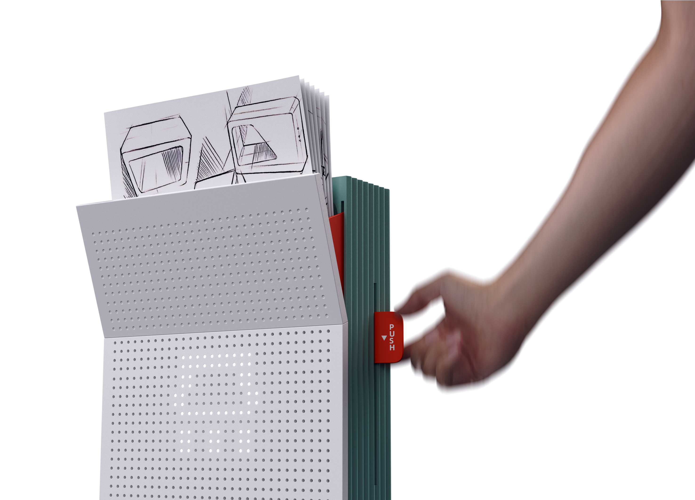 这是一个可以延长废纸生命周期的碎纸机。办公室对机密文件的粉碎需求很多,但是粉碎后的纸渣往往需要进一步清理和丢弃,这无疑是对资源的浪费。这一款碎纸机可以将废纸粉碎后经过加湿、干燥和压缩等步骤,压制成有折痕的厚纸板。用户可以根据折痕将纸板折叠成纸盒,用来存放小型的桌面物品,也可以作为桌面垃圾桶使用。 这样既延续了纸的使用周期,又能够减少垃圾袋等一次性或不可再生材料的使用,满足再利用的设计原则,符合可持续发展的设计趋势。 这款碎纸机不仅可以激发办公室内对环保和可持续发展的重视,形成更加绿色的办公文化,提升人们的环保意识,而且它还促进了资源的循环利用,减少了环境污染,有助于形成更加环保、节约、和谐的社会风尚,推动社会的多元化发展。