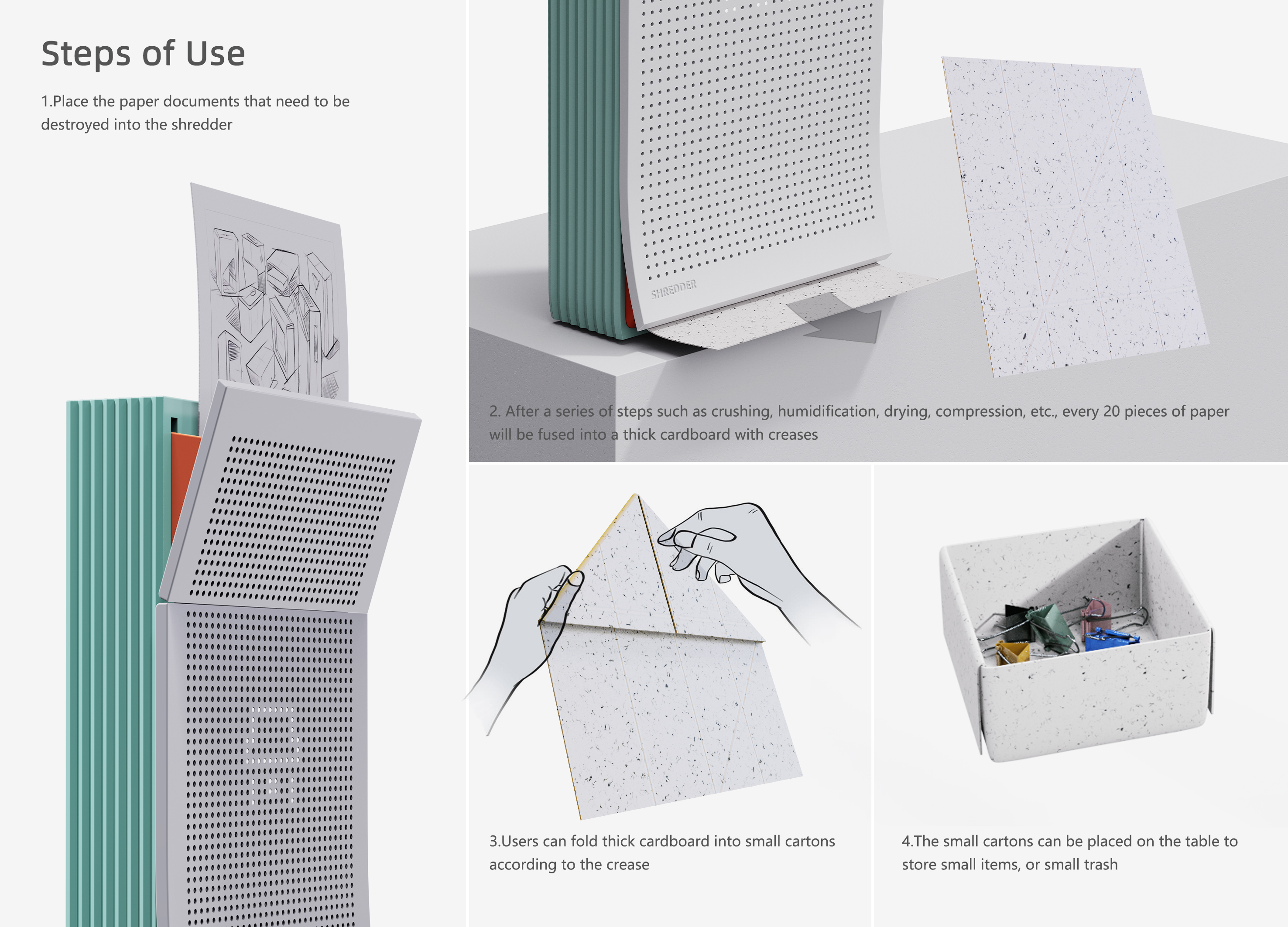 This is a shredder that can extend the service life of paper.The office often has to shred classified documents,but the shredded paper residue usually requires further cleaning and disposal,which undoubtedly leads to resource wastage.This particular shredder can process waste paper by shredding it,then subjecting it to steps such as humidification,drying,and compression to form foldable thick cardboard.Users can fold the cardboard along the creases to create paper boxes,which can be used to store small desktop items or serve as desktop trash cans.This approach not only extends the lifecycle of paper but also reduces the need for garbage bags.