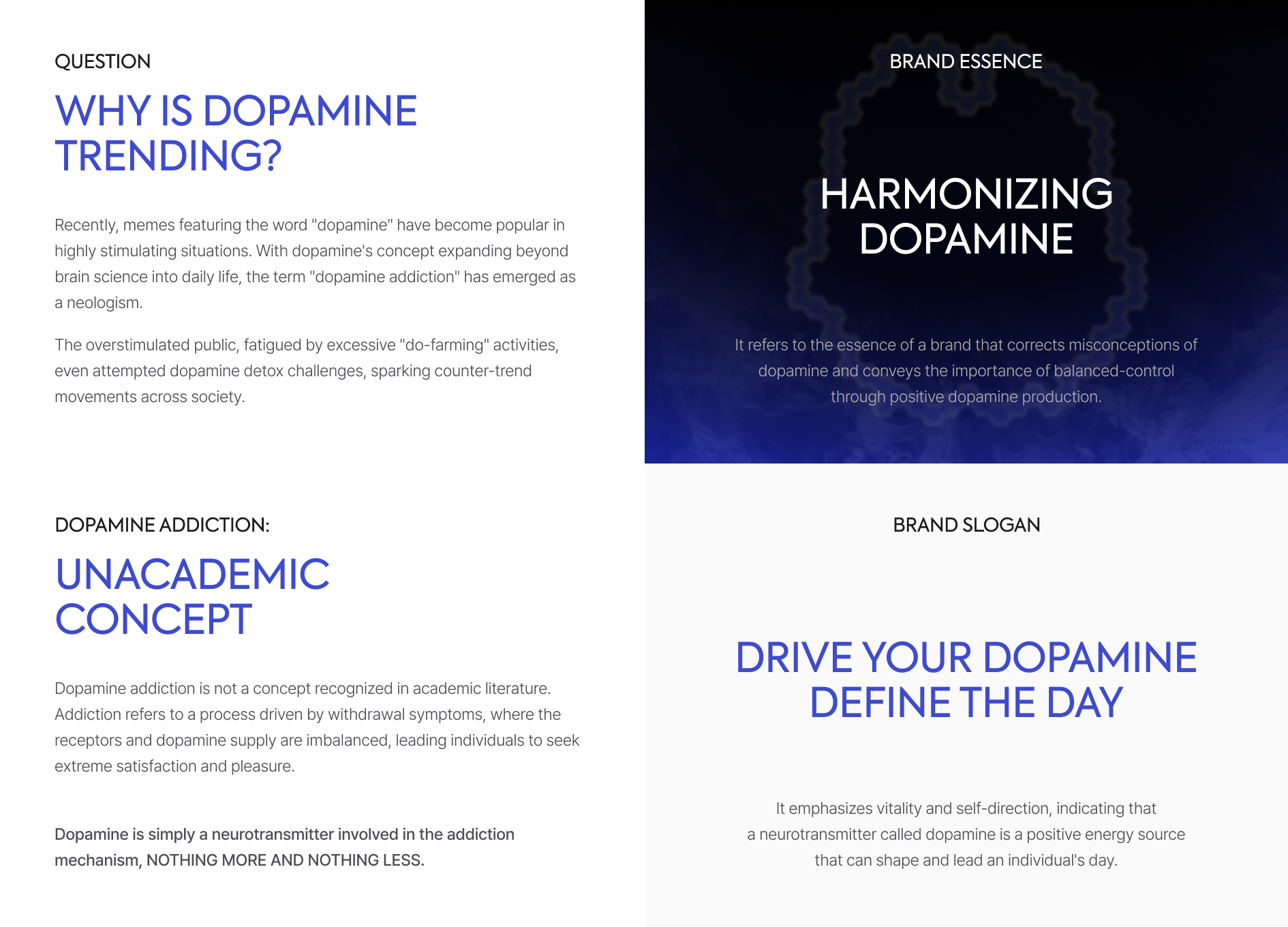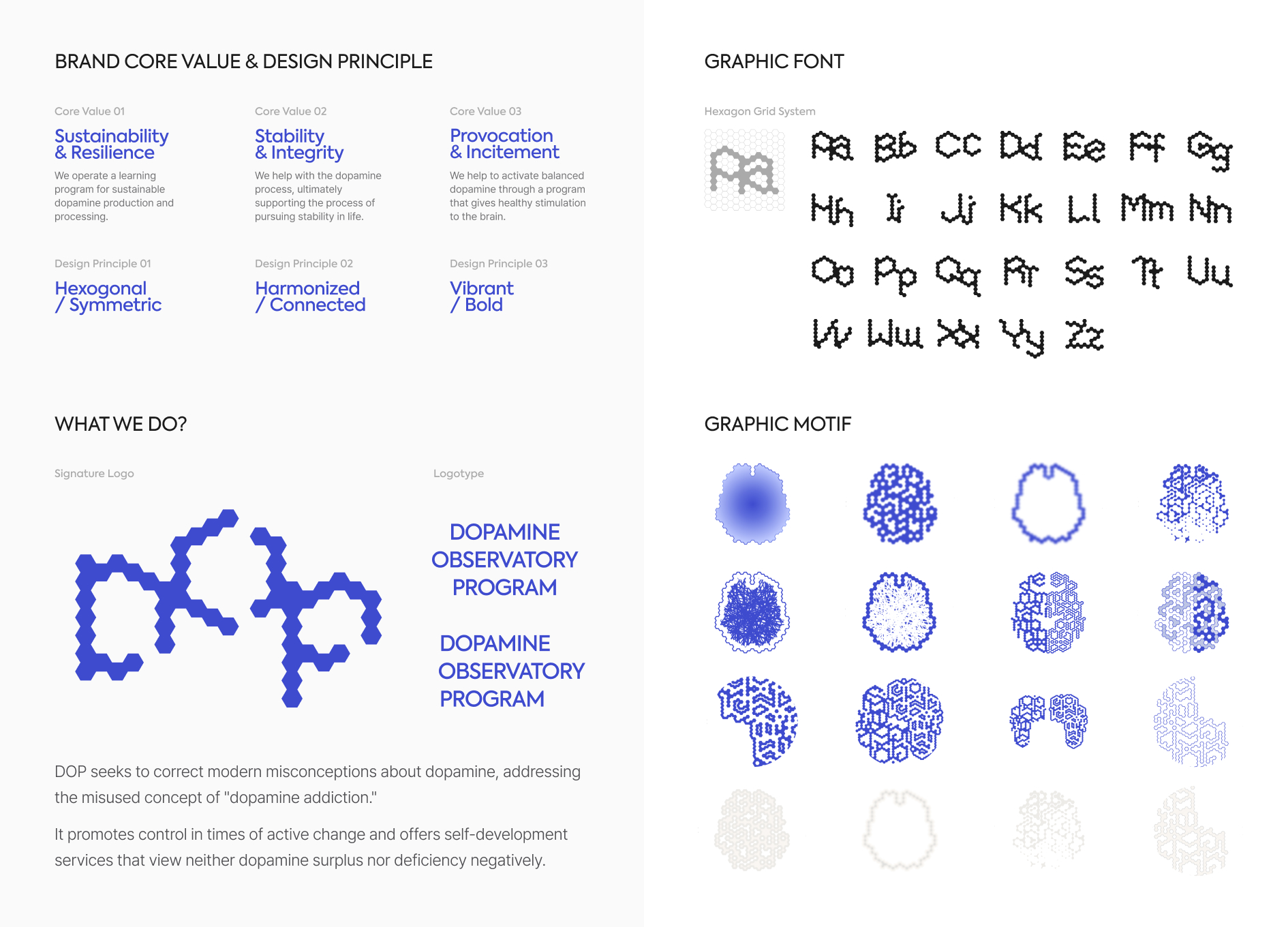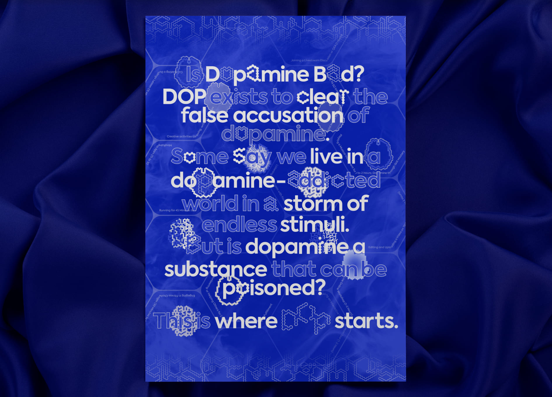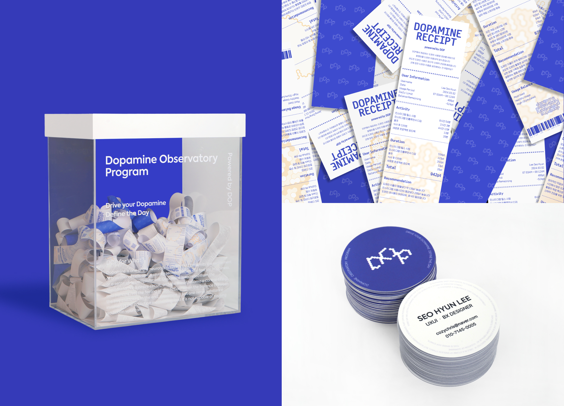 DOP은 도파민의 억울한 누명을 벗겨주고자 존재합니다. 혹자는 우리가 끝없는 자극의 폭풍 속 '도파민에 중독된 세상’에서 살아간다고 말합니다. 그러나 과연 도파민이 중독될 수 있는 물질일까요? DOP의 연구는 여기서부터 시작합니다. 도파민은 뇌신경 세포의 흥분을 전달하는 신경전달물질 중 하나로 기쁨이나 행복, 성취감을 느낄 때 분비됩니다. 도파민은 욕망회로인 중변연계와 통제회로인 중피질에서 분비되는데, 이 둘의 균형이 무너질 때 인간은 중독의 감정을 느낍니다. 이는 결국 도파민은 중독 메커니즘에 관여된 신경물질일 뿐, 스스로 중독을 유발할 능력이 없음을 뜻합니다. 도파민이 과도하게 분비되면, 사람들은 더 강한 자극을 필요로 하게 됩니다. 처음에는 간단한 즐거움으로도 만족할 수 있었던 사람들이, 그 자극에 익숙해져 더 큰 자극을 찾게 됩니다. 결국 균형 잡힌 삶을 설계하는 건 나 자신이며, 도파민 디톡스, 도파밍을 논하기 전에 삶의 태도를 돌아보는 것이 중요합니다.