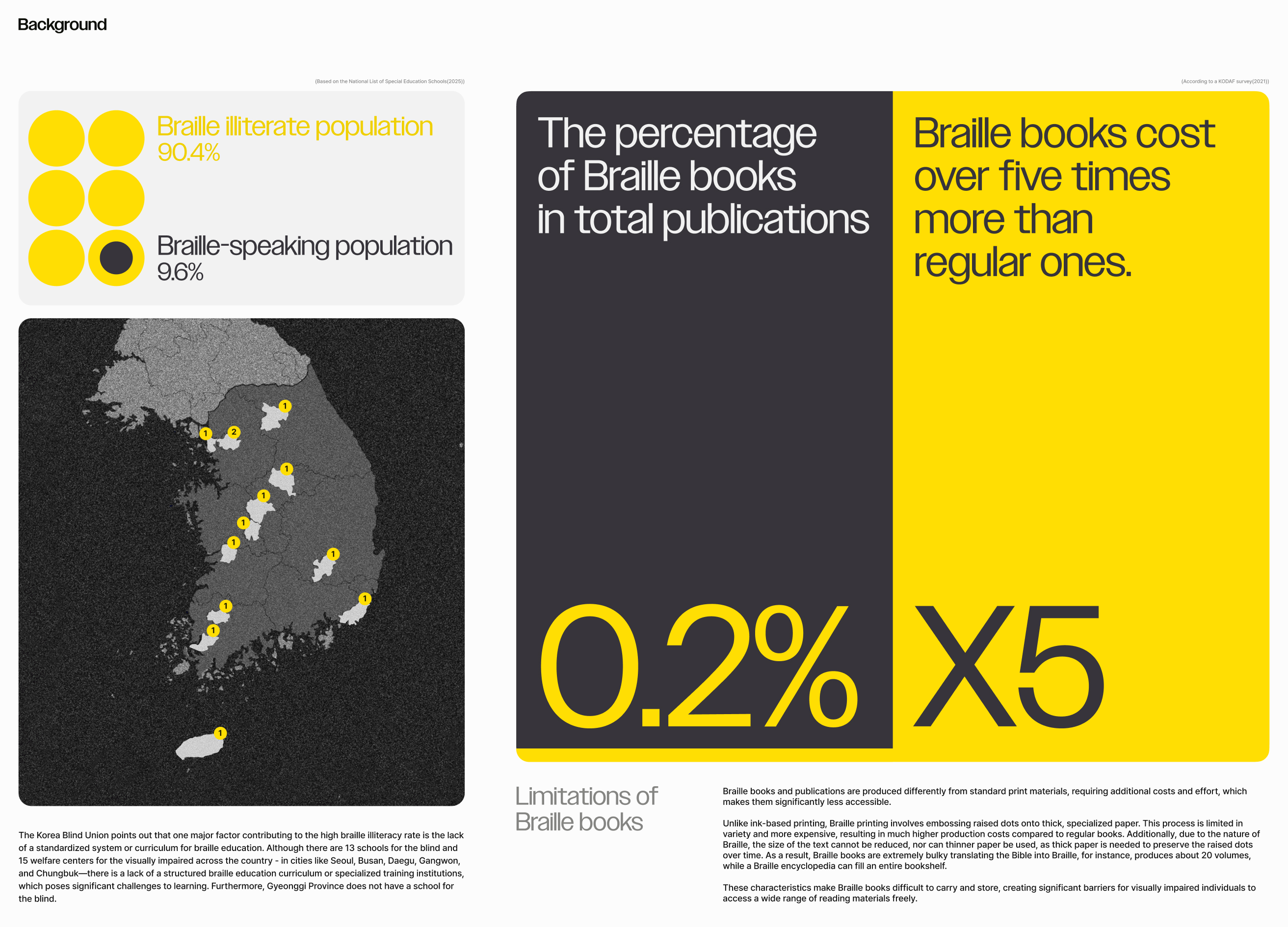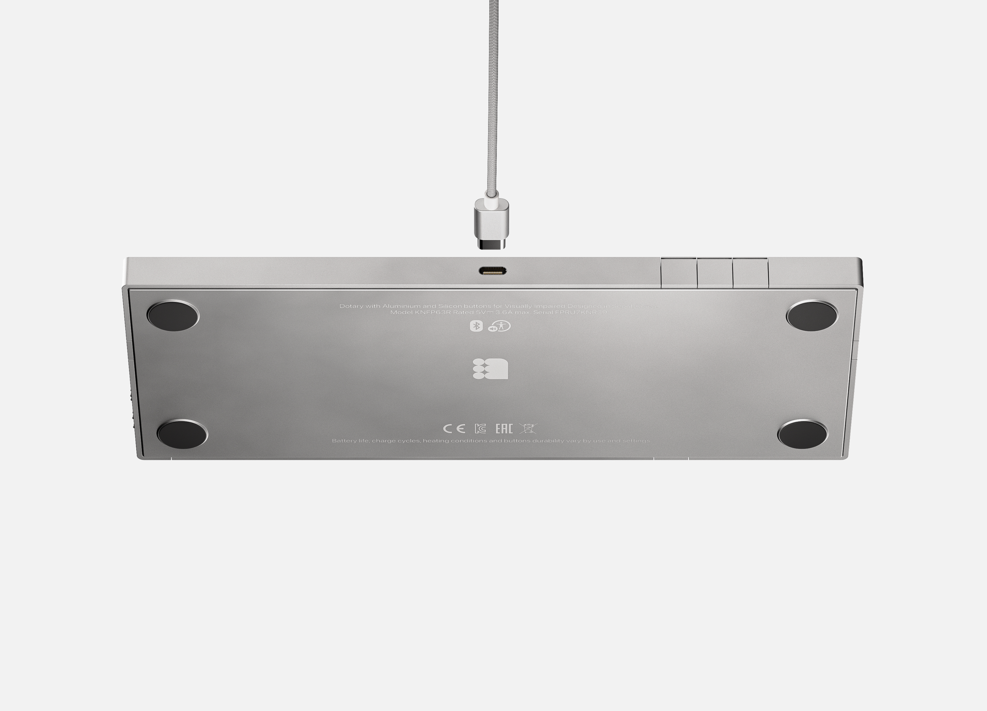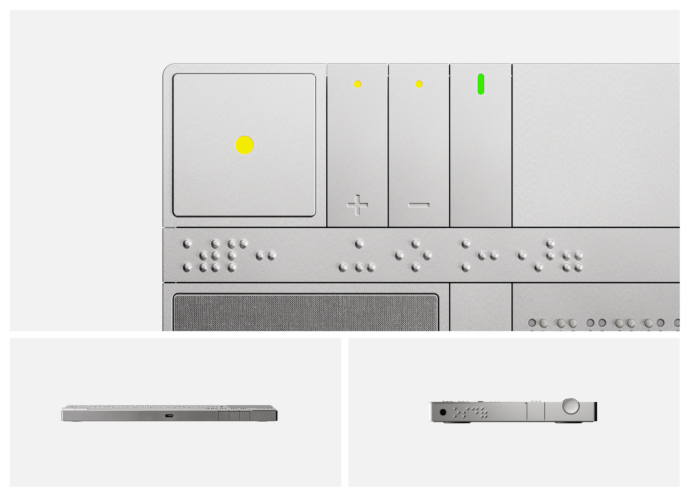 시각장애인의 약 90%는 점자를 읽지 못합니다. 점자 교육 체계의 부재와 교재 부족, 그리고 부피가 크고 비싼 점자책은 독서 접근성을 크게 제한합니다. 교육 인프라의 부족, 점자 교재의 희소성 등은 점자 문맹률을 높이는 주요 요인으로 작용하고 있습니다. Dotary는 이러한 문제를 해결하기 위해 고안된 점자 E-Book 디바이스입니다. 일반 텍스트를 실시간으로 점자로 변환해주는 기술을 기반으로, 시각장애인이 점자를 배우며 동시에 독서를 즐길 수 있는 학습형 독서 기기입니다. Dotary는 대비가 높고 인지성이 뛰어난 노란색 포인트 컬러를 적용하여 시각 인식이 남아 있는 사용자의 접근성을 높였으며, 각 버튼 하단에 점자 표기를 삽입해 촉각만으로 기능을 구분할 수 있게 했습니다. 내장 스피커는 음성 안내를 제공하여 사용자가 메뉴를 보다 직관적으로 탐색할 수 있도록 돕습니다. 우측 상단의 두 개의 노브를 통해 도서의 카테고리와 제목을 선택하고, 선택 버튼을 누르면 책이 점자로 변환되어 출력됩니다. 내장 배터리를 탑재하여 외출 시에도 휴대가 가능하며, 부피가 크고 무거운 점자책을 대체할 수 있습니다. 이를 통해 시각장애인도 장소의 제약 없이 공원, 카페, 대중교통 등 다양한 공간에서 자유로운 독서 경험을 누릴 수 있습니다.