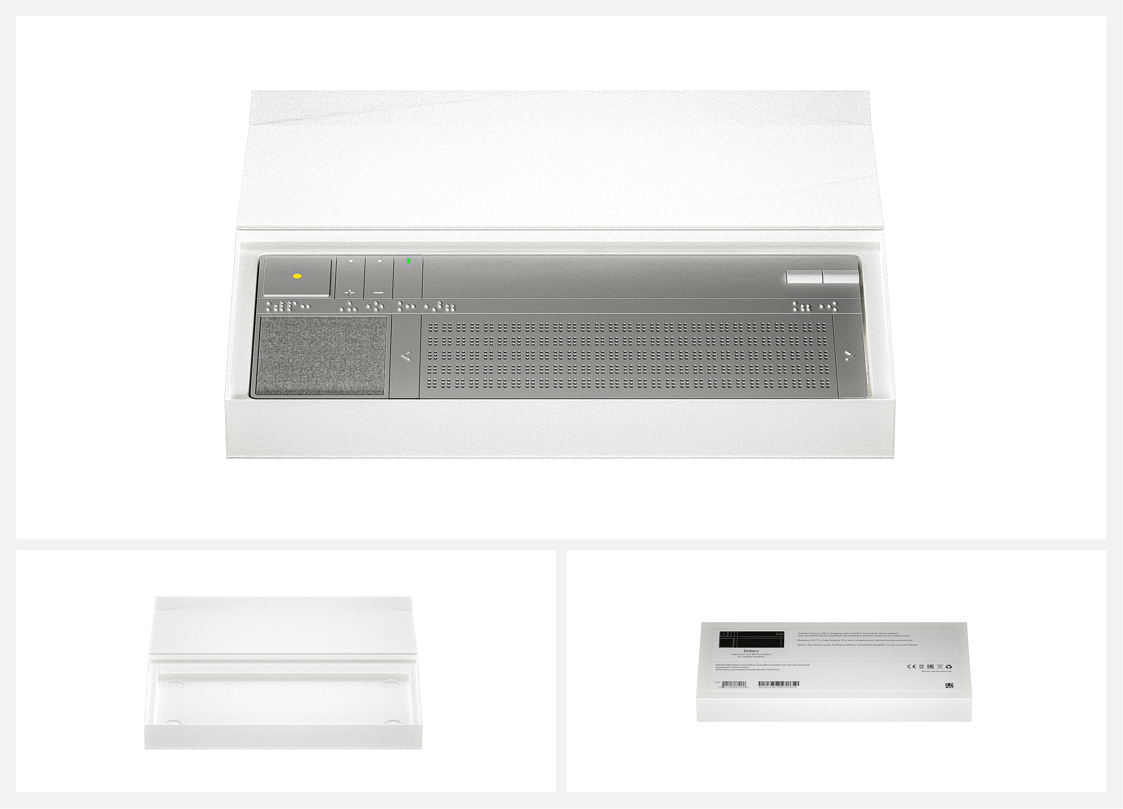 About 90% of visually impaired people cannot read Braille, largely due to the lack of structured education systems, limited learning materials, and the bulky, expensive nature of Braille books. Dotary is a Braille E-Book device designed to address these issues by converting digital text into Braille in real time, allowing users to learn and read simultaneously. Featuring high-contrast yellow accents, Braille-labeled buttons, and voice guidance, it provides an intuitive, accessible experience. With dual control knobs and a built-in battery, Dotary enables portable, barrier-free reading anytime, anywhere.