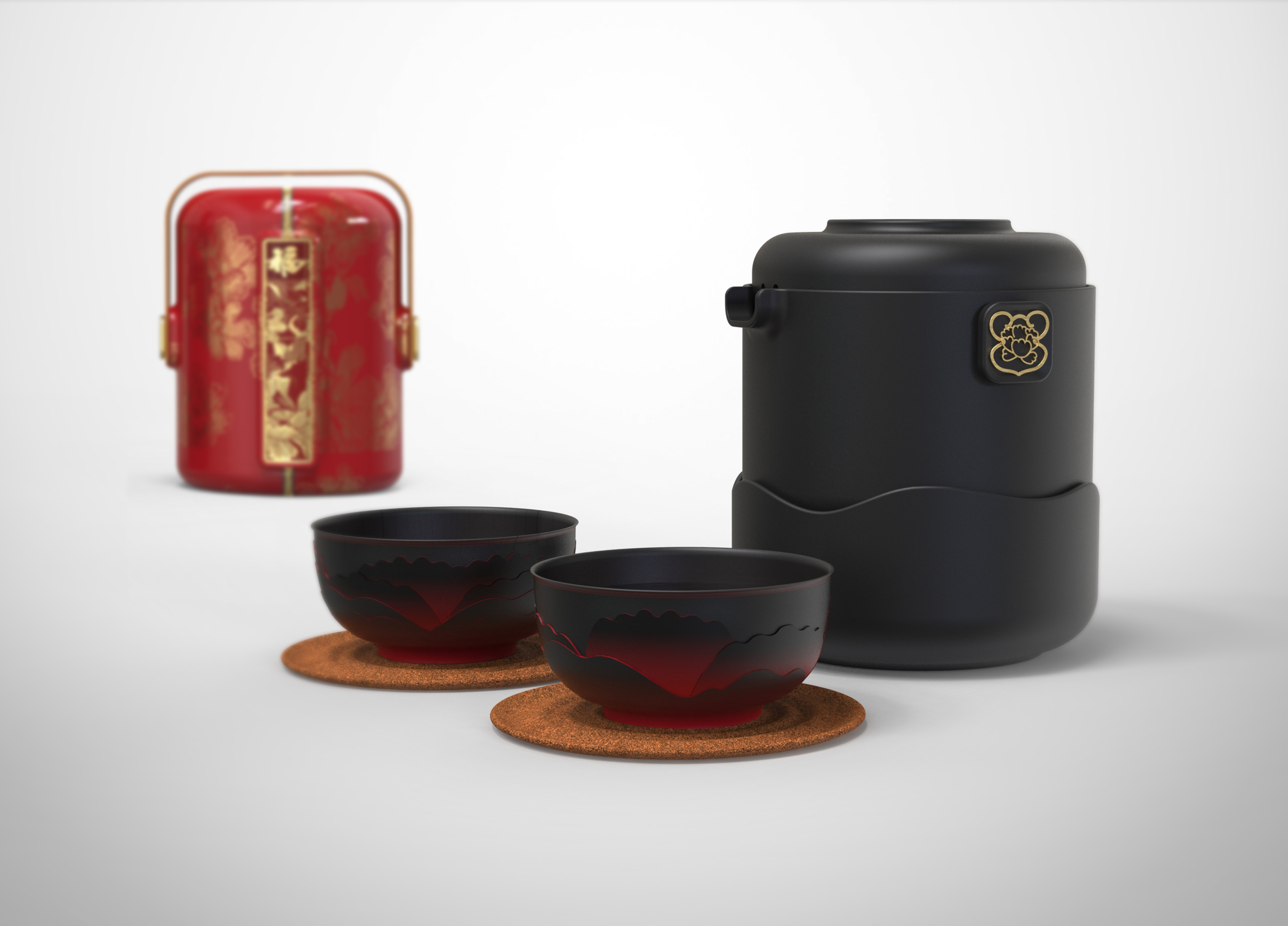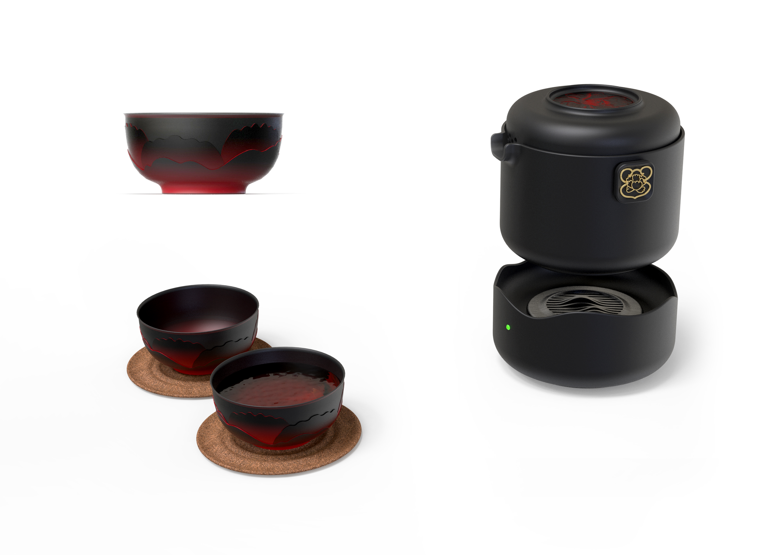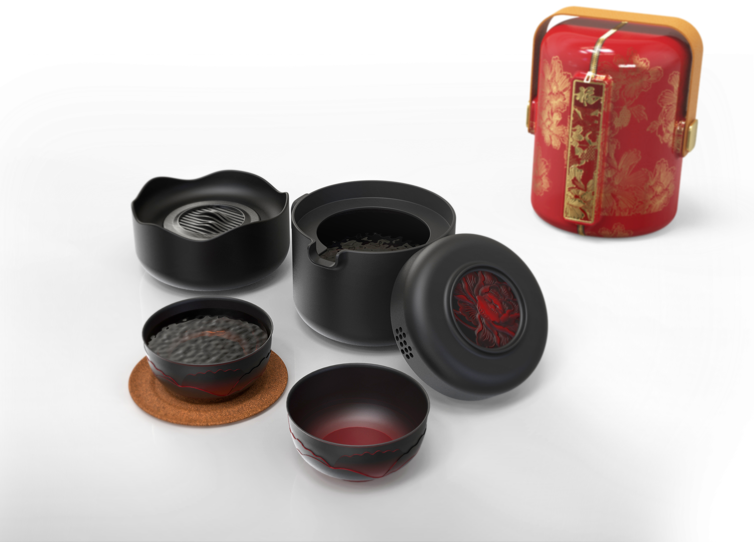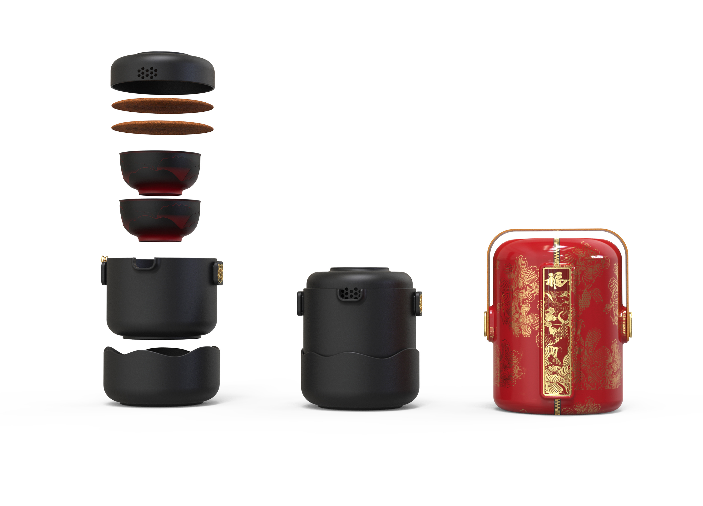 本产品的核心创新在于集成充电式智能加热底座,支持移动电源与直接插电双模式供电。底座配备智能温控芯片及LED状态指示灯,配合科学的散热系统,可通过手机APP调节温度,具备在多种户外环境下安全、稳定地提供适宜水温,真正实现“随时随地的热茶自由”。全套系统包括茶壶、茶杯(2个)、杯垫(2个)和智能加热底座,可完美收纳于便携保护外盒内。外盒采用防水防震材料制作,配备符合人体工学的提手设计,实现了茶具的“一体化收纳、即开即用”,为户外活动与差旅出行提供了极大便利。产品采用哑光黑色釉面与红色牡丹纹样相结合的设计语言,辅以传统“福”字与金色纹样点缀,在传承东方茶道文化韵味的同时,契合现代审美品味。整体设计体现了传统与现代的和谐统一,赋予产品独特的艺术价值。通过“智能加热系统”、“茶具模块化设计”和“一体化收纳方案”的三重创新,本产品成功将完整的茶道体验浓缩于便携系统中。使用者可在户外轻松享受具有仪式感的品茗时光,满足现代人亲近自然与追求品质生活的双重需求,真正实现了“茶室随身、意境随行”的设计愿景。