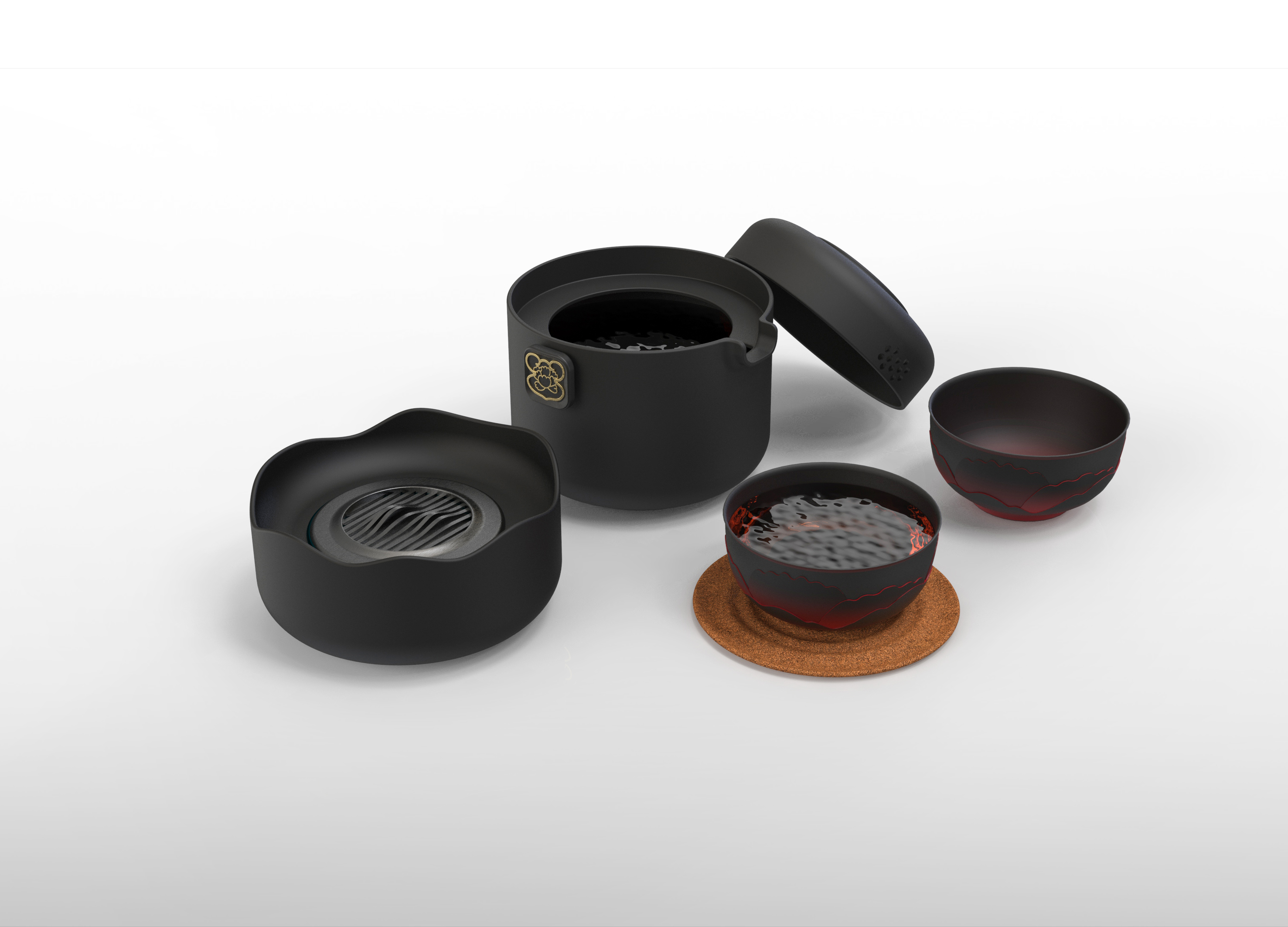 The modular-designed tea set components can be fully stored in a waterproof and shockproof portable case, allowing for instant use upon opening. Incorporating Eastern aesthetic elements such as matte black glaze and peony patterns, the product enables users to experience a ritualistic tea ceremony even outdoors. With an overall design concept of a "mobile tea room," it integrates three key functions—smart heating, modular storage, and cultural expression—to meet modern users' dual needs for outdoor tea enjoyment and connecting with nature.