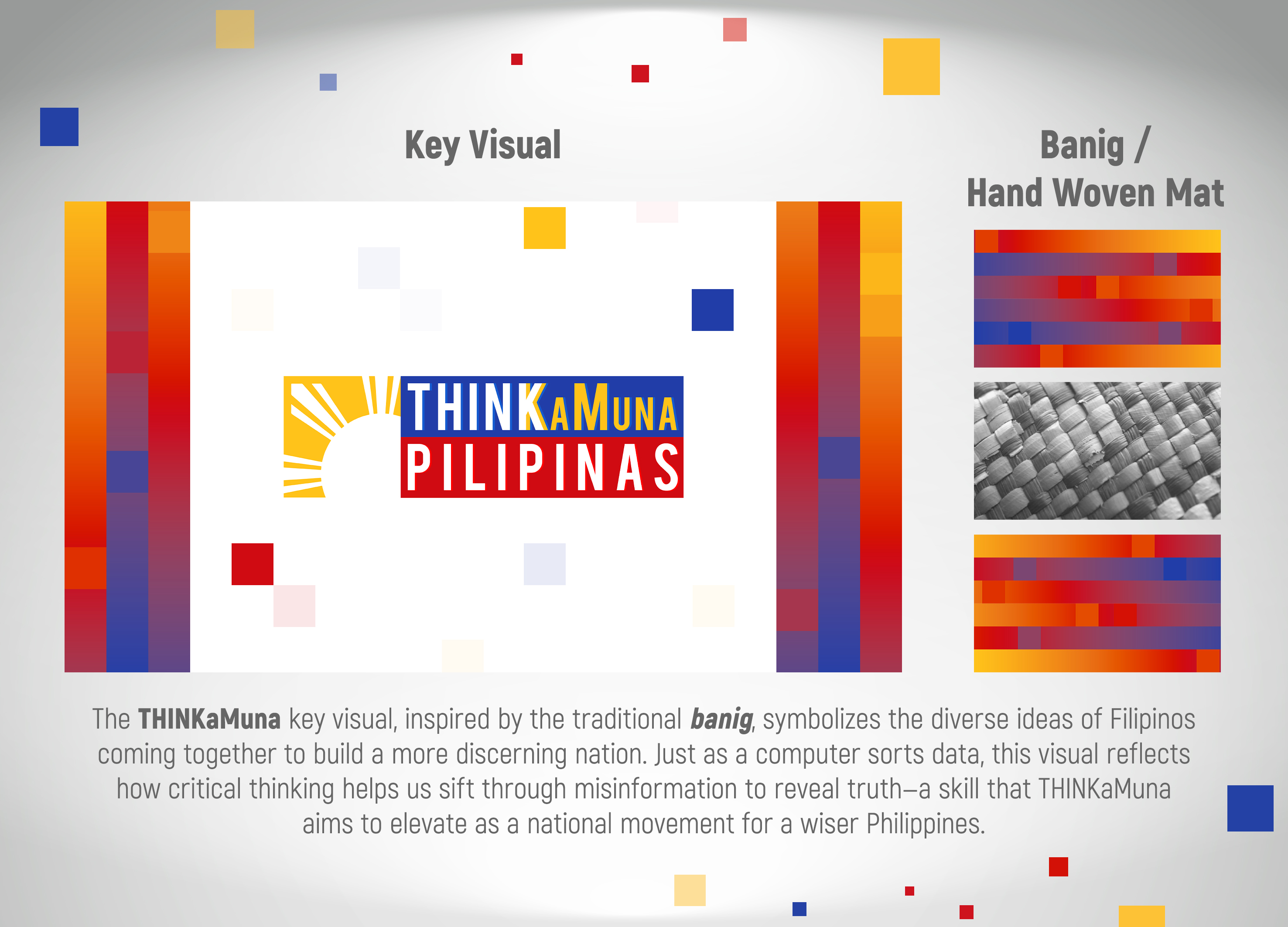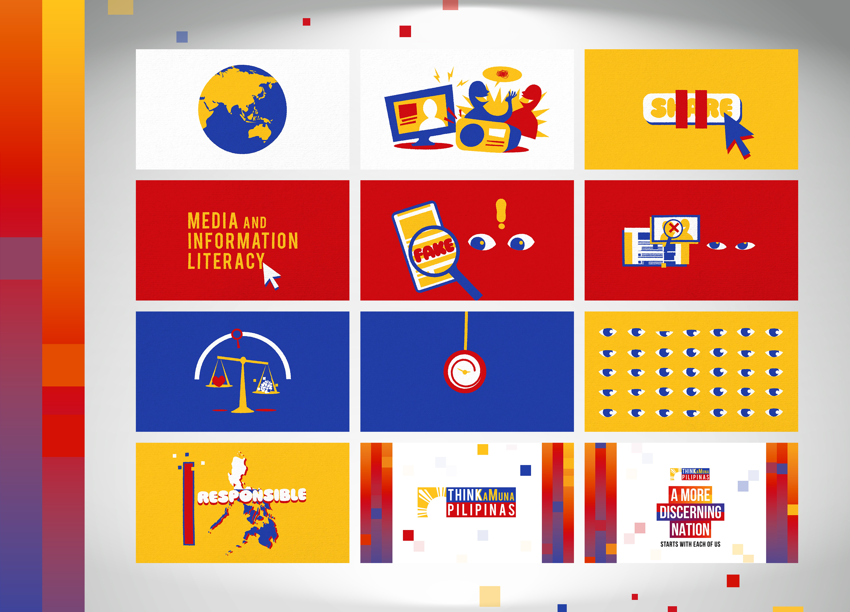 The THINKaMuna Pilipinas visual ecosystem is rooted in a tapestry-like design inspired by Philippine patterns, symbolizing unity in fostering a discerning nation. This tapestry, equally similar to a computer's defragmentation process, visually represents the sorting and verification of information. The logo, featuring Philippine flag colors and a rising sun, reflects national pride and a country’s commitment to truth. Together, these elements capture the campaign’s mission: to inspire critical thinking, responsible sharing, and informed decision-making across the Philippines—laying the groundwork for a resilient, misinformation-free society.
