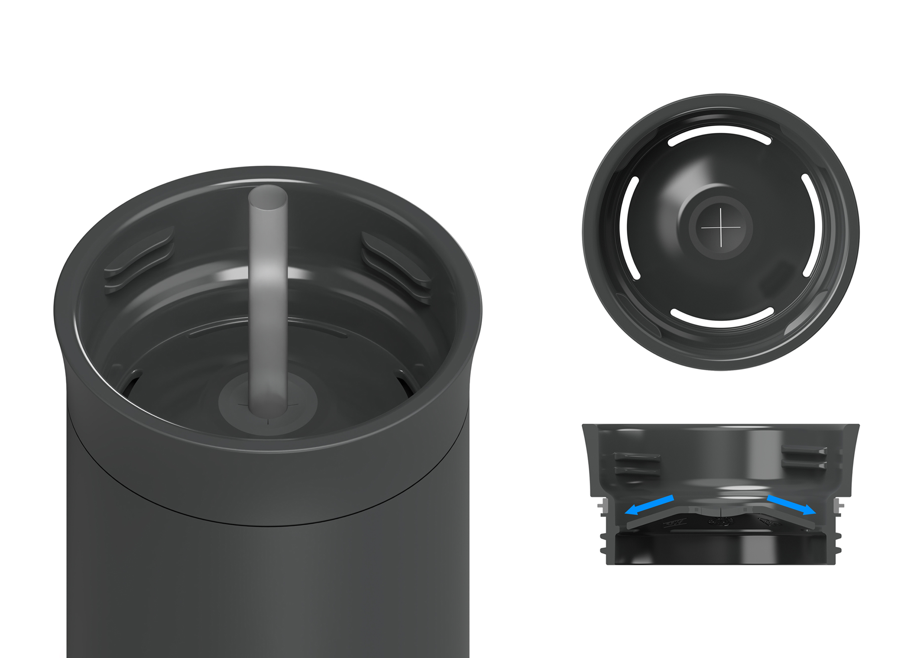 중간의 ‘음용 캡’은 즉각적인 음용에 수월한 컵의 강점이 적용된 캡입니다. 곡선 형태는 입술의 편안한 안착감을 고려한 인체공학적 디자인입니다. 또한, 1개의 음용구로 방향성이 정해진 기존 시장의 텀블러와는 다르게, 4개의 음용구를 가지고 있어 360도 다양한 각도에서 빠른 음용이 가능합니다. 또한, 정중앙의 +형태는 빨대 사용 시 빨대의 흔들림을 막아줍니다.