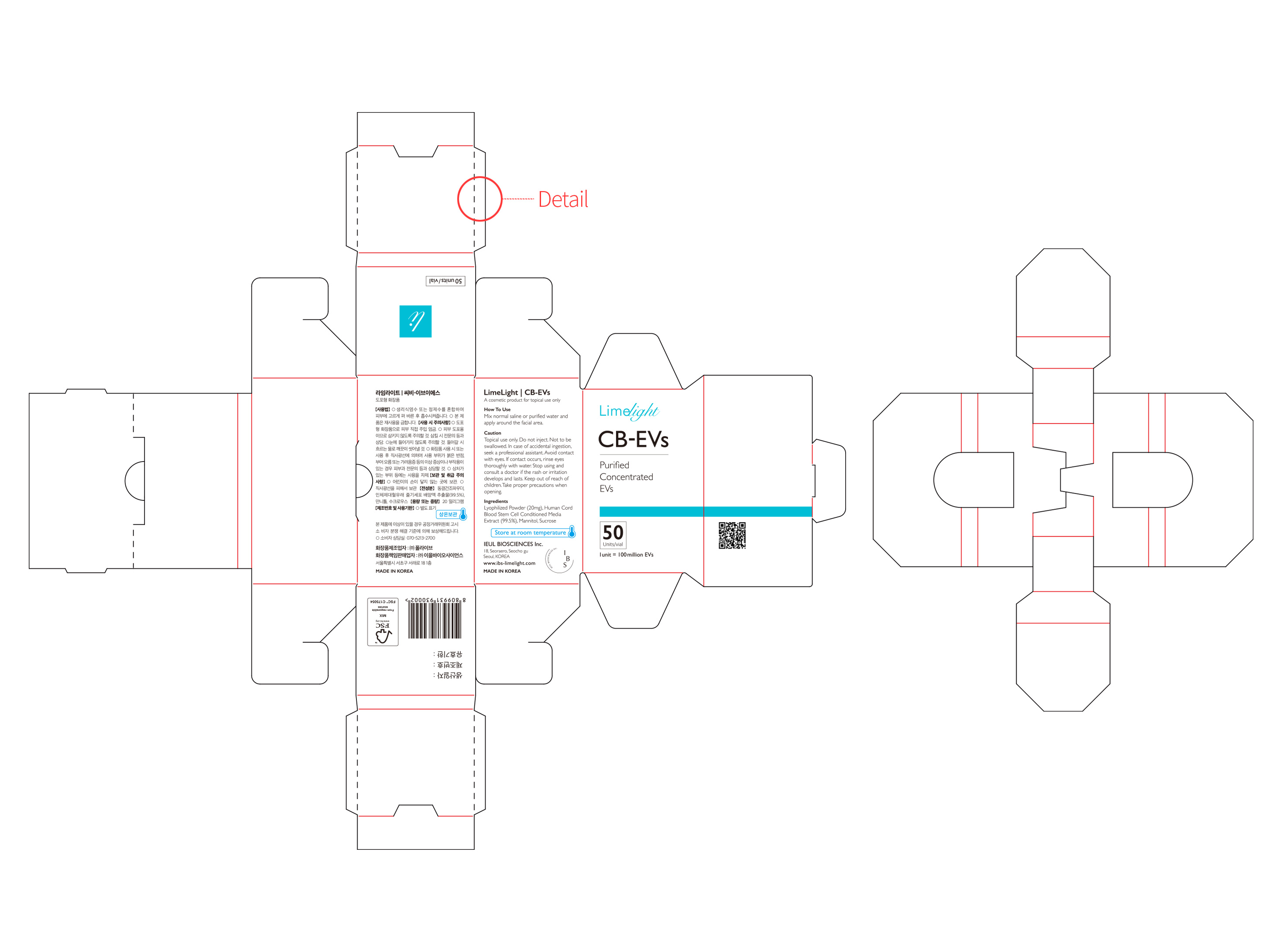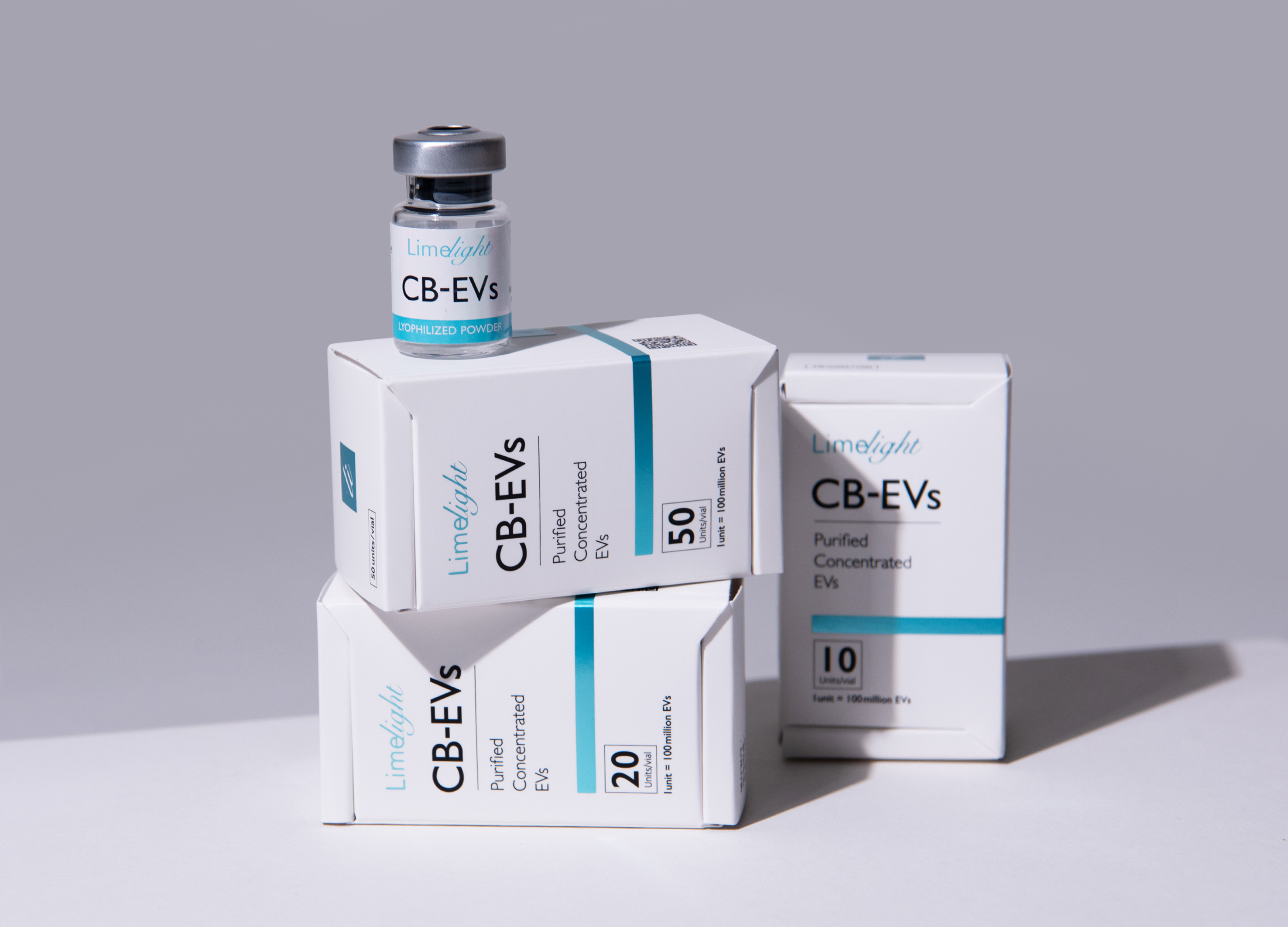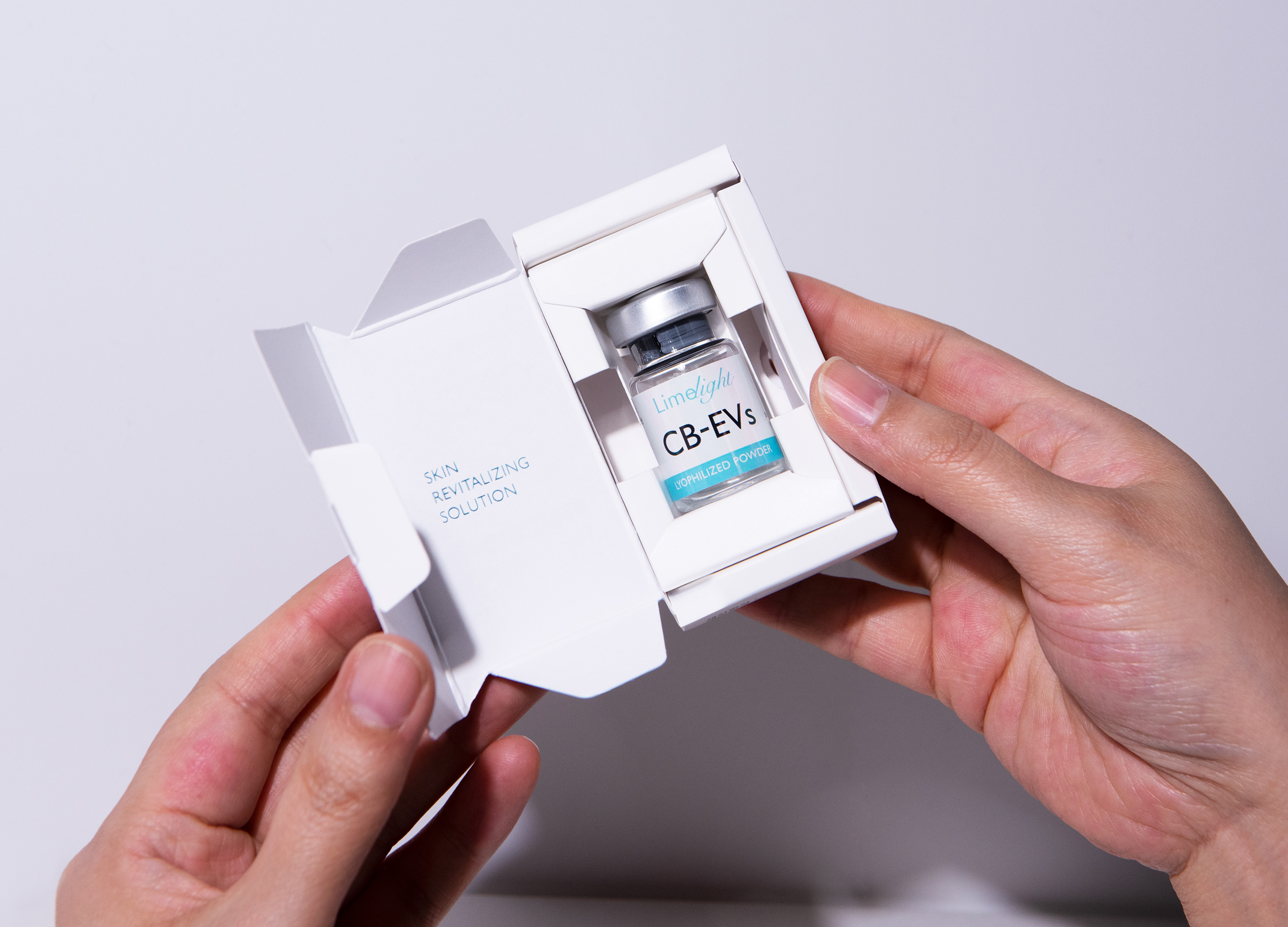 LimeLight CB EVs, a premium freeze-dried exosome powder with 99.5% umbilical cord-derived stem cell culture extract, is designed exclusively for medical institutions. The packaging reflects its "Medicine" concept, combining medical precision and luxury through pearl-white paper, soft matte coating, teal accents, and glossy foil stamping.