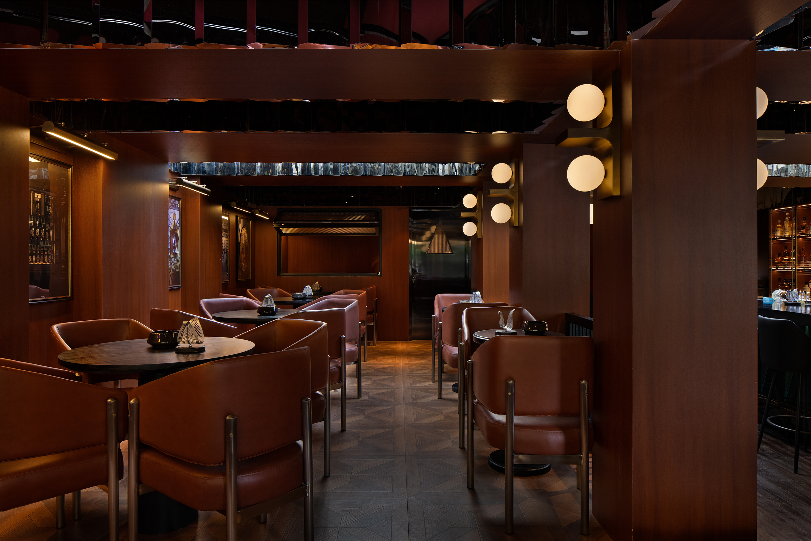 当我第一次去到现场测绘时,二层屋面一片小而紧凑的采光让我非常兴奋和意外,当时阳光正好从采光口洒下来,我的第一反应是,它已经具备了白天和夜晚不同的姿态、情绪和体验。我随即开始构想如何营造两种或多种不同的空间氛围。而营造是用各个部件来制造一个有意义的整体艺术,当然,这些是建立在平面规划的基础之上。我决定用干净简单的几何体块来叙述外立面,这很当代,但细节中却带有古典的韵律和节奏,至此我觉得还不够,冲突还没有到达高潮,于是我添加了一个挑台,放置一个古典雕塑。这个时候,我认为情节的刺激性和重要性才彰显出来。纯黑且轮廓硬朗的形体,古典雕塑的温情与关怀,戏剧性和力量感兼备,这种极具张力却并不繁杂的审美,给予路过的人群更多可能性的暗示。二楼的空间氛围,如我所构思的基本一致,一切都如其所有的那样,一切都各就其位,没有抵触冲突、没有夸张的安排、没有批判、没有企图,我像一位导演一样,有序地安排着各部门、各岗位的工作。覆盖式的木饰面,竖纹,肯定而明确,硬派且温情。镜面不锈钢的等高位环绕,打破干涩的平静,折射出的光和影像,随着空间内人的活动而时刻变化,时而冷淡、时而热烈、时而喧闹、时而静谧,暧昧不明。
