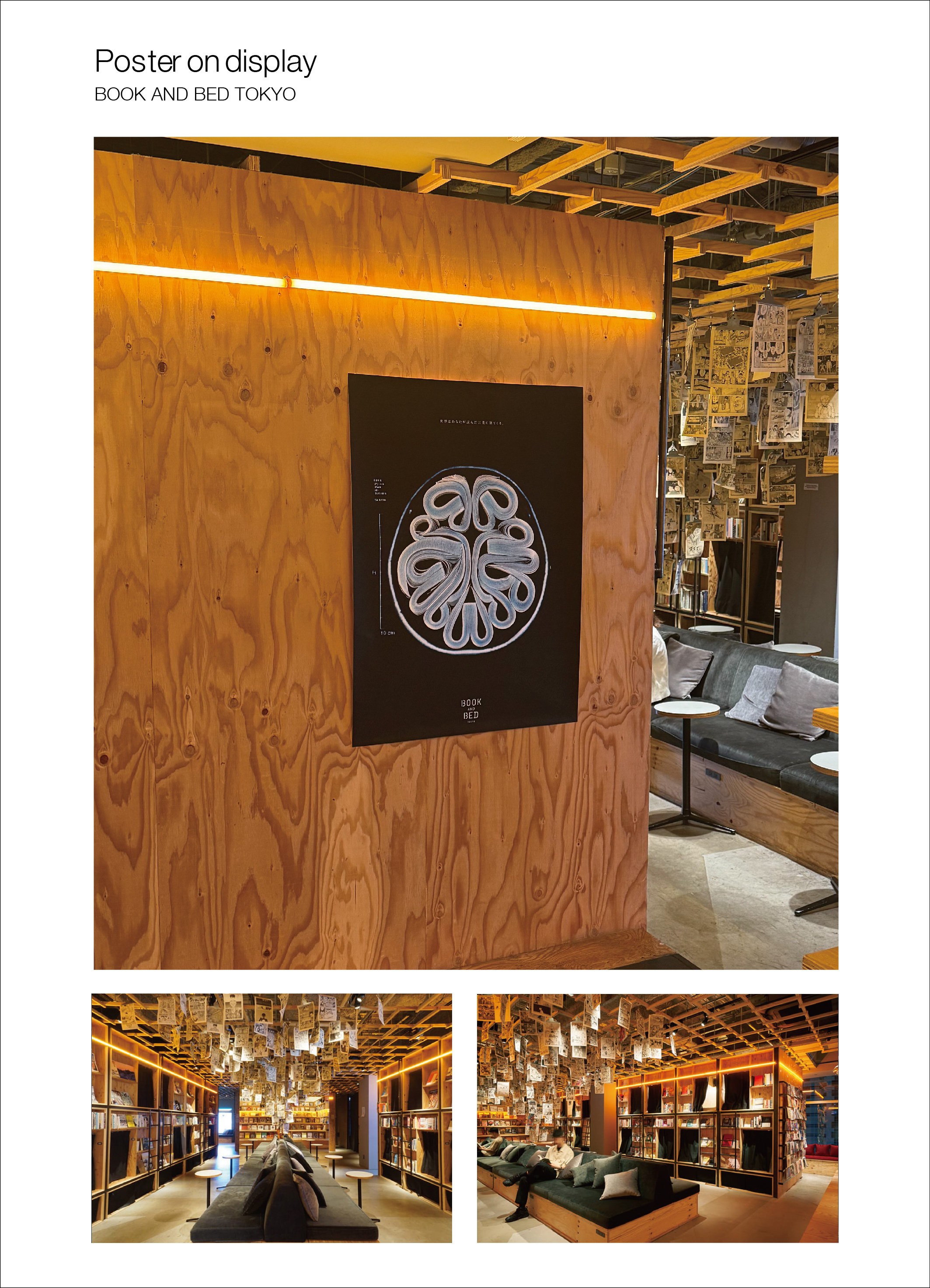 BOOK AND BED TOKYOは、「泊まれる本屋」という独自のコンセプトを持つ宿泊施設です。このポスターは、「本を読むことで世界の見え方が変わる」という体験を視覚的に表現することを目的に制作されました。デザインの中心には人間の脳のCT画像をモチーフとしたビジュアルを採用し、その内部構造をすべて“本”で構成しています。これは、読書によって思考や知覚が再構築され、私たちの脳=世界の理解そのものが変化していくことを象徴しています。一見すると医療画像のように見えますが、そこに「本」という温かみのある要素を重ねることで、知と感性の融合を表現しました。よく見ると本でできているという発見が静かに印象を残し、見る人に読書の力と知の変容を感じさせるポスターです。
