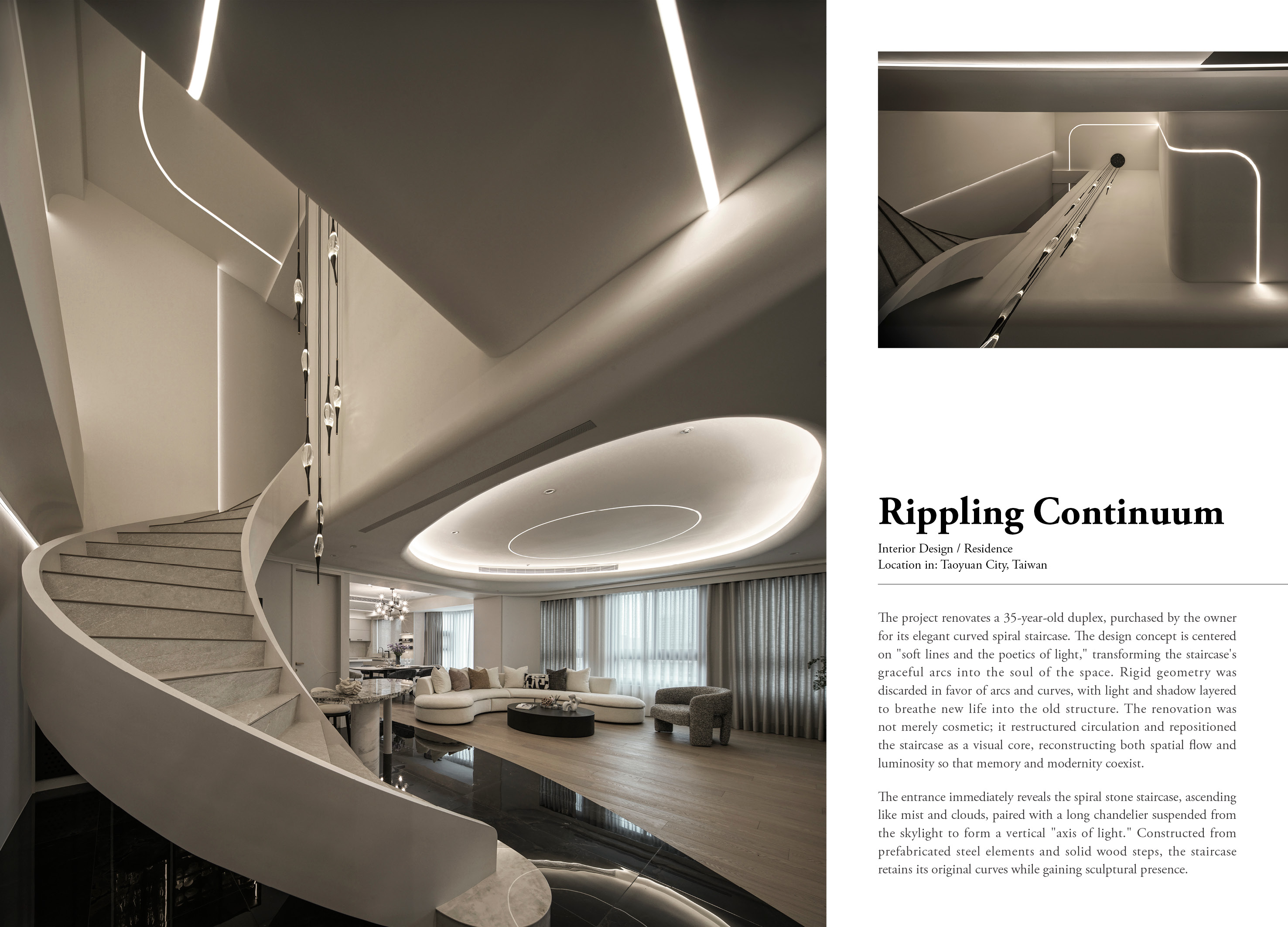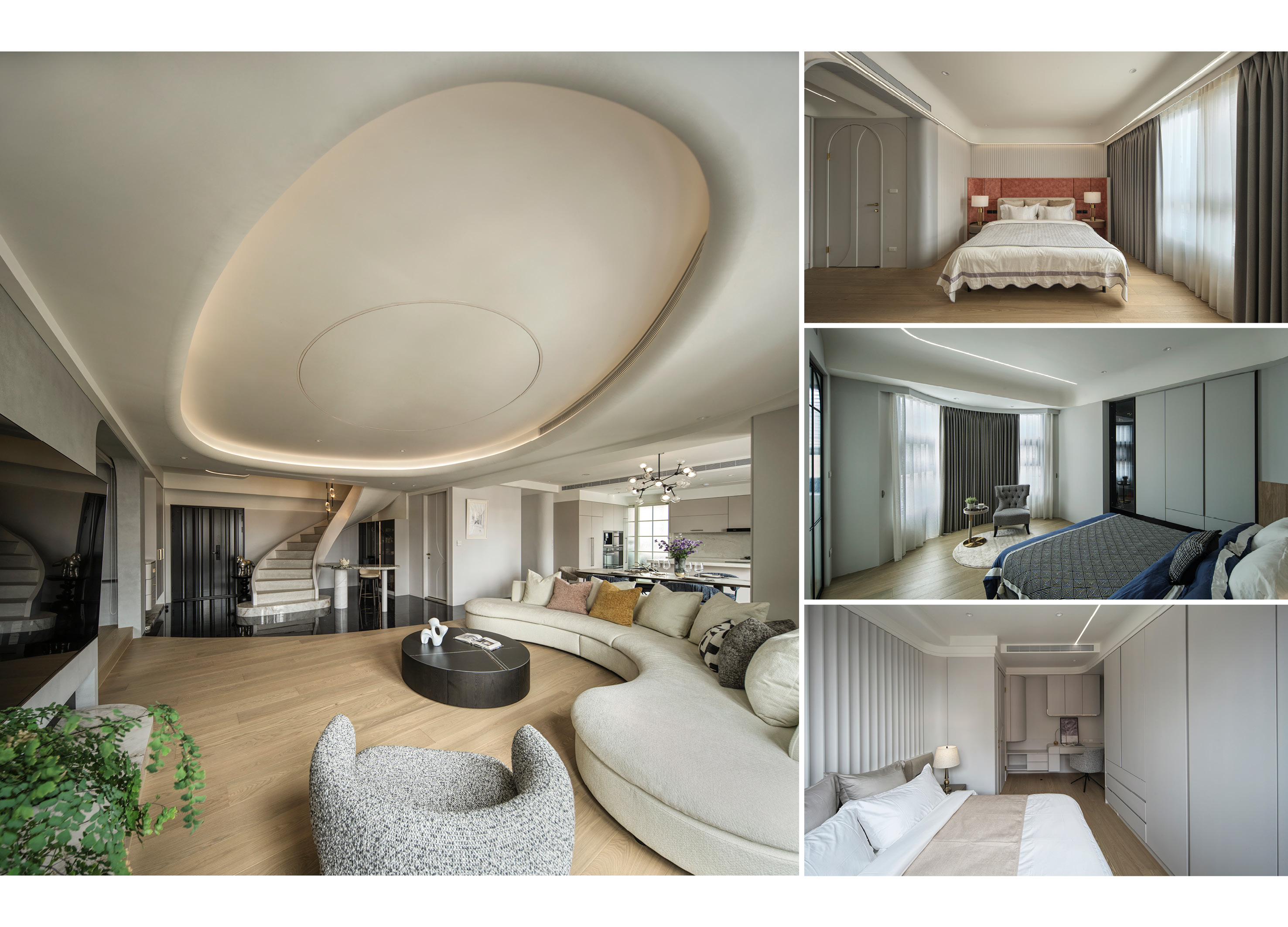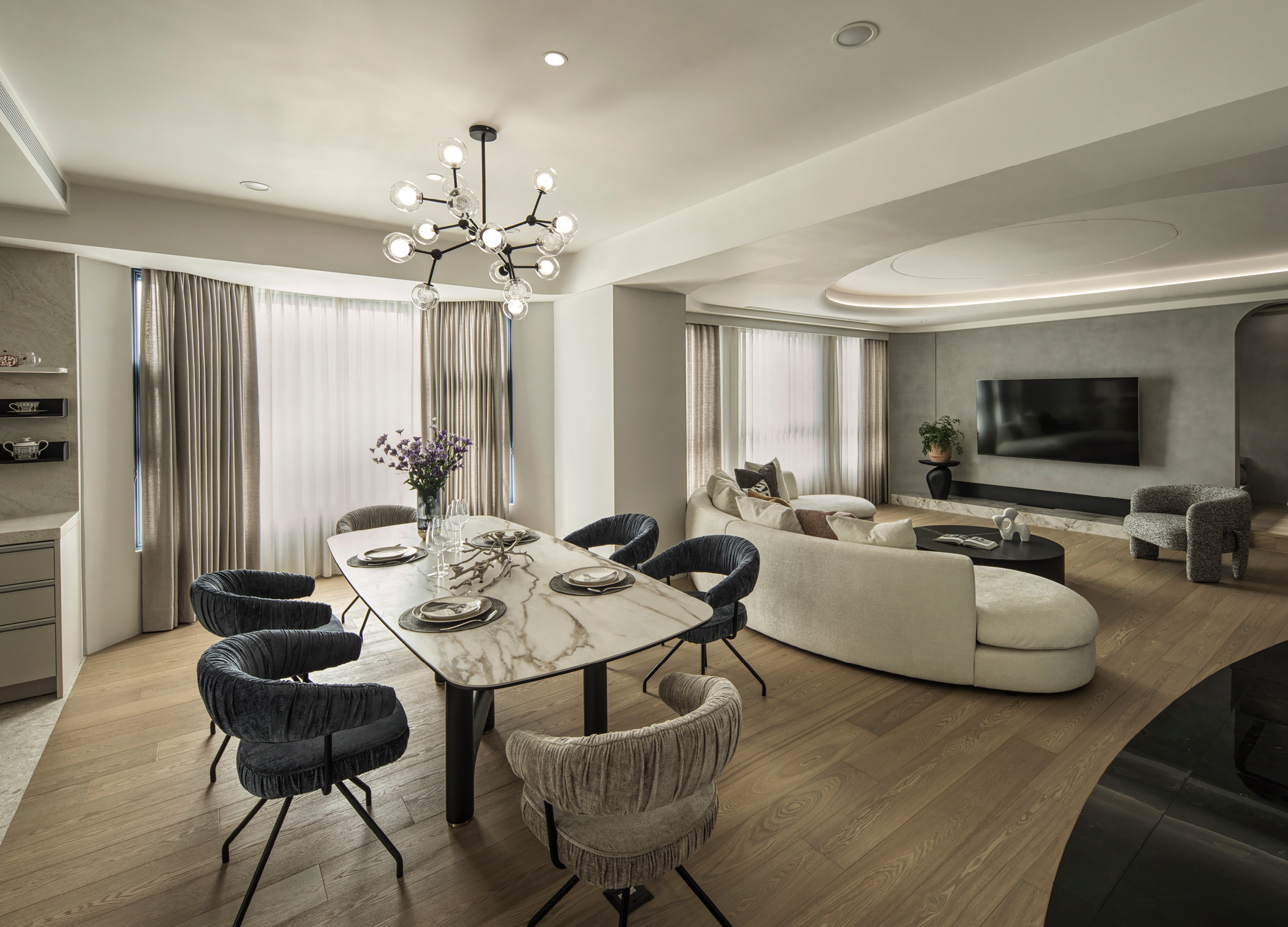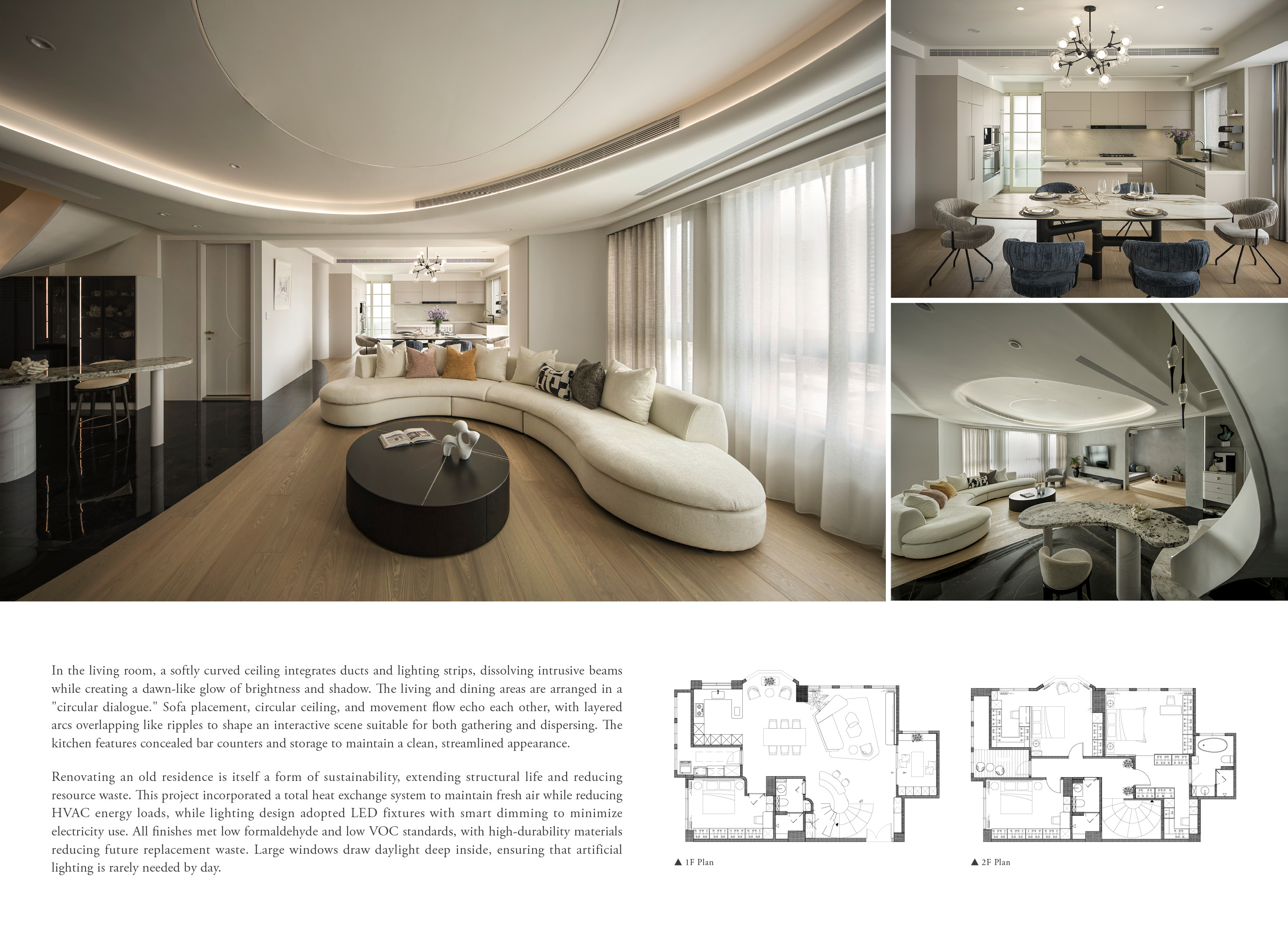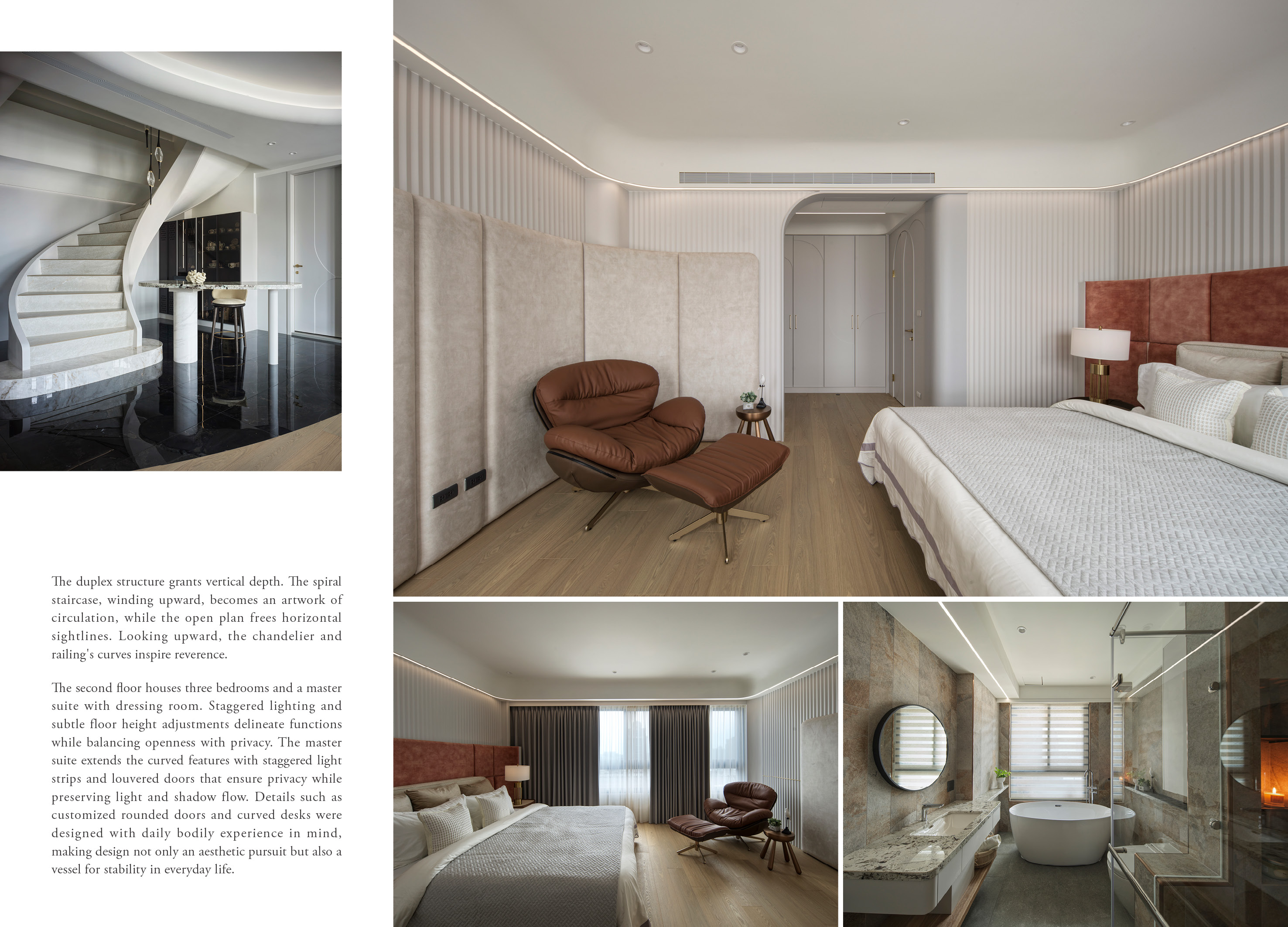 玄關開門即迎見如雲霧般盤旋而上的石材旋梯,與自天井垂落的長吊燈共同構成垂直的「光軸」,形成貫穿空間的視覺核心。樓梯以預鑄鐵件結合實木踏階與曲面包覆,既保留原始弧線的柔美韻味,又增添雕塑般的立體層次感,成為舊宅重生的靈魂。客廳天花採柔弧吊頂設計,整合冷氣管道與燈帶,有效消融原有樑體突兀,營造如晨曦微光般的柔亮氛圍,使光影在空間中流動。客餐區以「環形對話」為構成主題,沙發擺設、圓環天花與行走動線彼此呼應,藉由多層次的弧形重疊,塑造出如漣漪般擴散的空間節奏,營造可聚可散、開放互動的生活場景。廚房採隱藏式吧台與收納設計,保持視覺俐落與空間純淨。二樓主臥延續整體曲面語彙,錯層光帶與格柵門片交織出光影流動的韻律,在私密與通透之間取得平衡。細節處如訂製圓角門片與弧形書桌,皆以日常身體經驗為尺度,使設計不僅止於美學形式,更成為生活中安定、柔和且充滿詩意的載體。