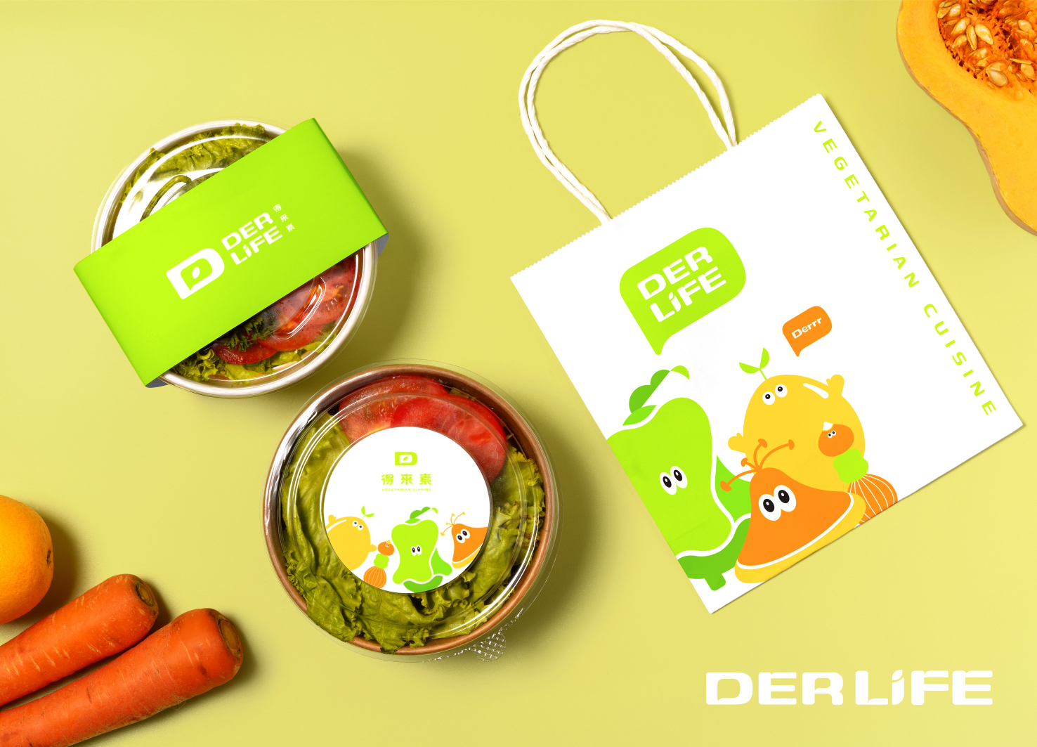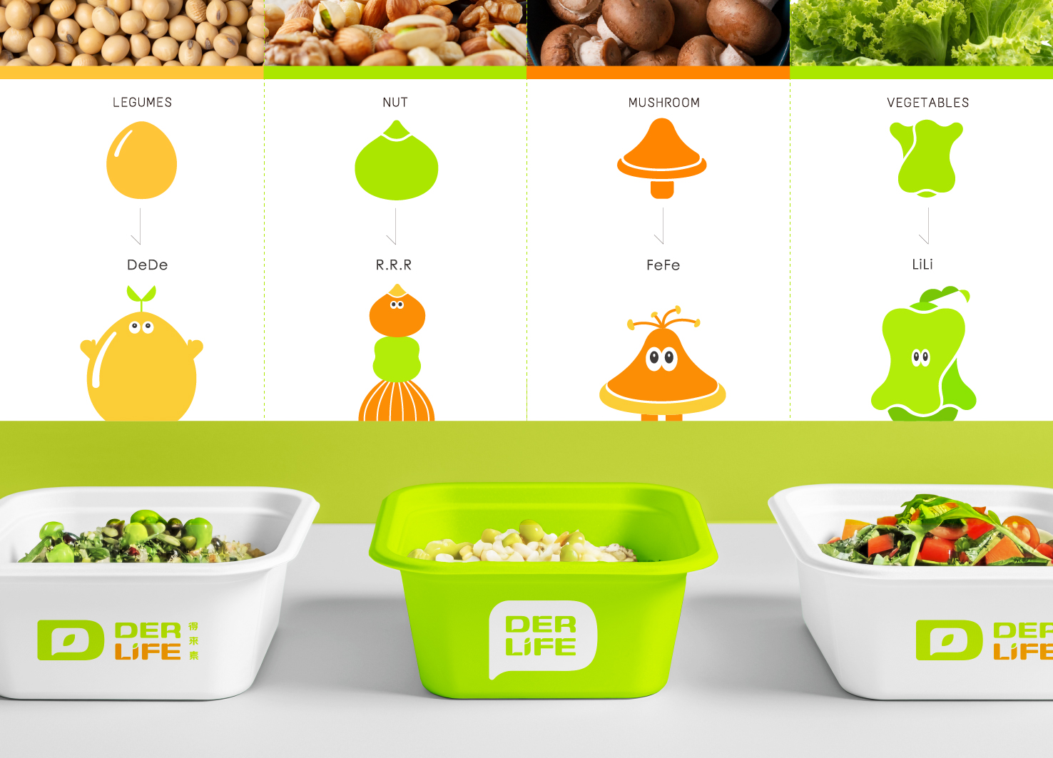 DerLife is a plant-based restaurant brand from Taiwan. Its rebranding draws from “De, Lai, Su” — to gain, to come, to live naturally. The idea shapes its slogan “DerLife, a Better Way to Live,” creating a space where vegetarians and non-vegetarians share good living. The dialogue box becomes a key visual of empathy and inclusion. Four ingredients — beans, greens, mushrooms, and nuts — are transformed into IP characters linking design with daily life. Earthy, plant-inspired tones express Asian warmth and authenticity, turning DerLife into a language of kindness and modern living.