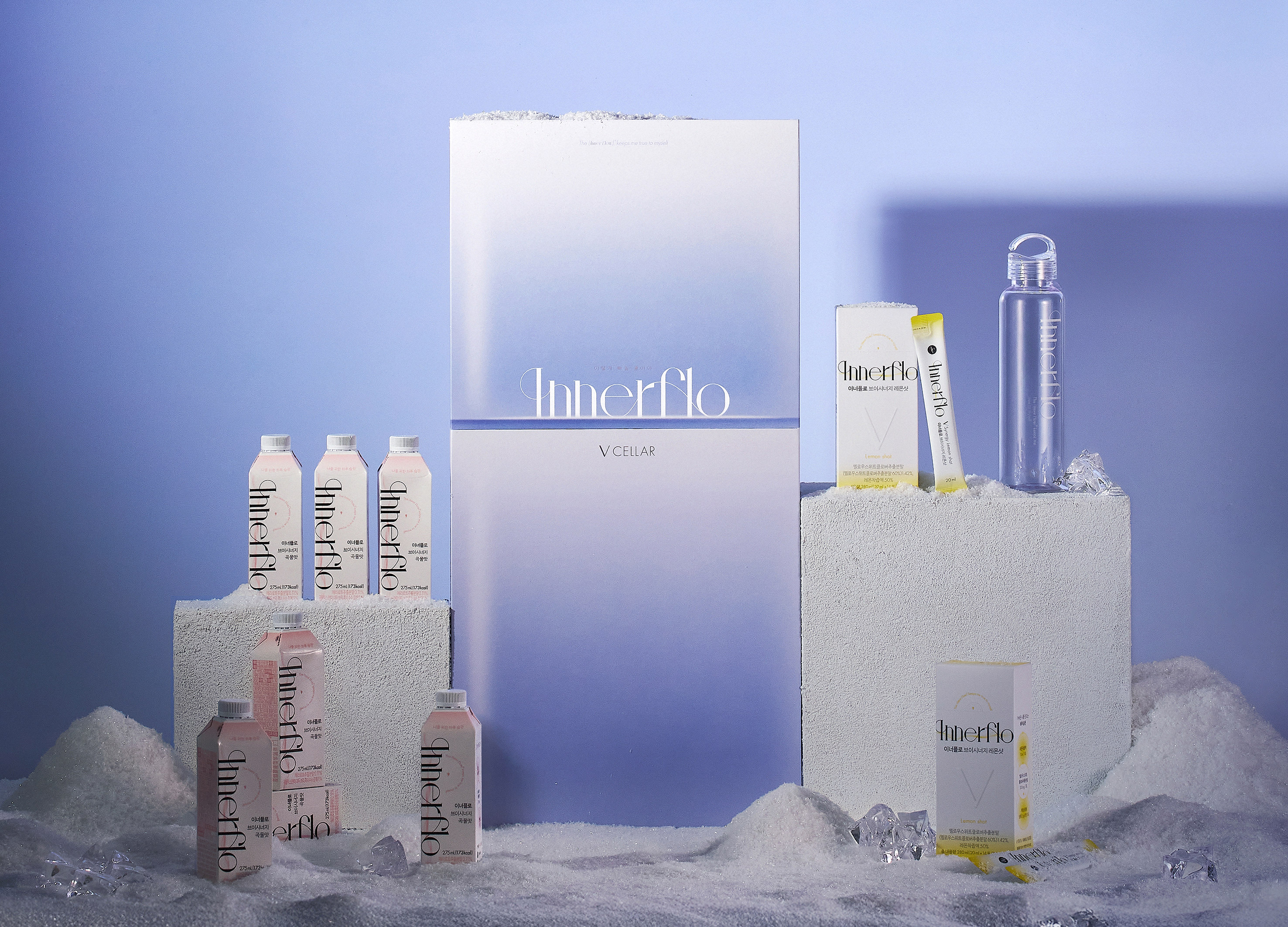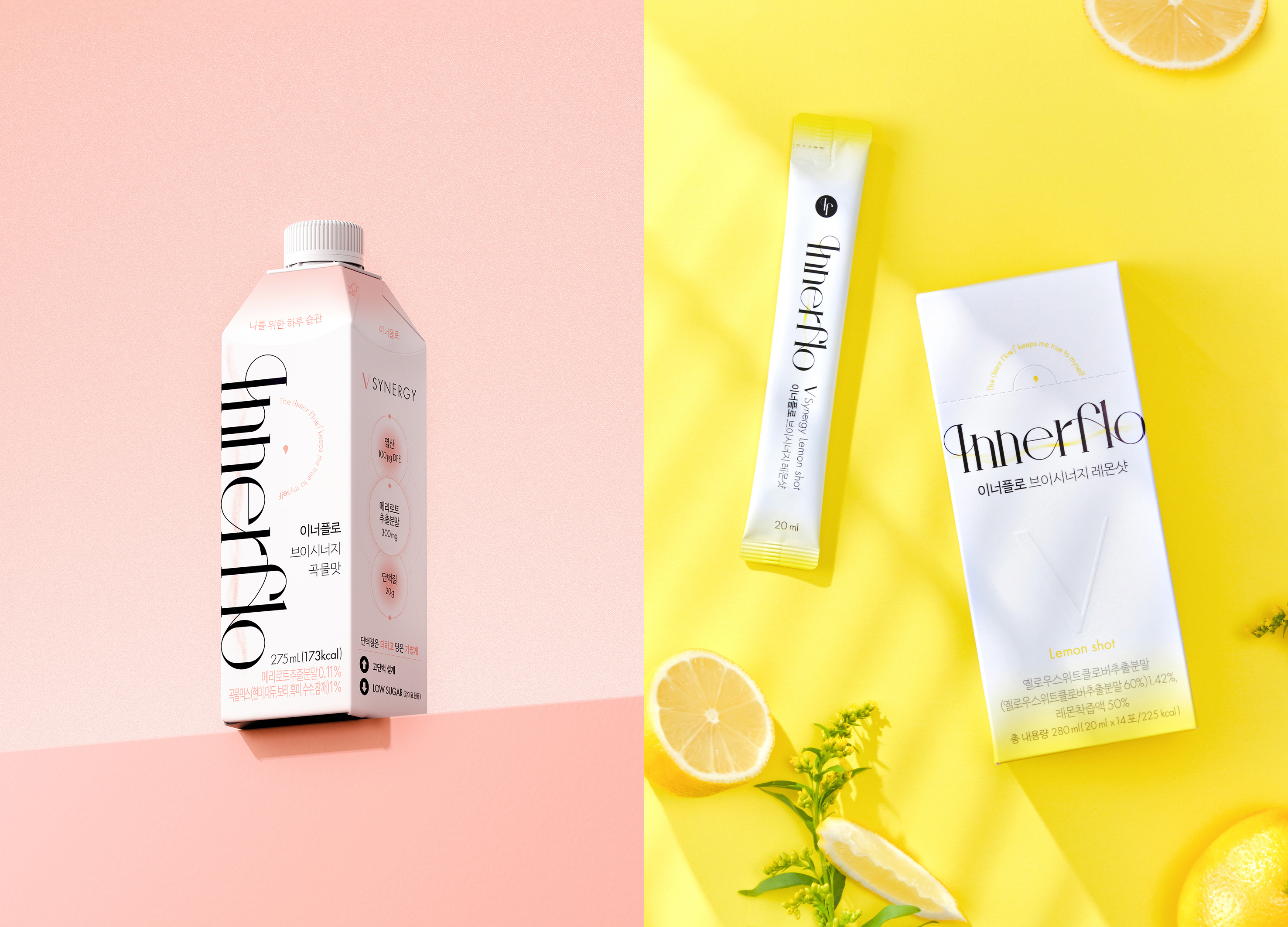 제품 디자인은 로고를 메인 그래픽 요소로 크게 배치해 브랜드 정체성을 명확히 전달합니다. 메인 컬러 블루는 ‘붓기에서 자유로운 가벼움’을 상징하며, 핑크(브이시너지 곡물맛)와 옐로(브이시너지 레몬샷)의 색상 체계는 제품군을 직관적으로 구분합니다.