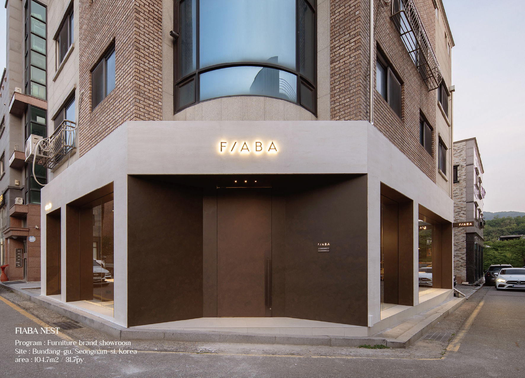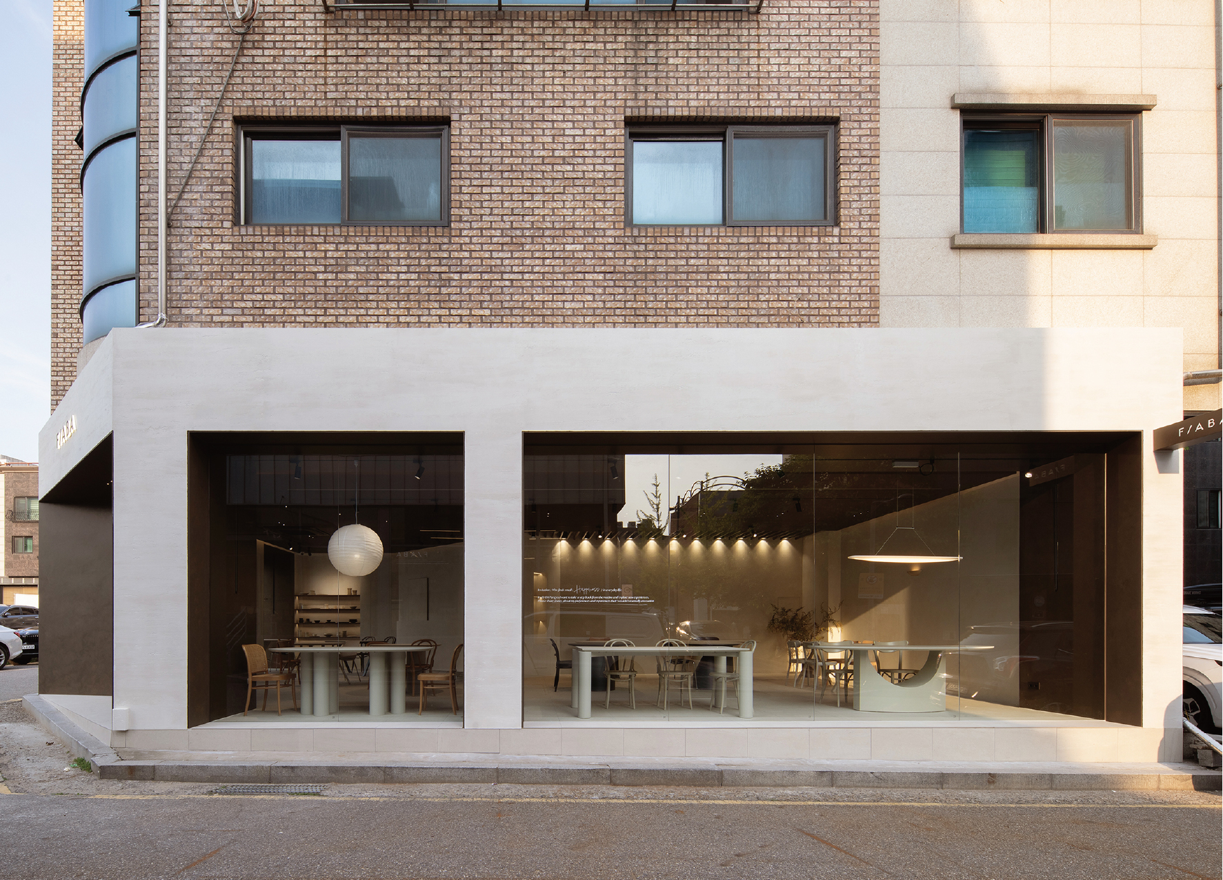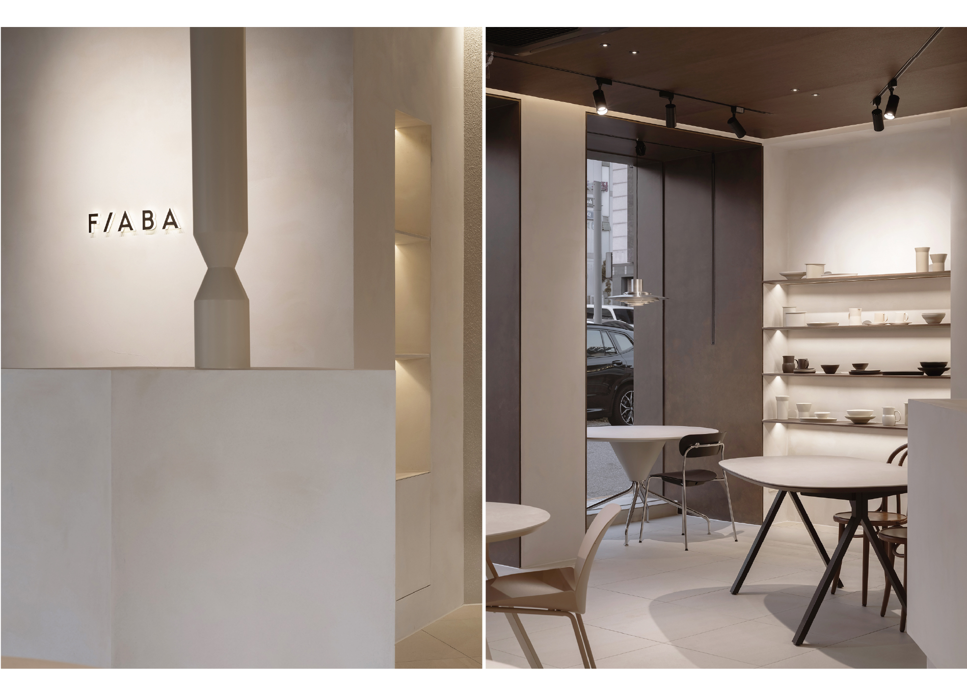 Inspired by a bird’s name, FIABA NEST is designed to express Fiaba’s refined curves and warm elegance. A 3-meter door forms a bold entrance mass, while the façade aligns window frames with existing columns. The large storefront draws natural light by day and diffuses interior light at night. Inside, the counter runs parallel to the angled façade, creating a clear visual axis. Light filtered through wooden louvers softens the boundary between inside and out. Furniture is placed like art pieces, connected through carefully aligned spatial axes and material flow.
