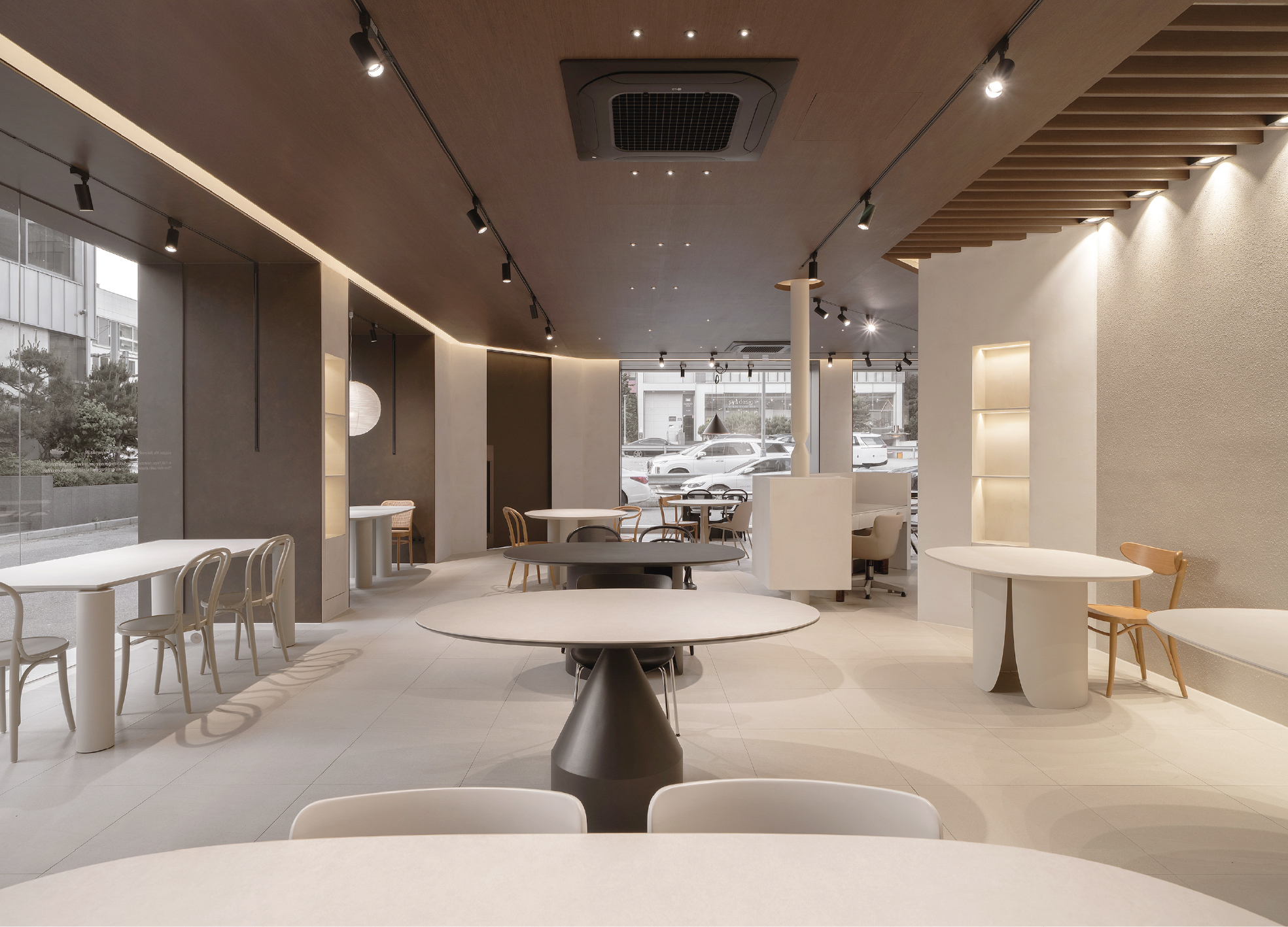 우드 루버와 간접조명이 내외부 경계를 부드럽게 완화하며 낮은 천장고를 시각적으로 확장한다.