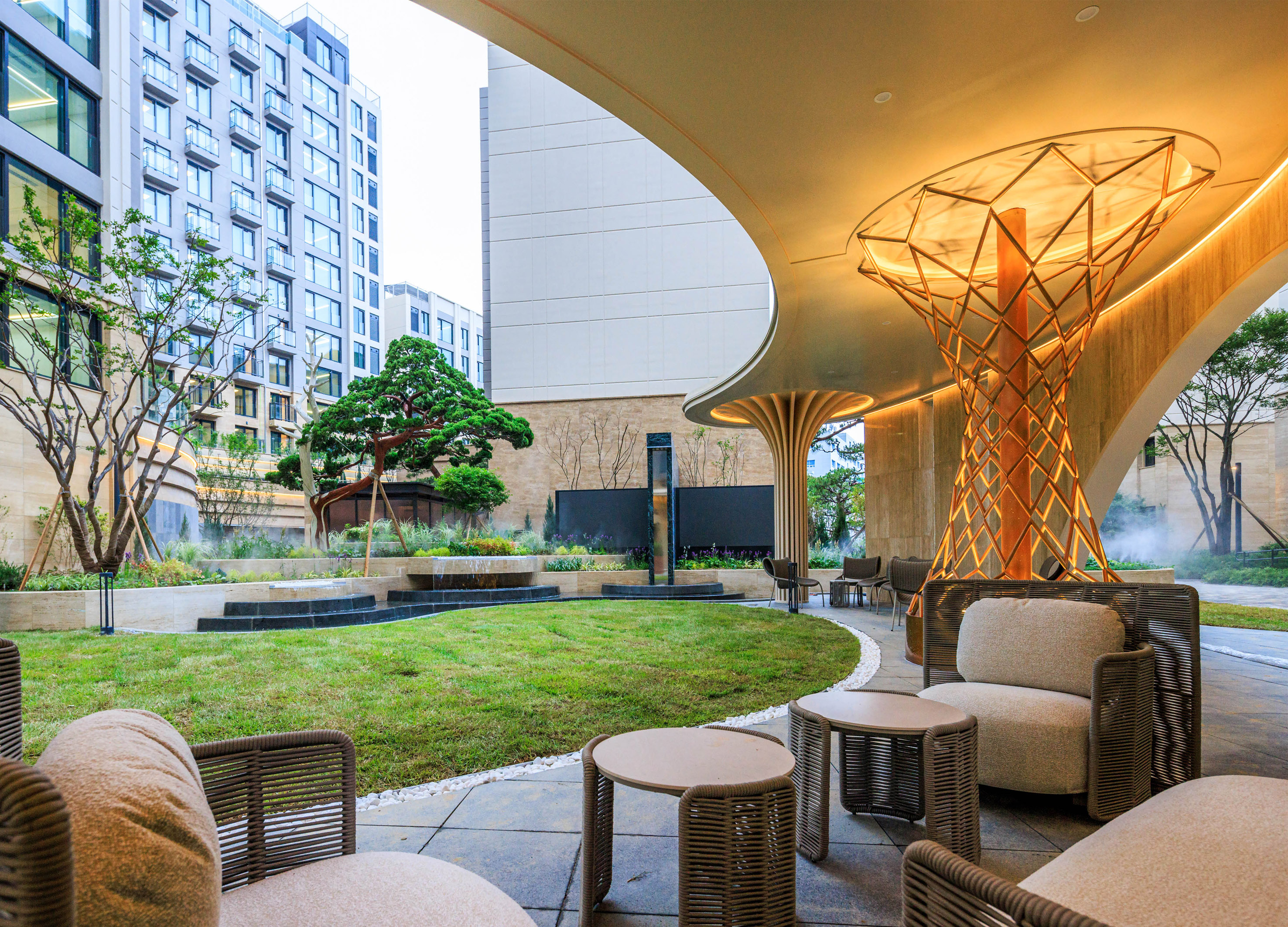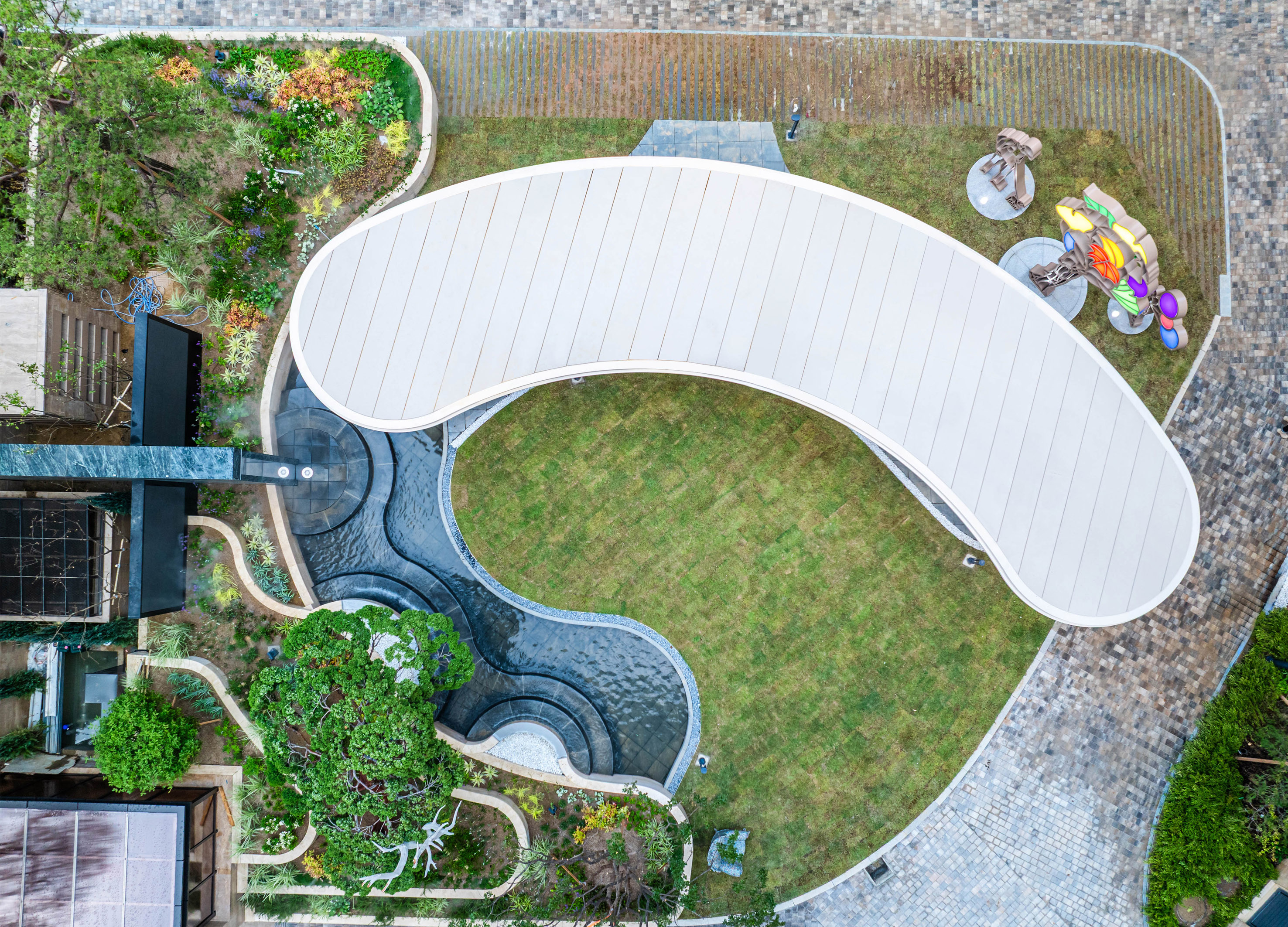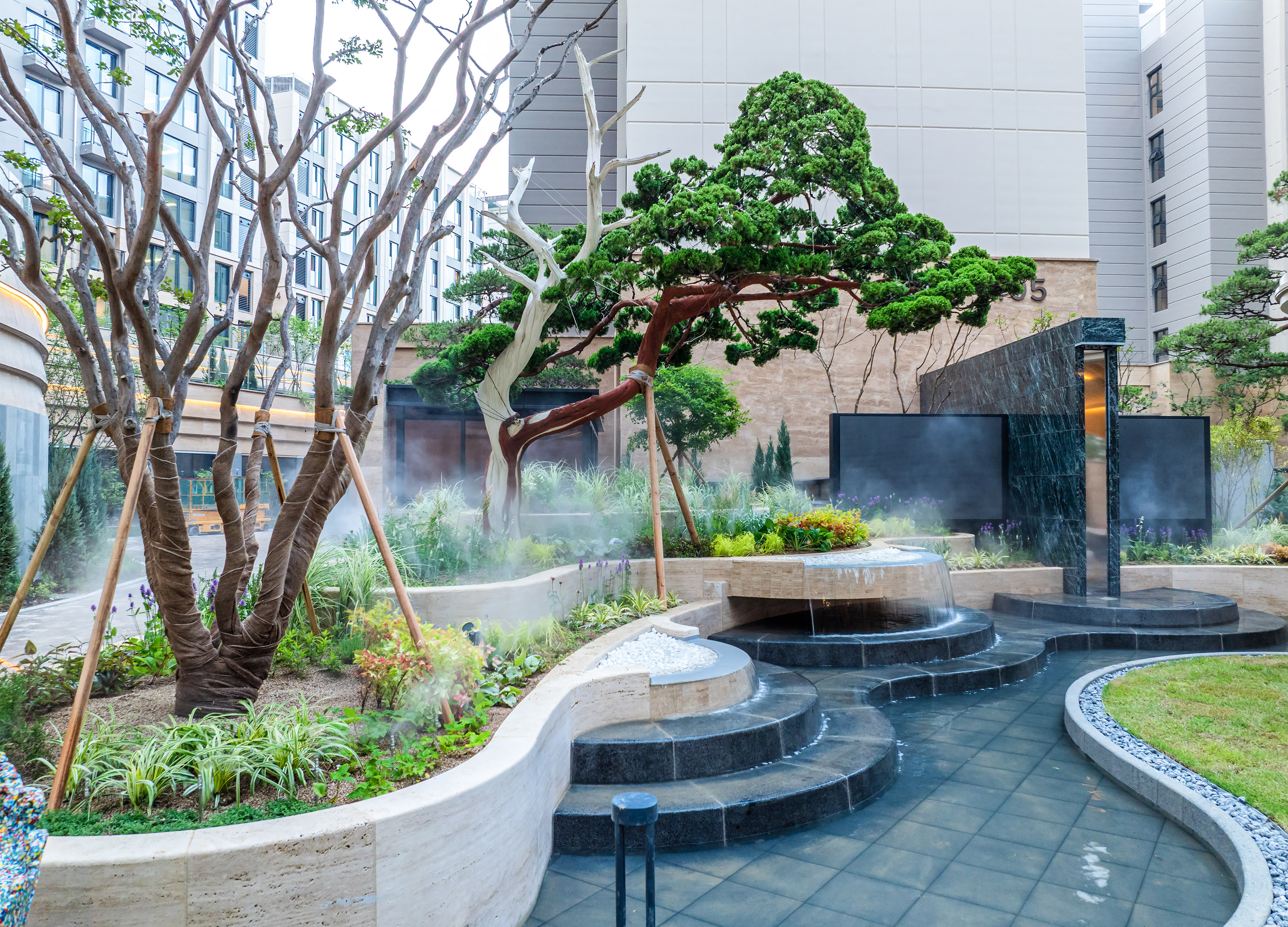 ‘Atelier’ is a centrally located outdoor rest space that offers open views of the pond and surrounding art. Designed with elegant curved lines and a sculptural main pillar, it harmonizes with the landscape while adding artistic value. Featuring juniper trees, artistic installations, and a media façade, it serves as a multifunctional cultural space beyond a typical rest area. At night, linear lighting enhances its sculptural presence, creating a refined and emotional atmosphere. As a cozy yet open retreat, ‘Atelier’ elevates the quality of residential life and represents the future of landscape design.