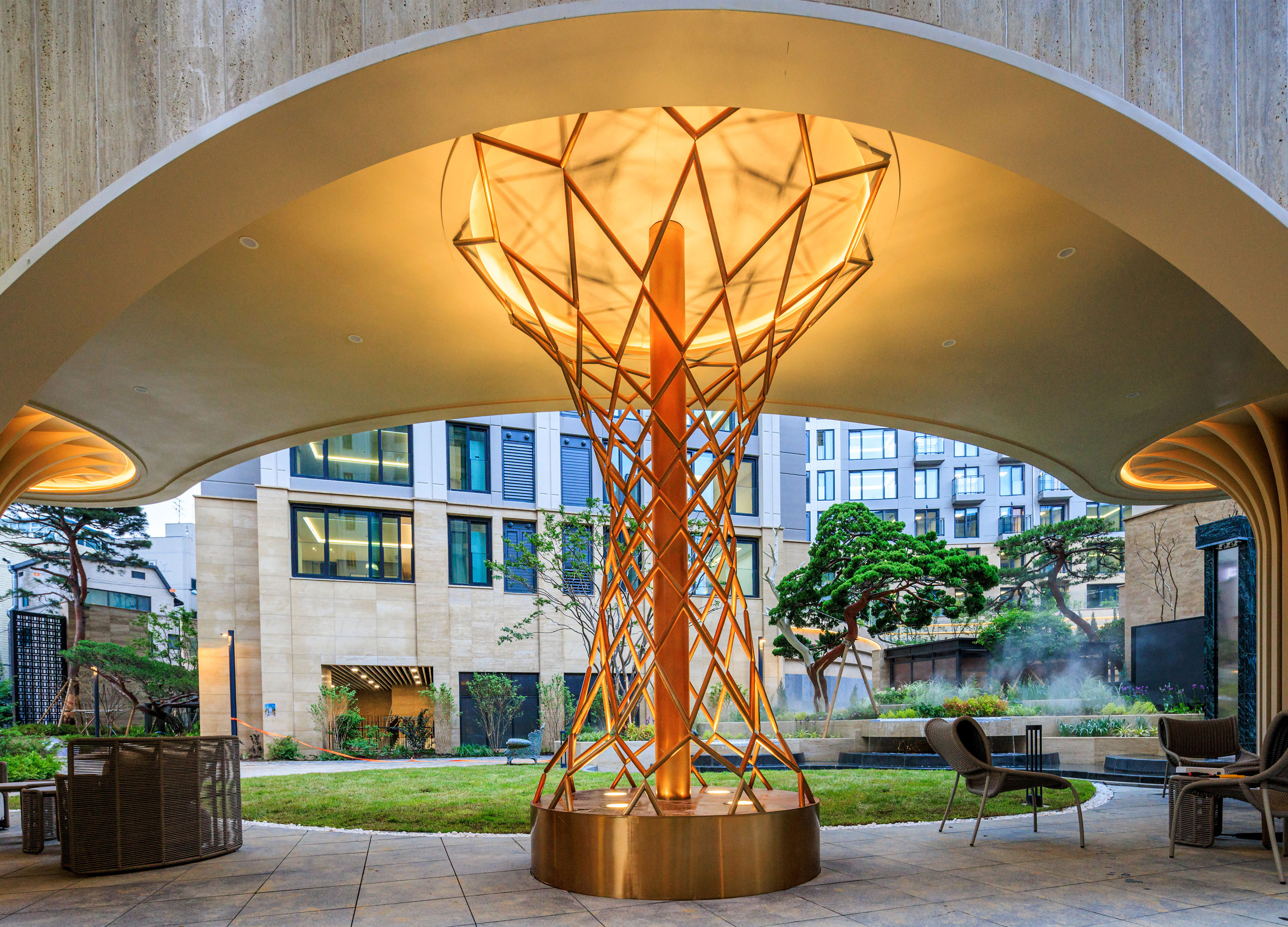‘Atelier’는 단지 내 조경 공간의 중심부에 위치하여, 주변의 폰드와 예술 작품을 조망할 수 있는 탁 트인 개방감을 제공합니다. 디자인 측면에서는 유려하고 고급스러운 곡선 라인을 활용하여 주변 조경과 자연스럽게 어우러지도록 구성하였으며, 조형미가 강조된 메인 기둥을 통해 예술적인 가치를 지닌 휴게 공간으로 완성되었습니다. 향나무와 예술 조형물이 함께 배치되어 특별한 감성을 더하며, 이용자들에게 감각적인 휴식 경험을 제공합니다. 또한, 미디어 파사드를 도입하여 단순한 휴게공간을 넘어 갤러리 기능까지 갖춘 복합문화공간으로 활용이 가능하며, 수경 공간과 함께 어우러져 예술성과 기능성을 모두 만족시키는 공간으로 구현되었습니다. 야간에는 라인 조명을 통해 세련되고 고급스러운 분위기를 연출하며, 조형적 요소가 야경 속 예술 오브제로 작용해 더욱 풍부한 감동을 선사합니다. 외부 공간임에도 불구하고 아늑함을 갖춘 ‘Atelier’는 조경을 감상하며 쉴 수 있는 휴식처로, 단지 내 생활의 질을 한층 높여주는 공간입니다. 향후 조경 분야에서의 ‘Atelier’는 휴게공간을 넘어서는 다양한 가능성을 제시하며, 주거공간의 가치를 높이는 상징적인 장소로 자리매김할 것입니다.