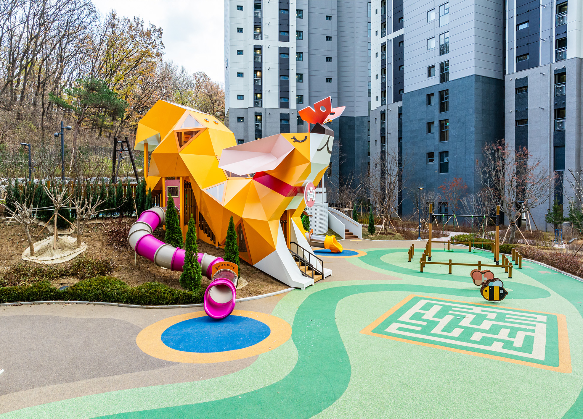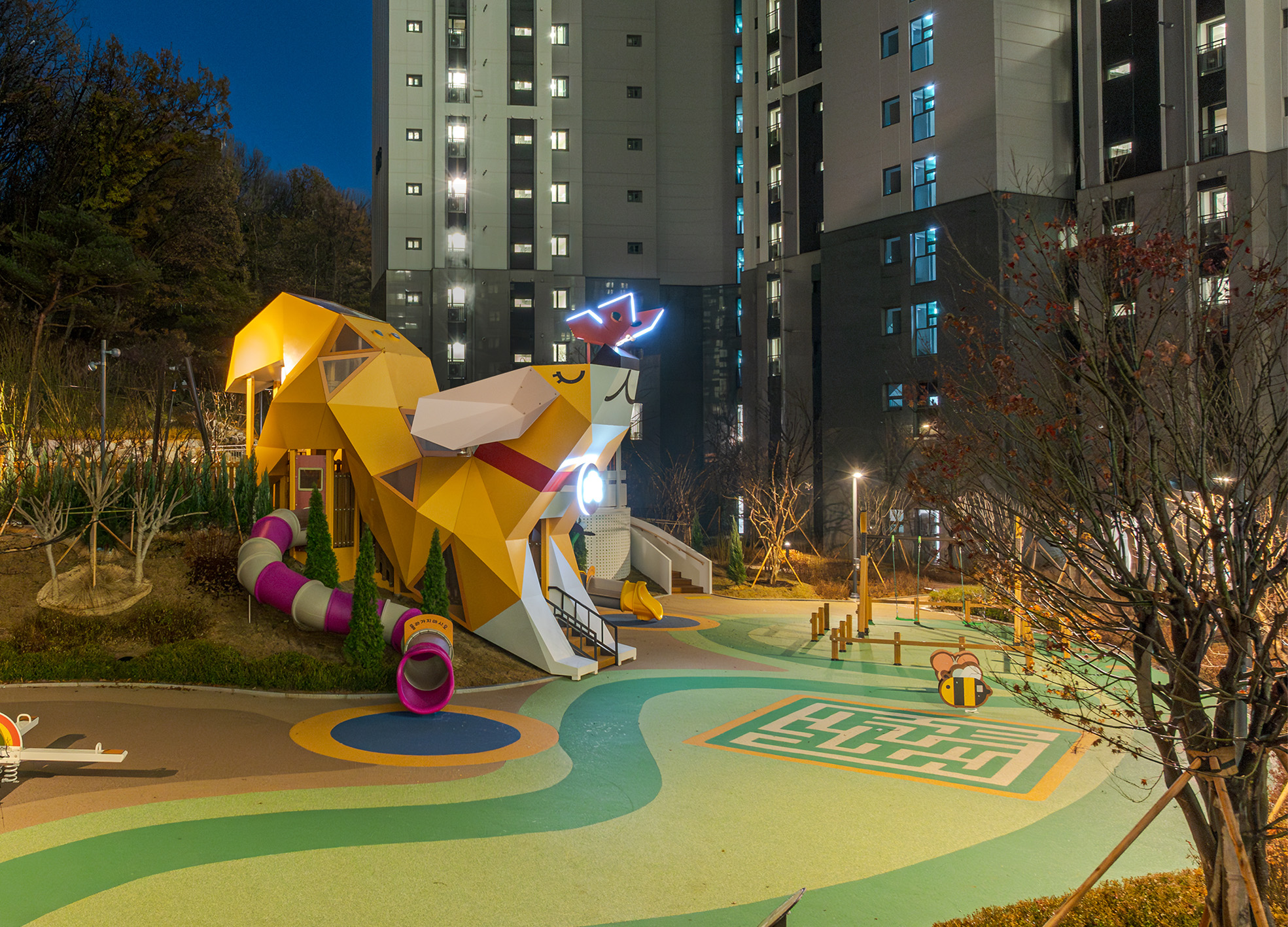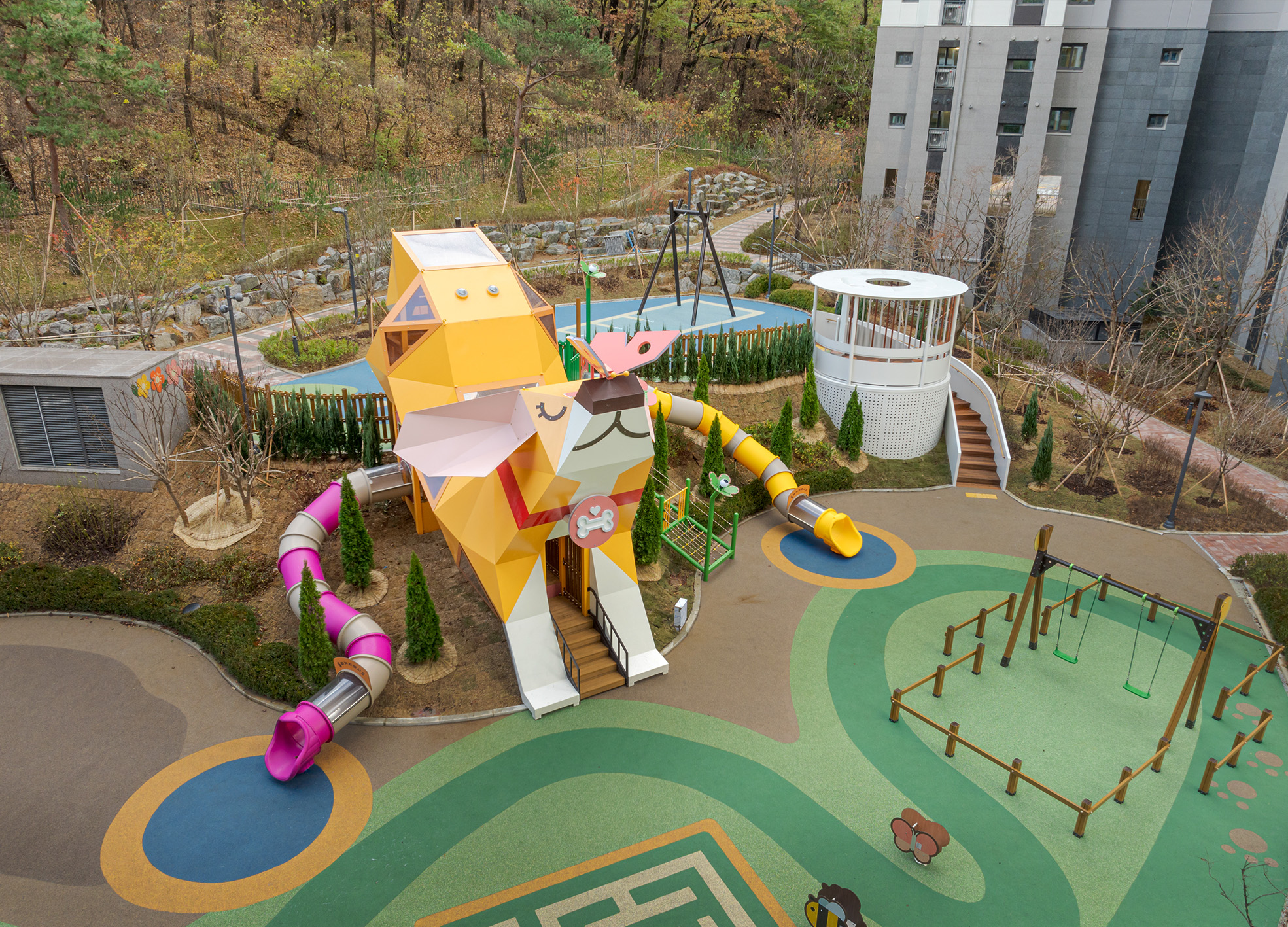 This playground transforms sloped terrain into a core design asset beyond flat playgrounds. Natural level changes reshape underused slopes into safe, dynamic play spaces that encourage active movement. Integrated slides and net structures support motor skill development. A 26-foot sculptural landmark, inspired by a Welsh Corgi running downhill and expressed through an origami-like form, defines the playground’s identity. Fully compliant with South Korea’s strict safety standards, the project demonstrates how terrain-based play can remain innovative while strengthening visual impact and community character.